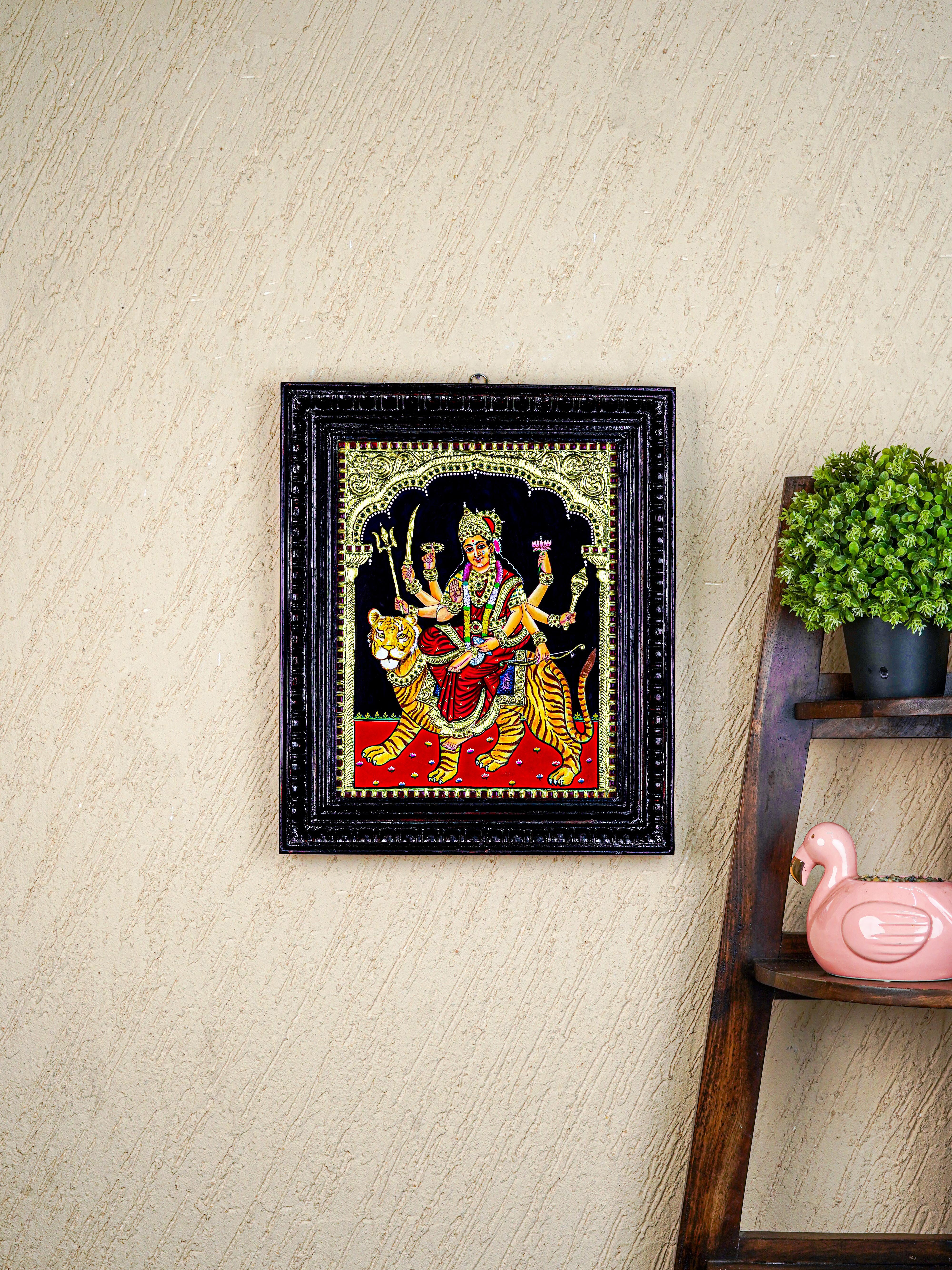 - Here is a beautiful Tanjore painting that features Goddess Durga beautifully hand painted.