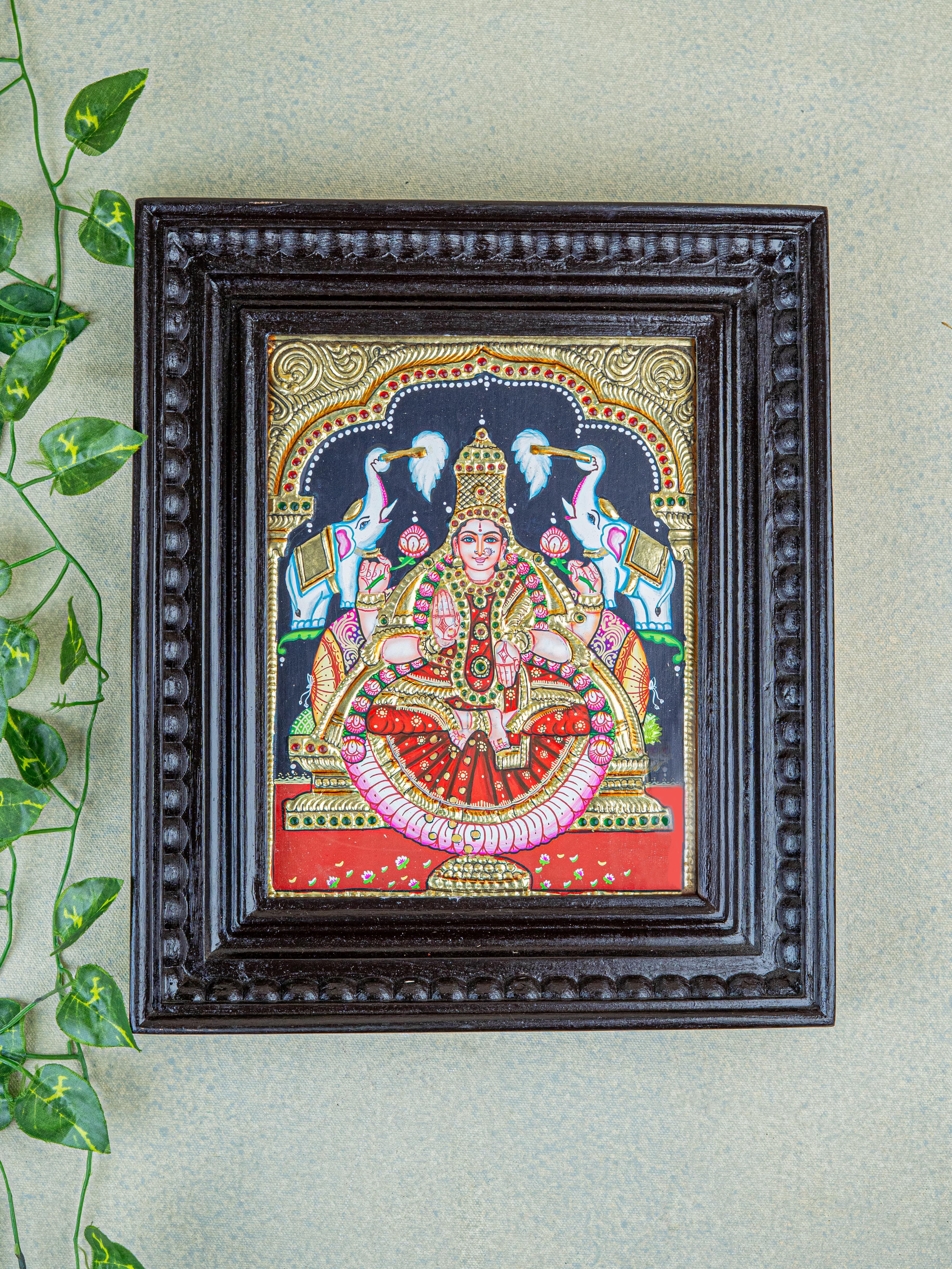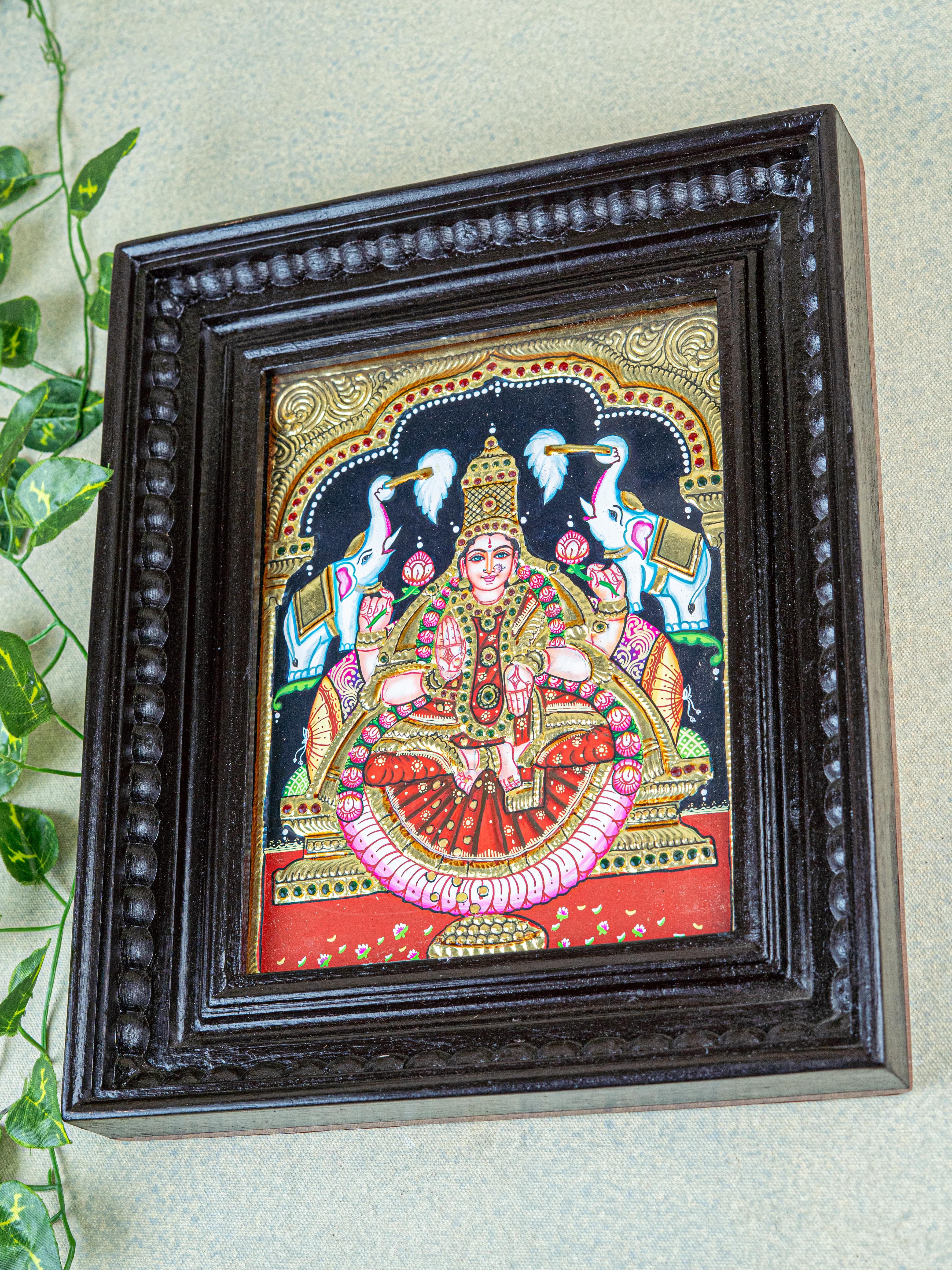 - Here is a beautiful Tanjore painting that features Goddess Gajalakshmi, beautifully hand painted.