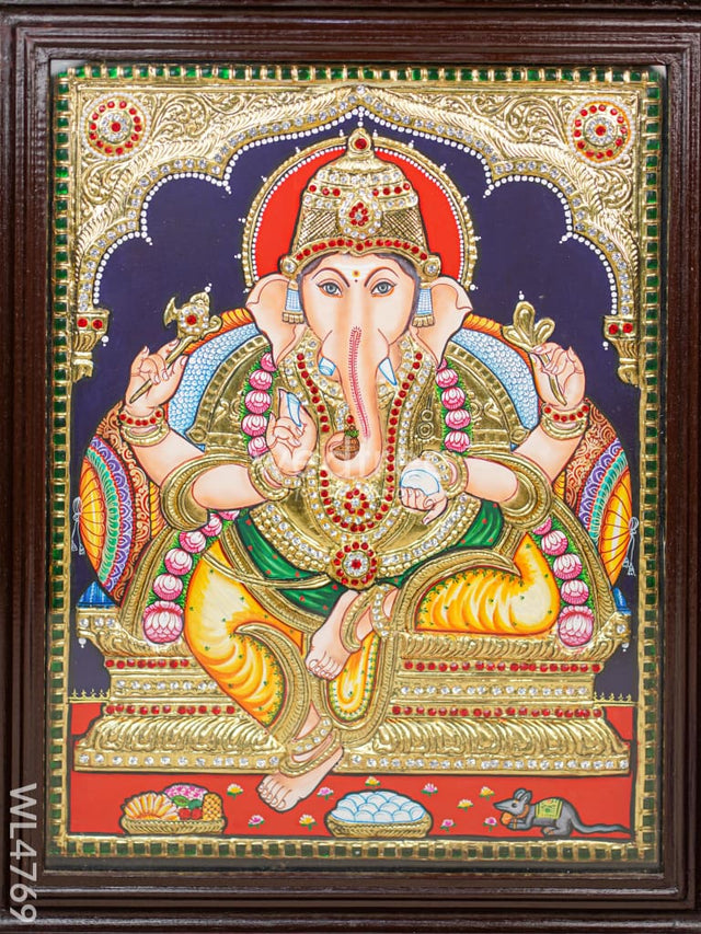 - Tanjore Painting of Lord Ganesha is a Masterpiece of Traditional South Indian art, featuring Semi-Embossed Details and Vibrant Colors.