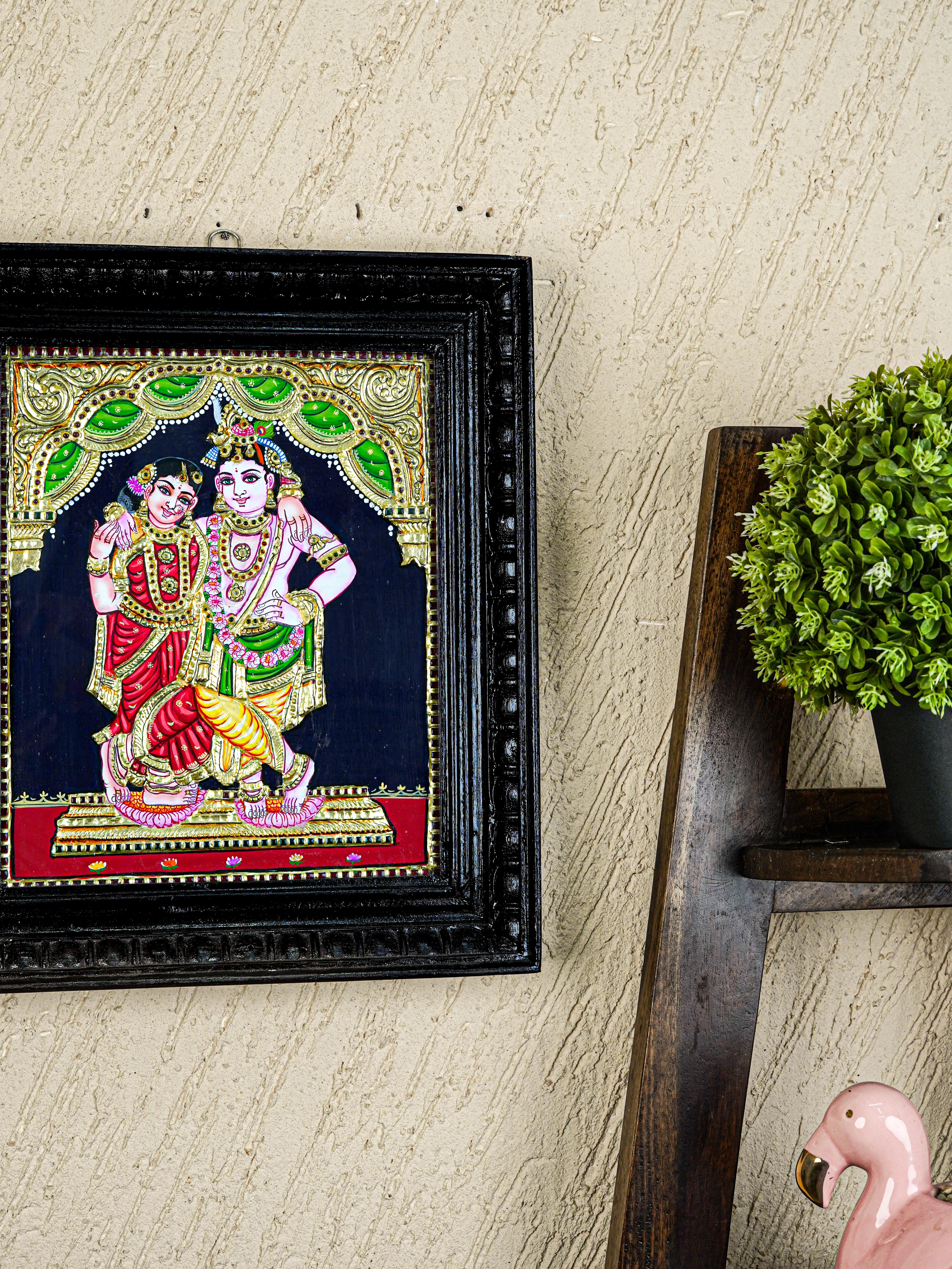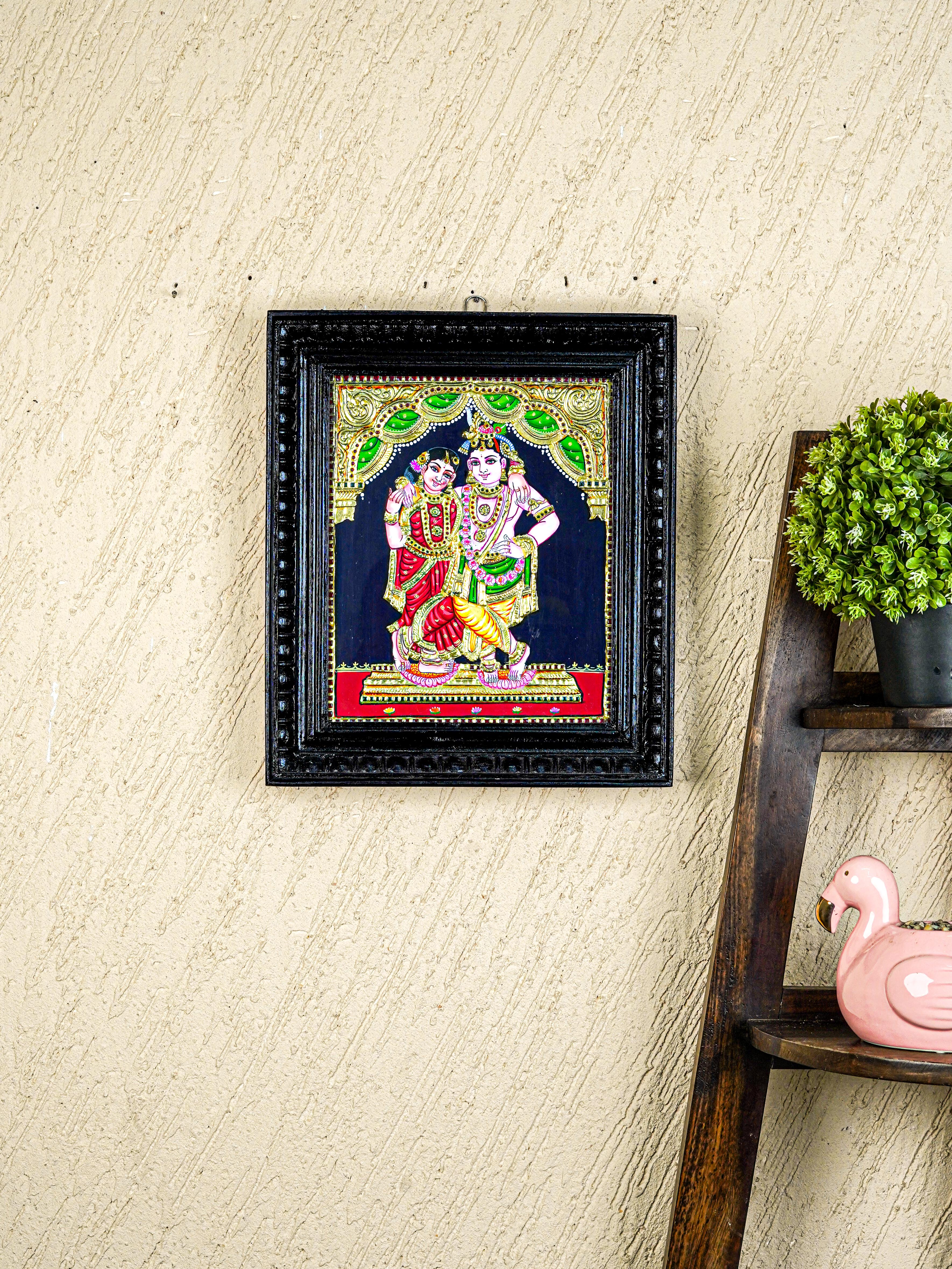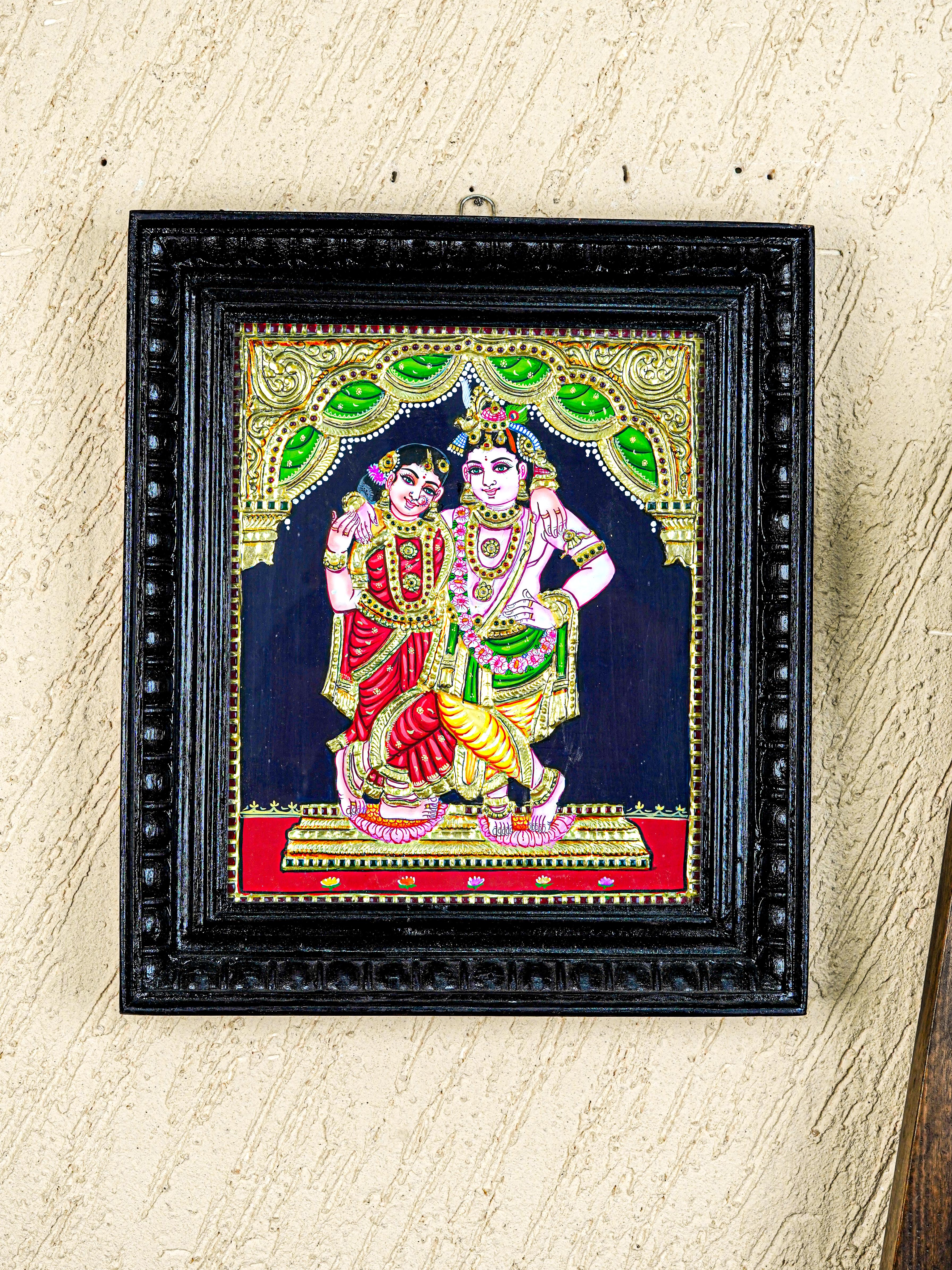 - This Exquisite Tanjore Painting Features Lord Krishna and Radha, Portrayed in a Classic and Affectionate Stance.