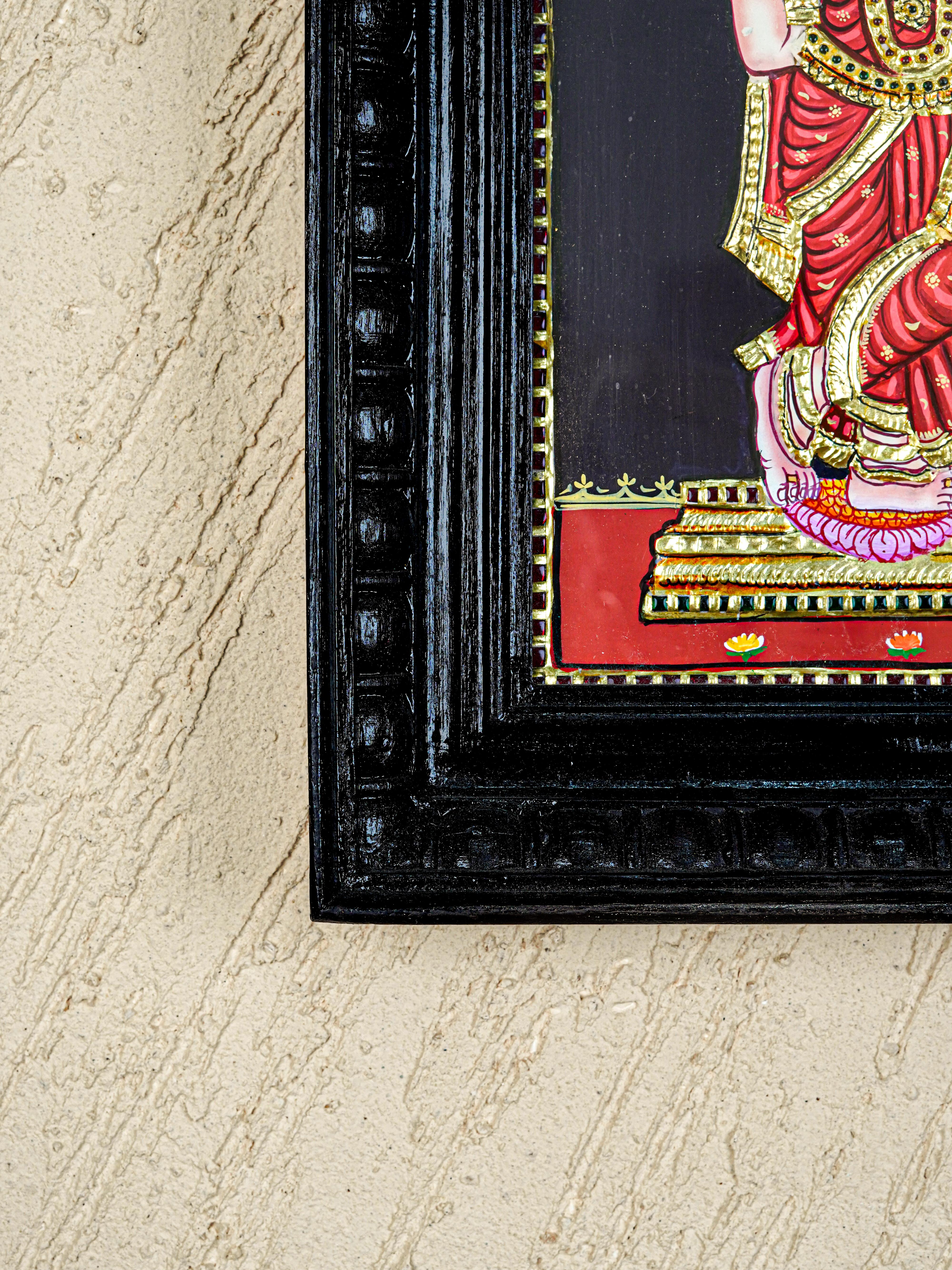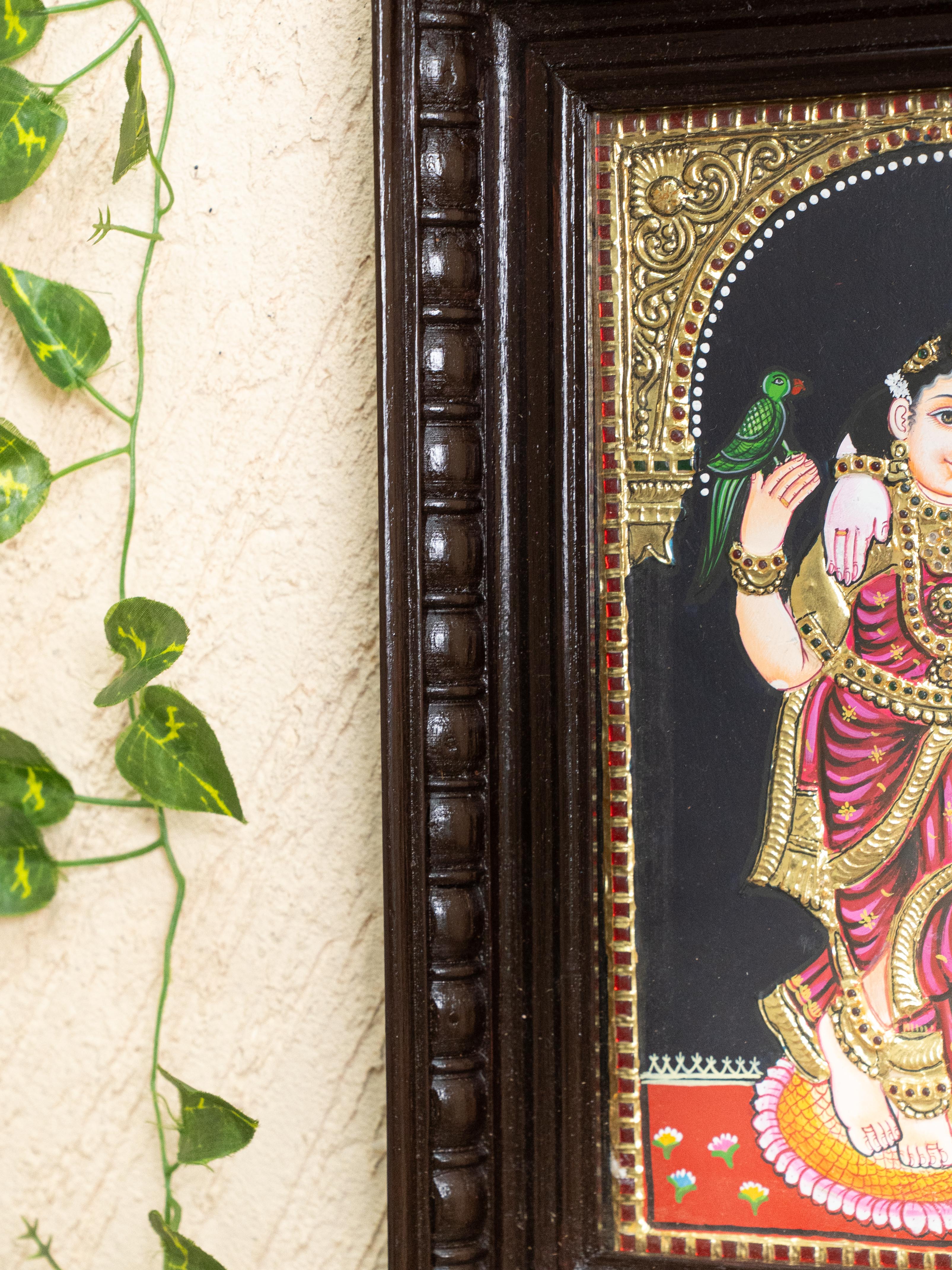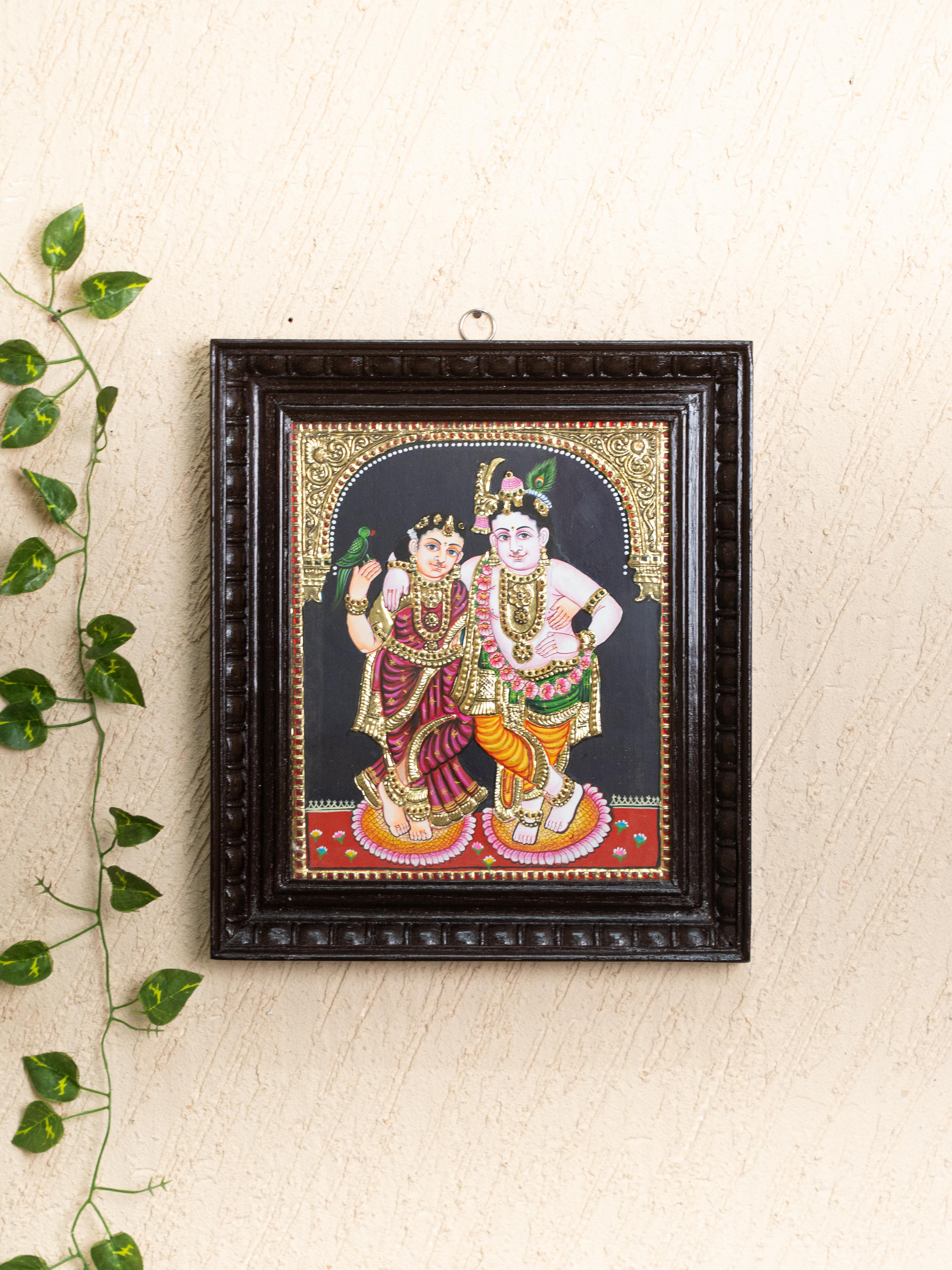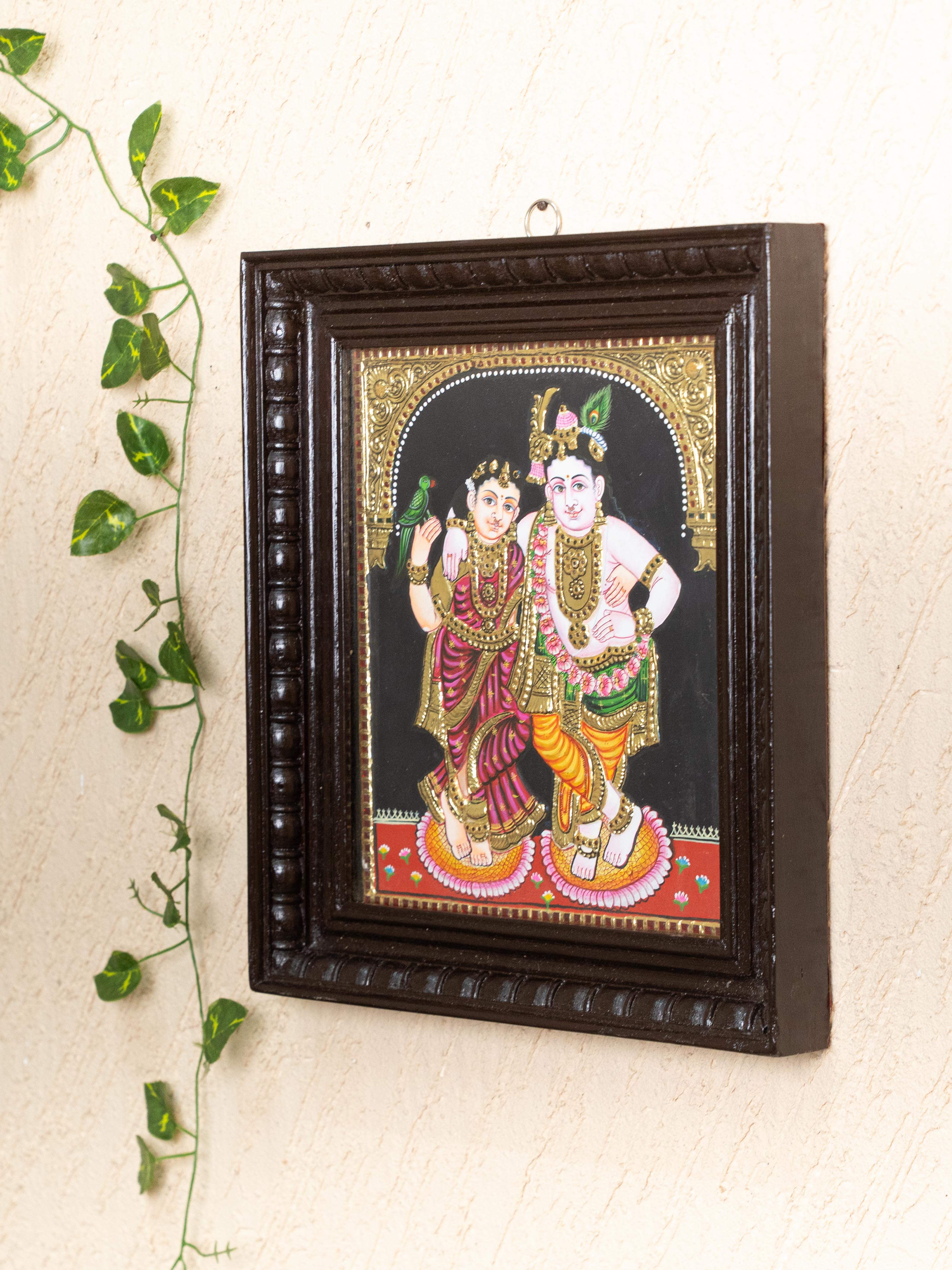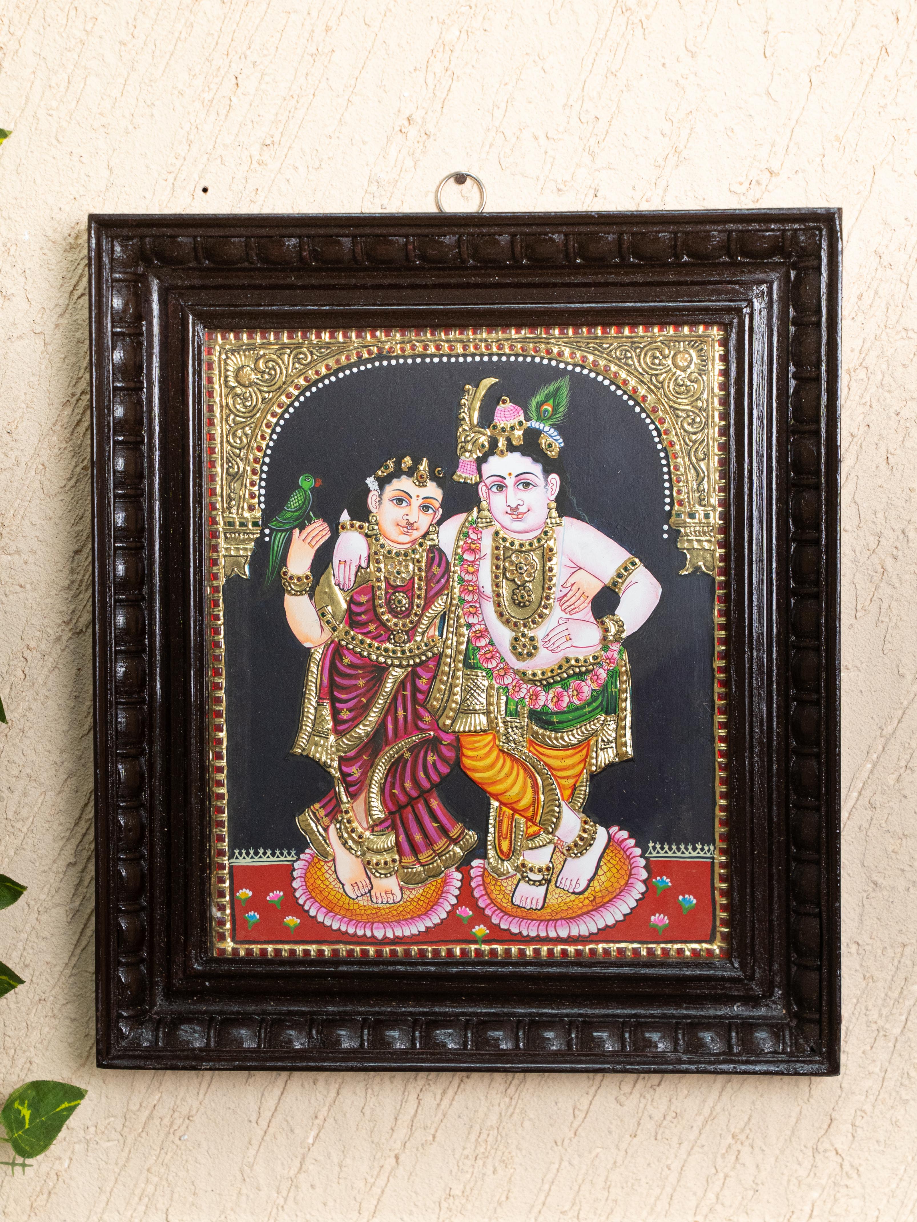 - Krishna, Adorned with a Peacock Feather Crown, and Radha, with a Parrot Perched on her Hand, are richly decorated with Vibrant Garments and Intricate Gold Foil work, Characteristic of Tanjore Art.