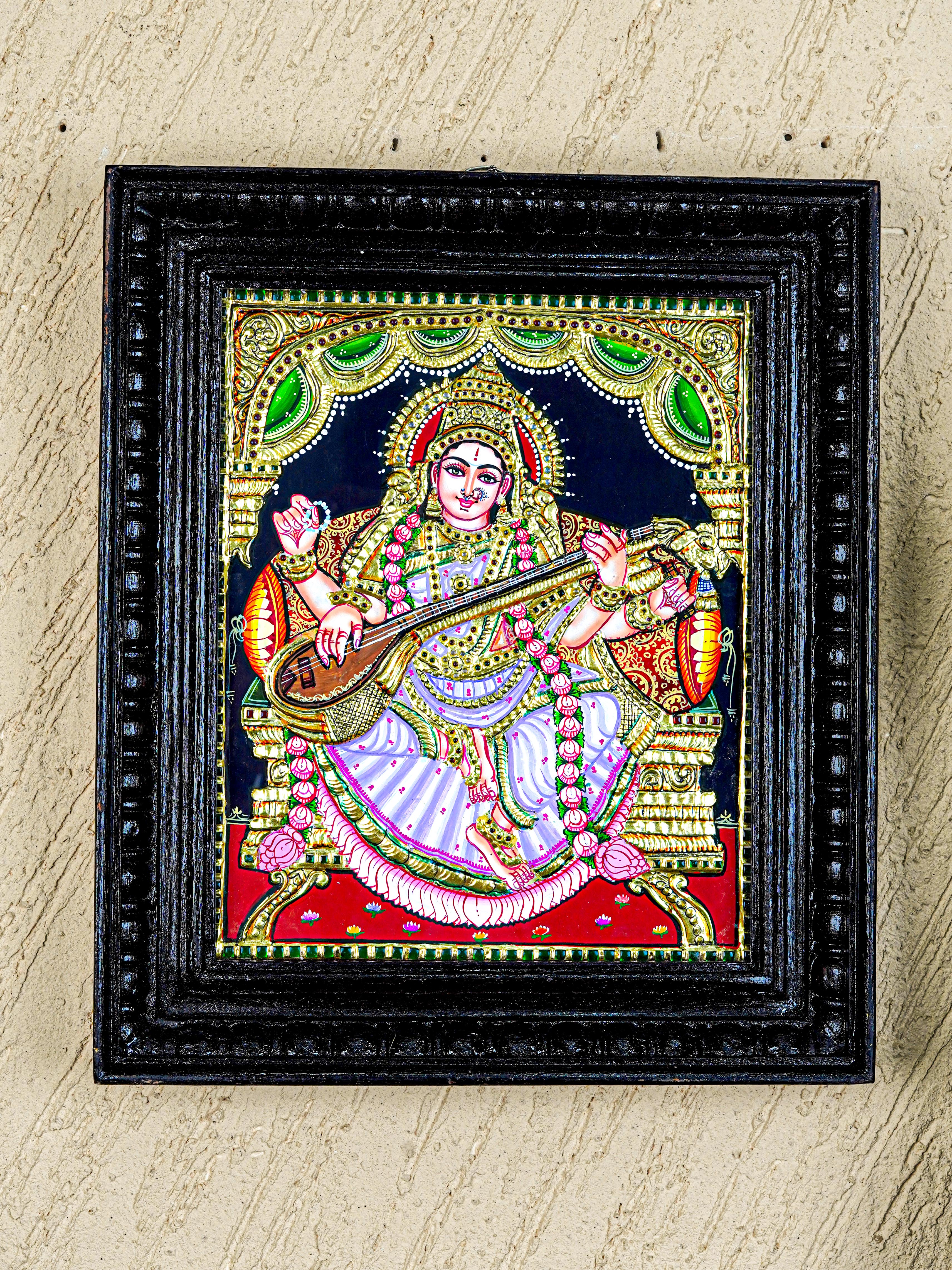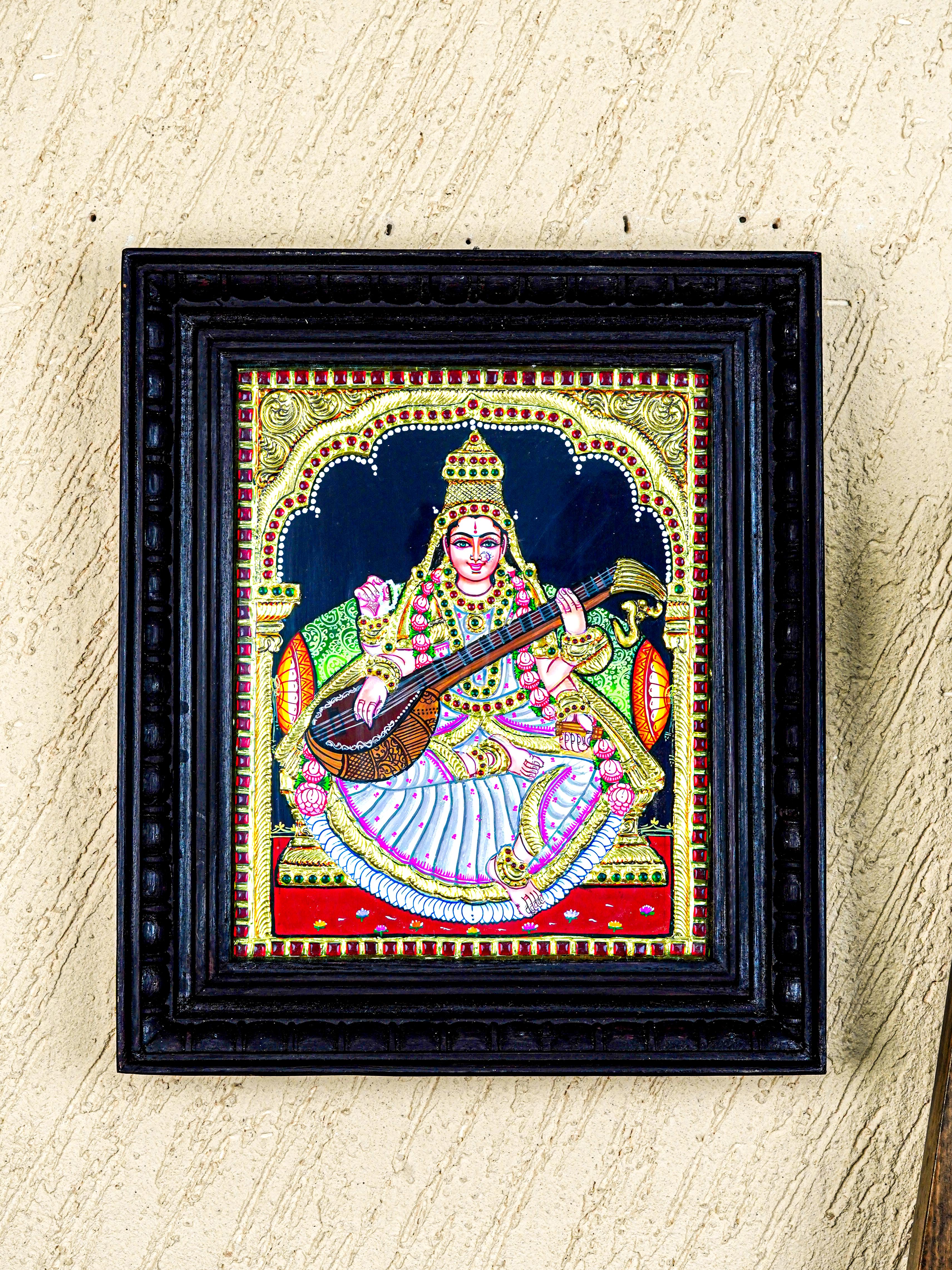 - Here's the authentic painting of Goddess Saraswathi seated, playing her veena.