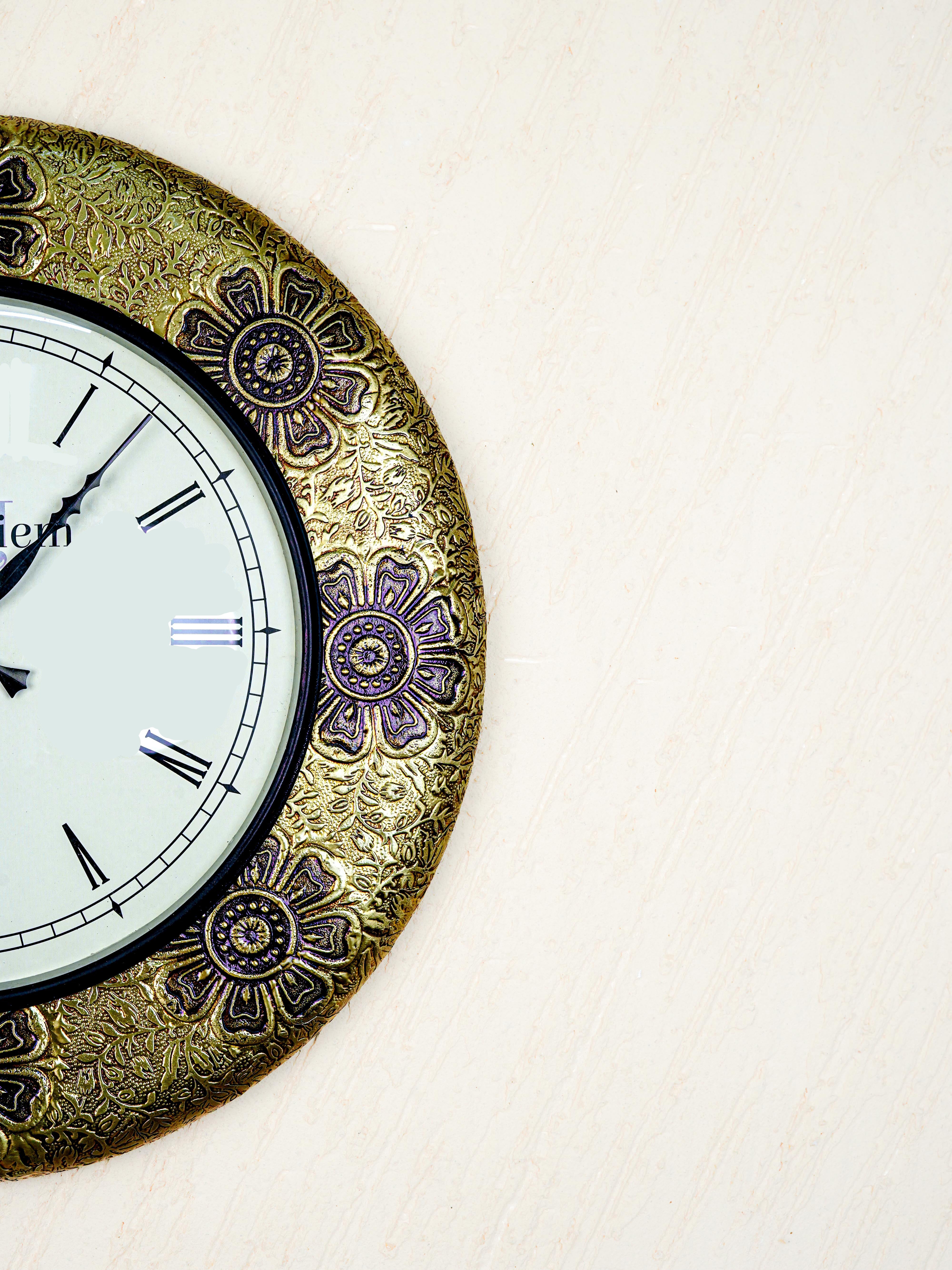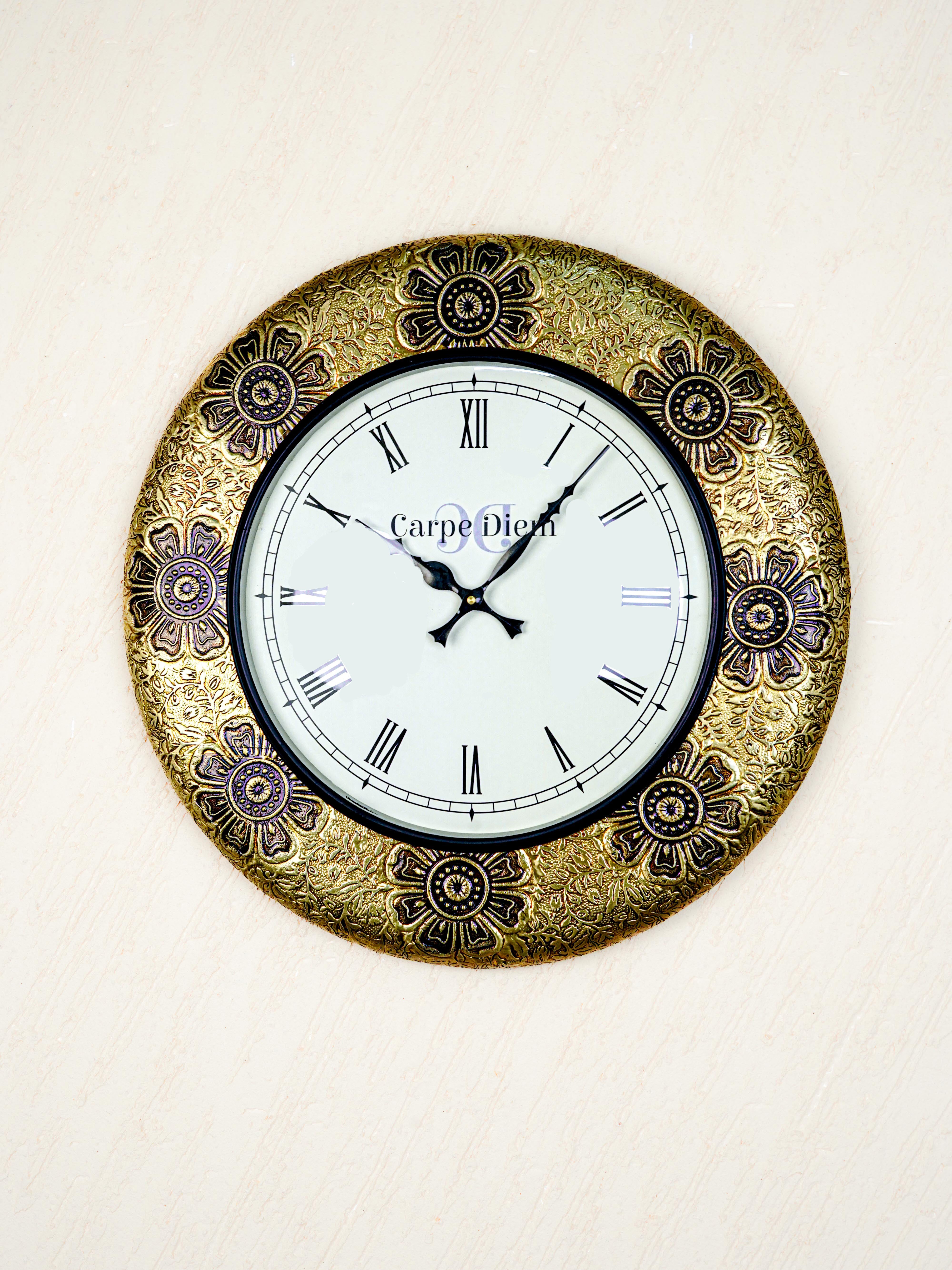 Elevate your Interiors with this Elegant 18-inch Brass Wall Clock, exquisitely Crafted with Embossed Floral Motifs.