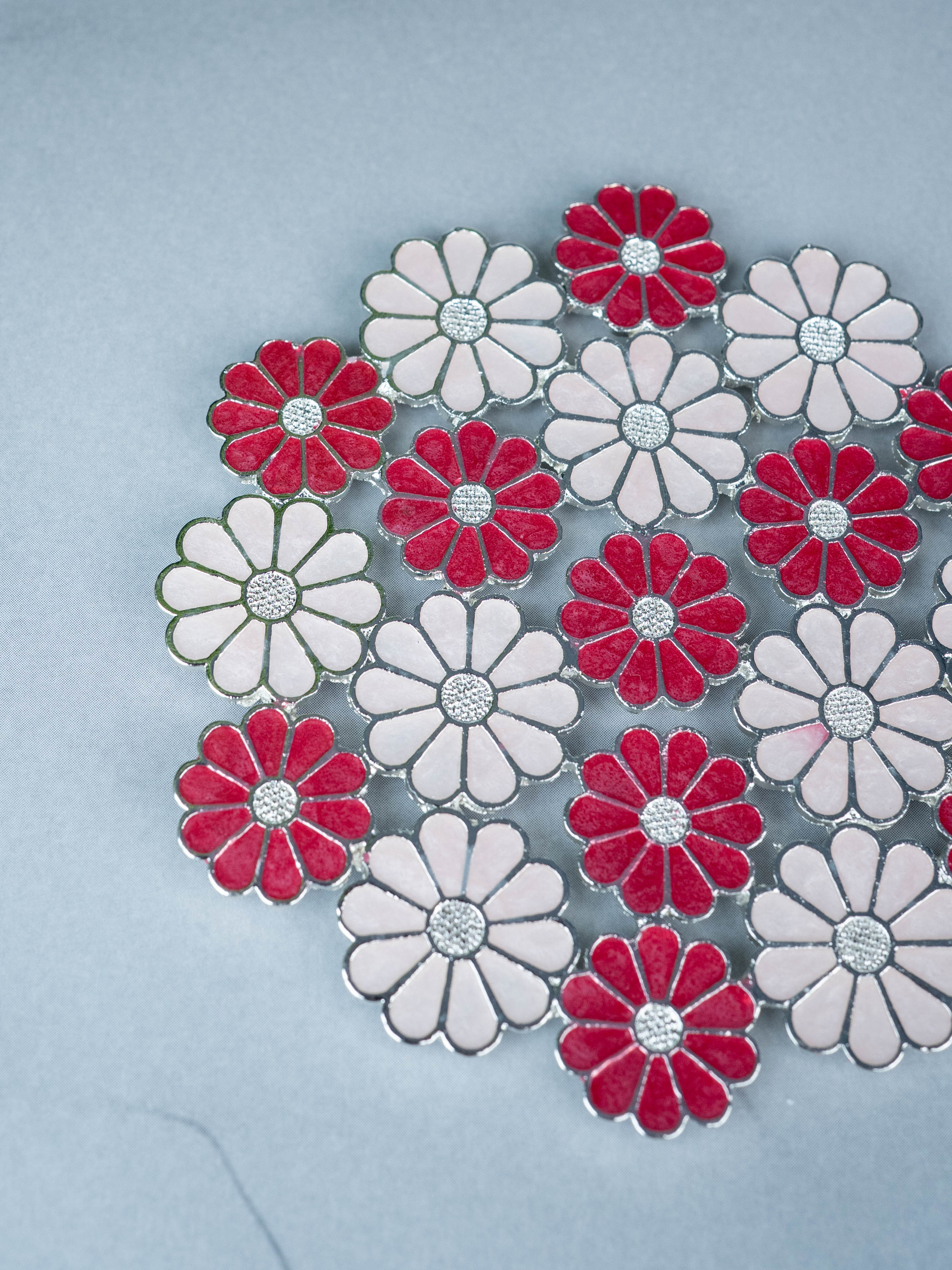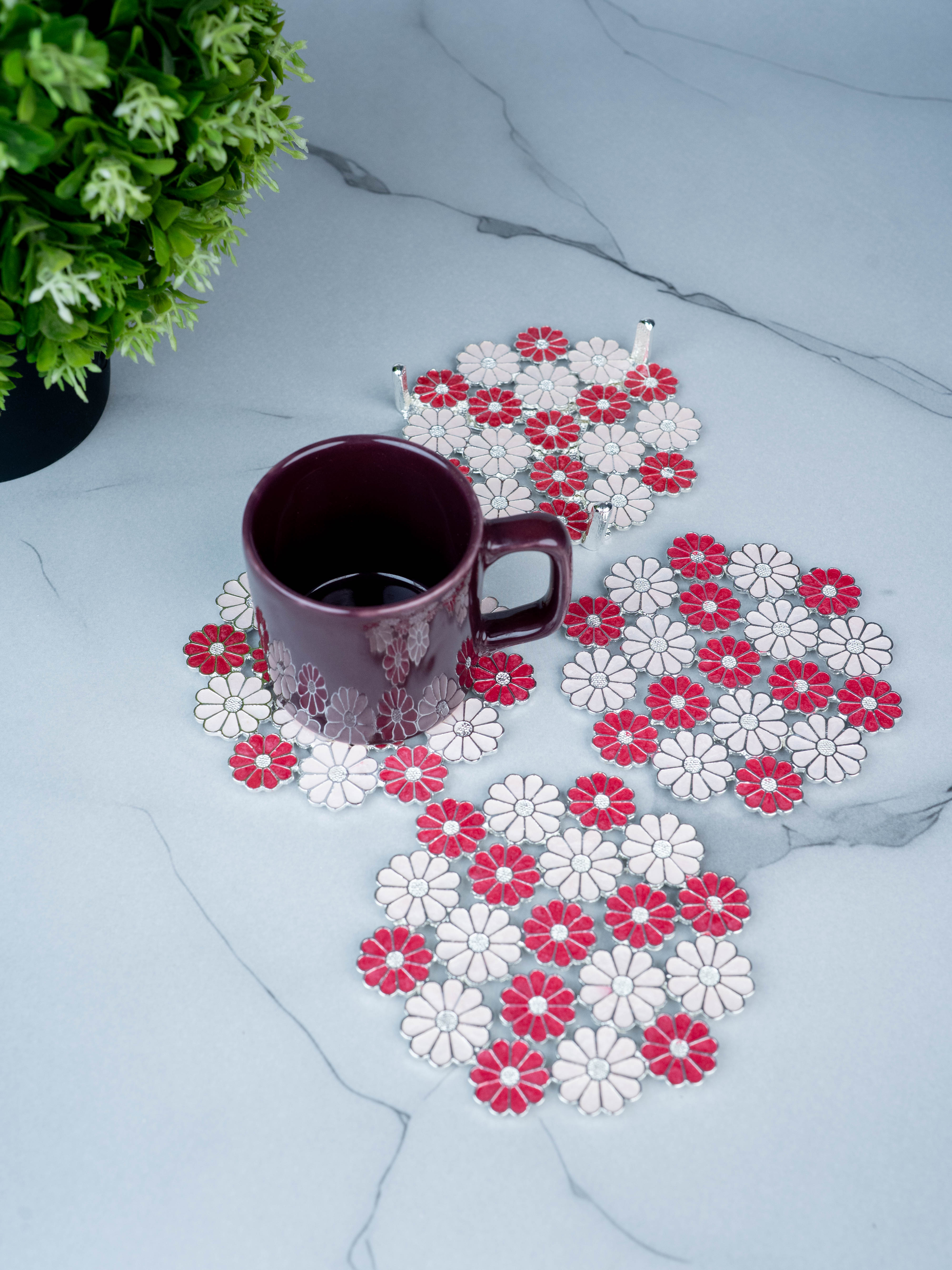- Beautifully Crafted Round Tea Coaster with a Floral Design. This Coaster is Composed of Alternating Pink and White Daisy-like Flowers.