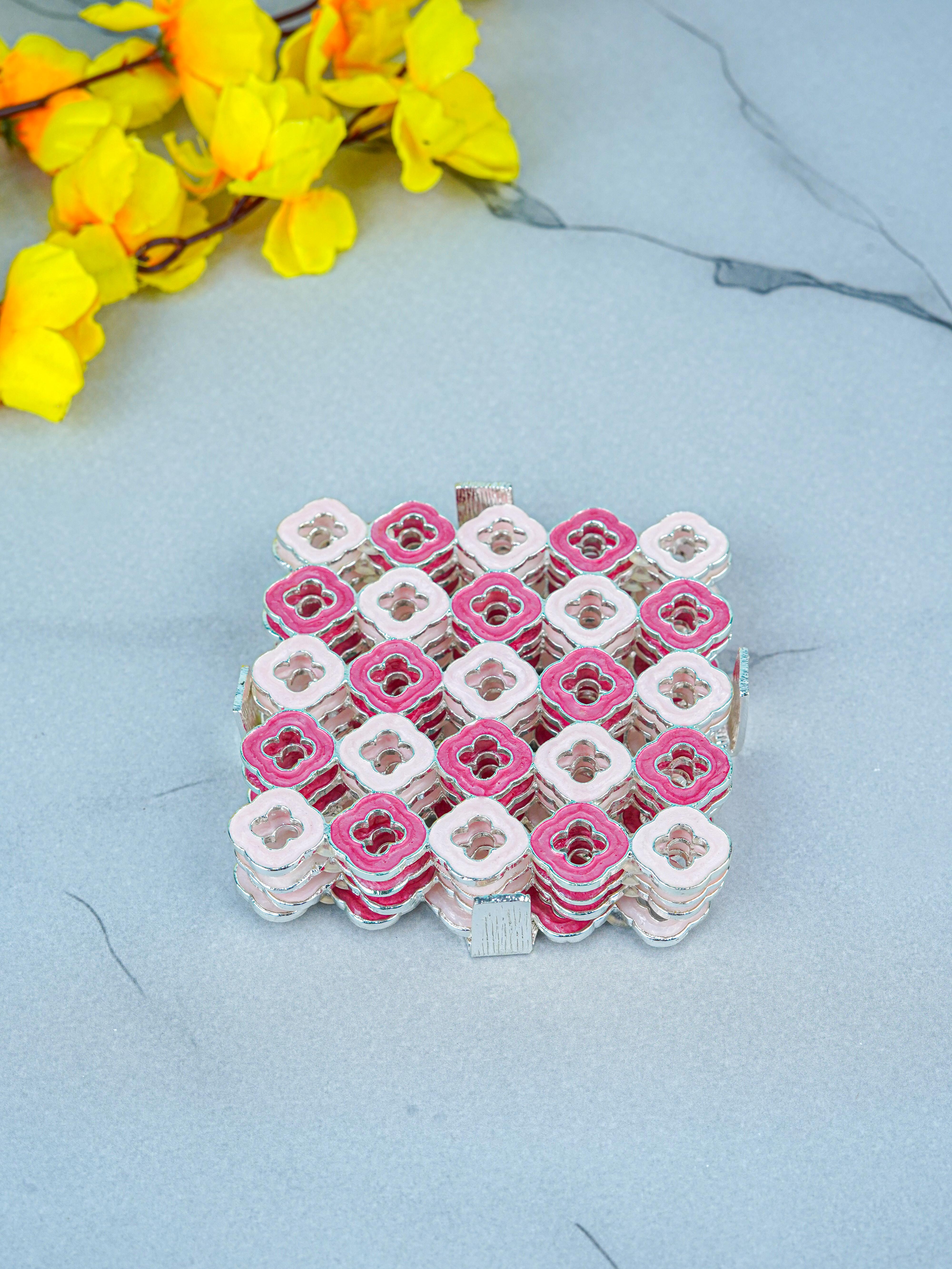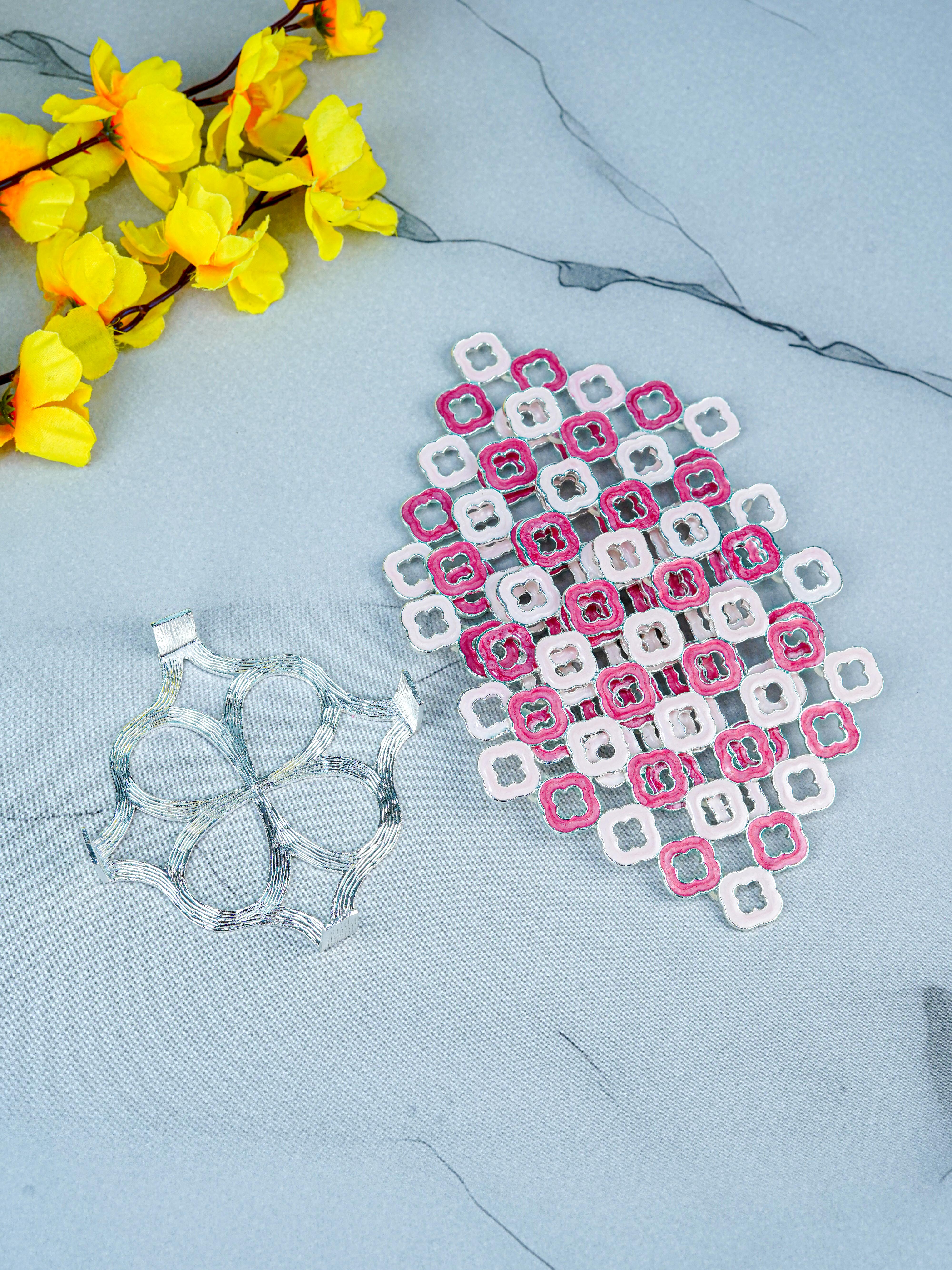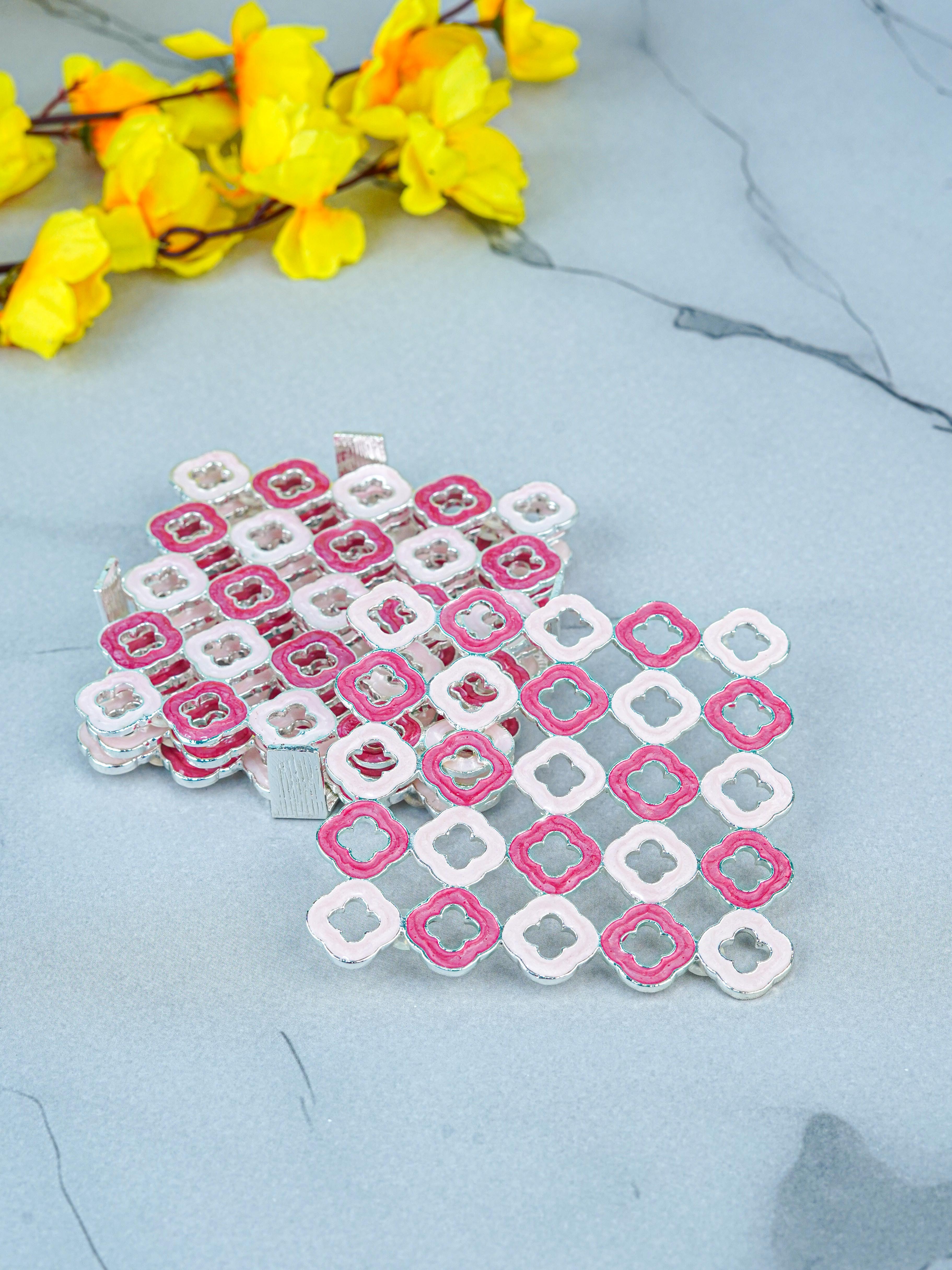 - Beautifully Crafted Tea Coaster with a Floral Design. This Coaster is Composed of Alternating Pink and White Light Pink Design.