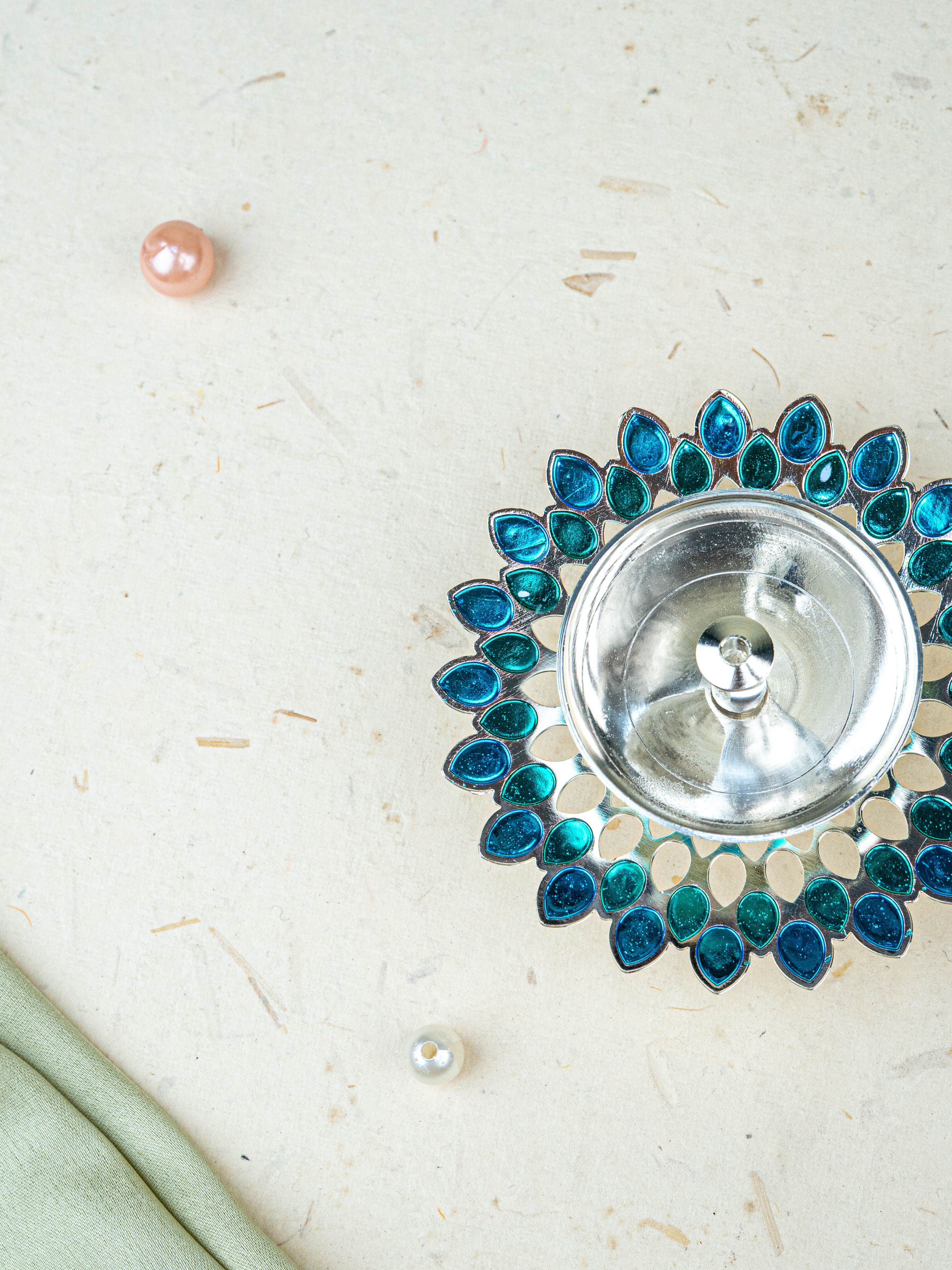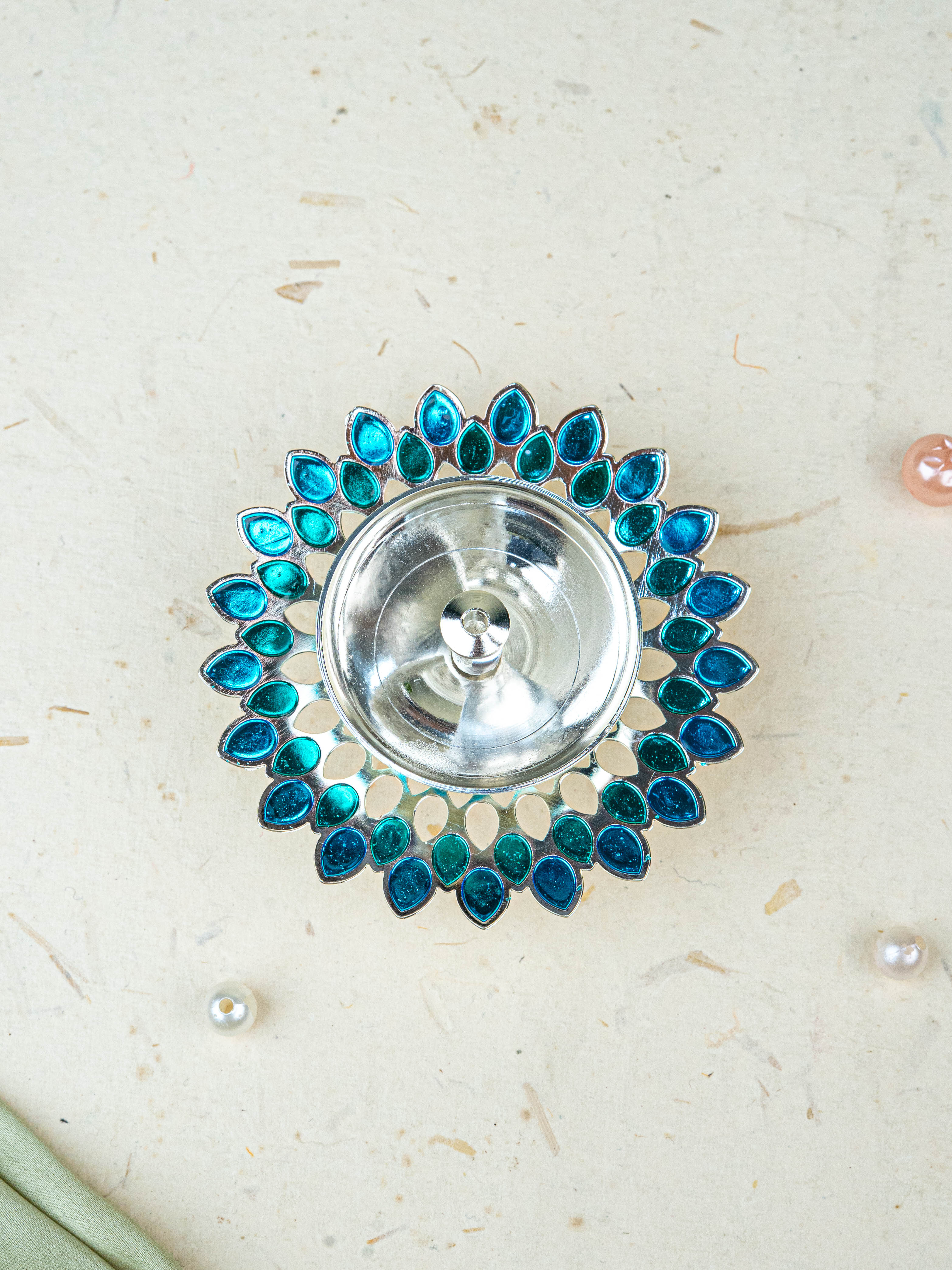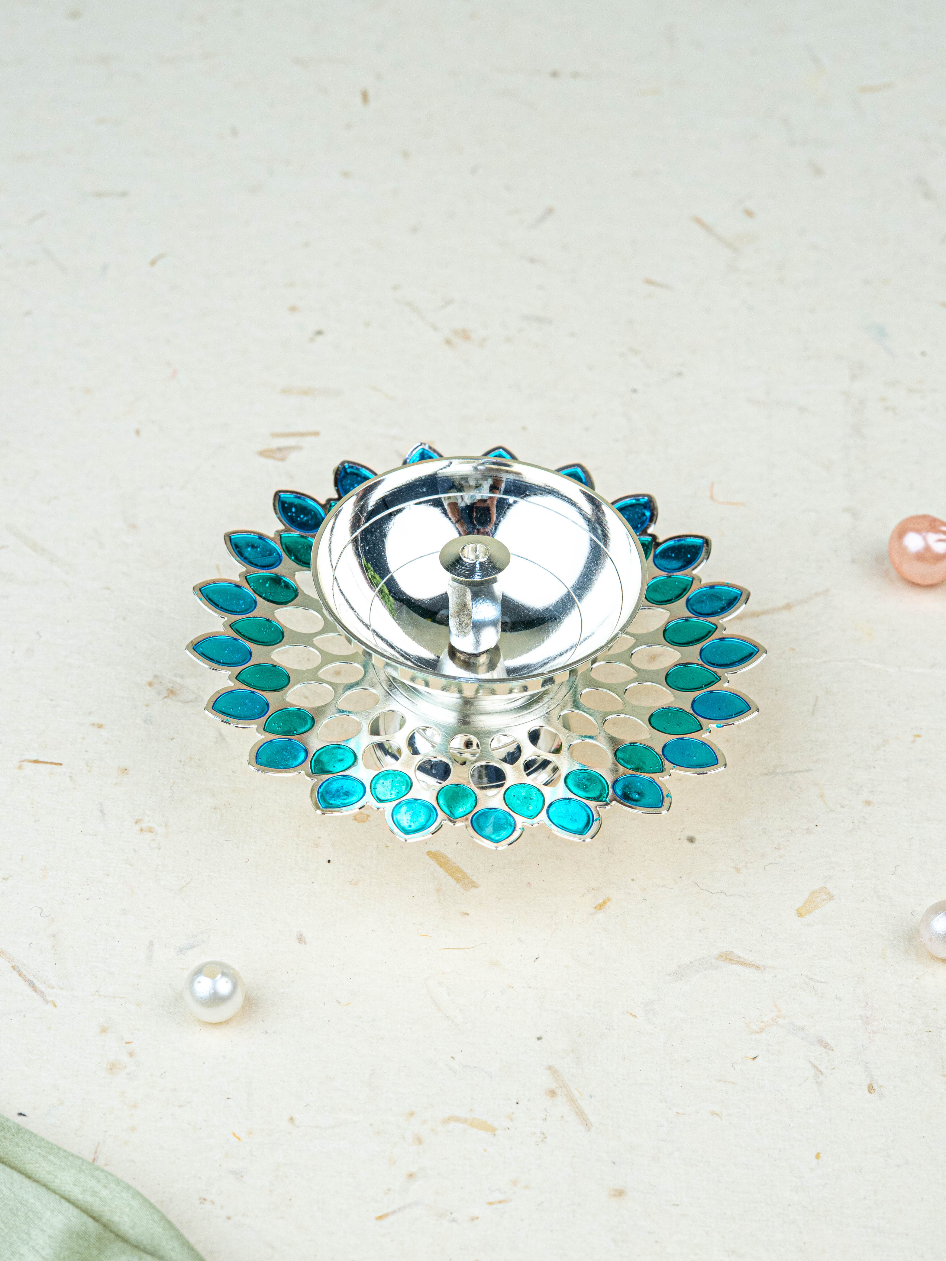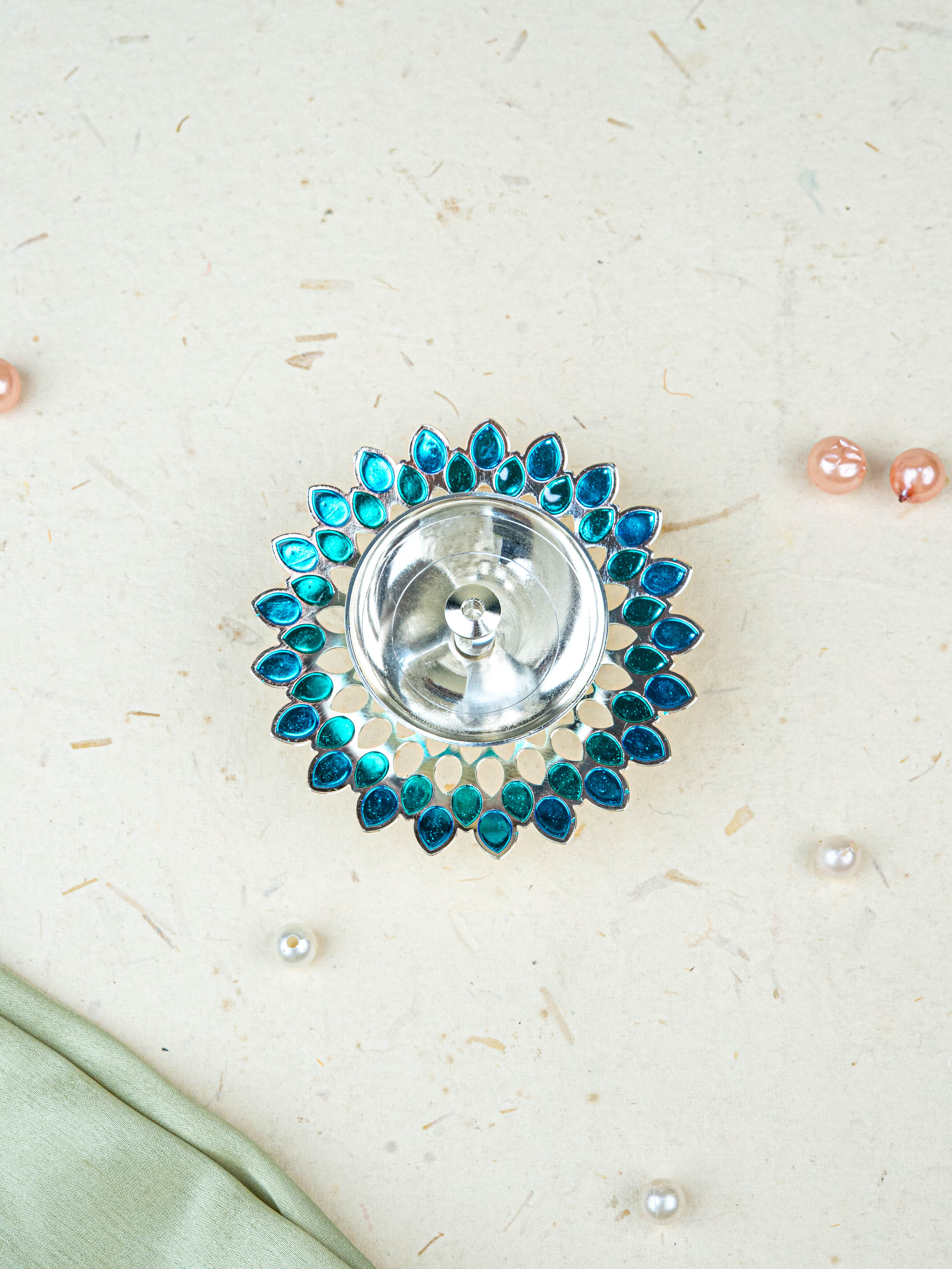 White Metal Designer Diya - Blue - WL5535-2