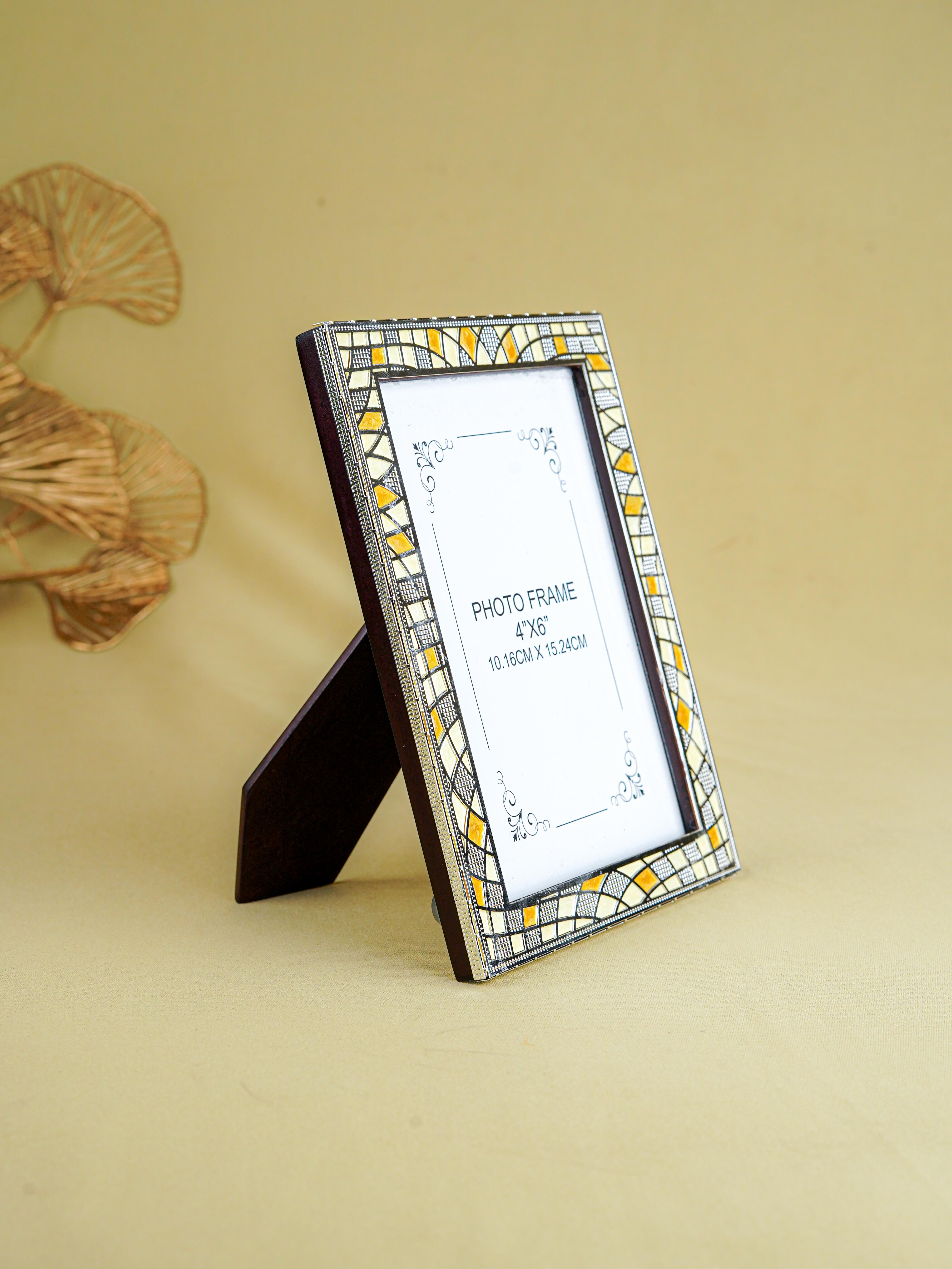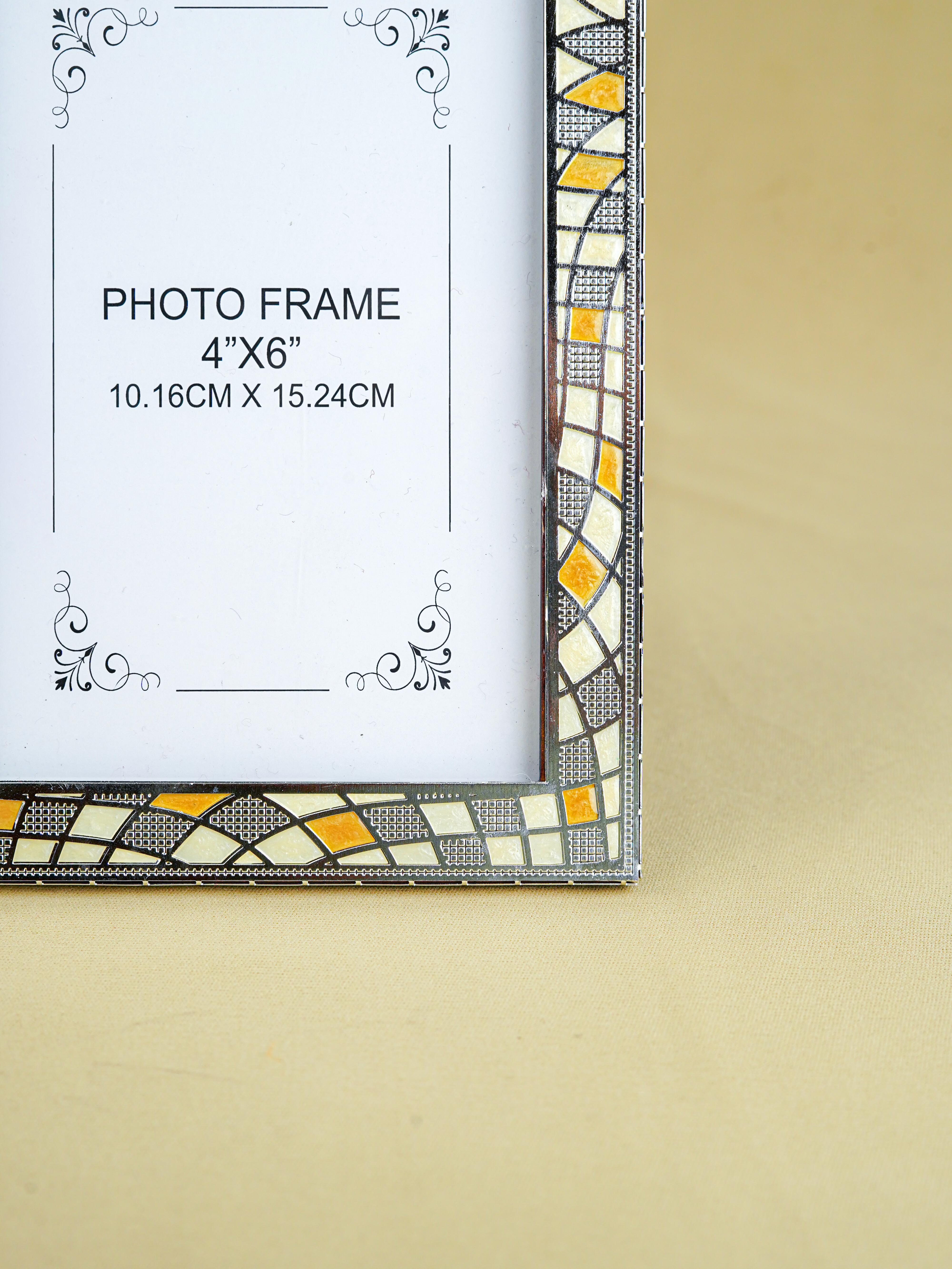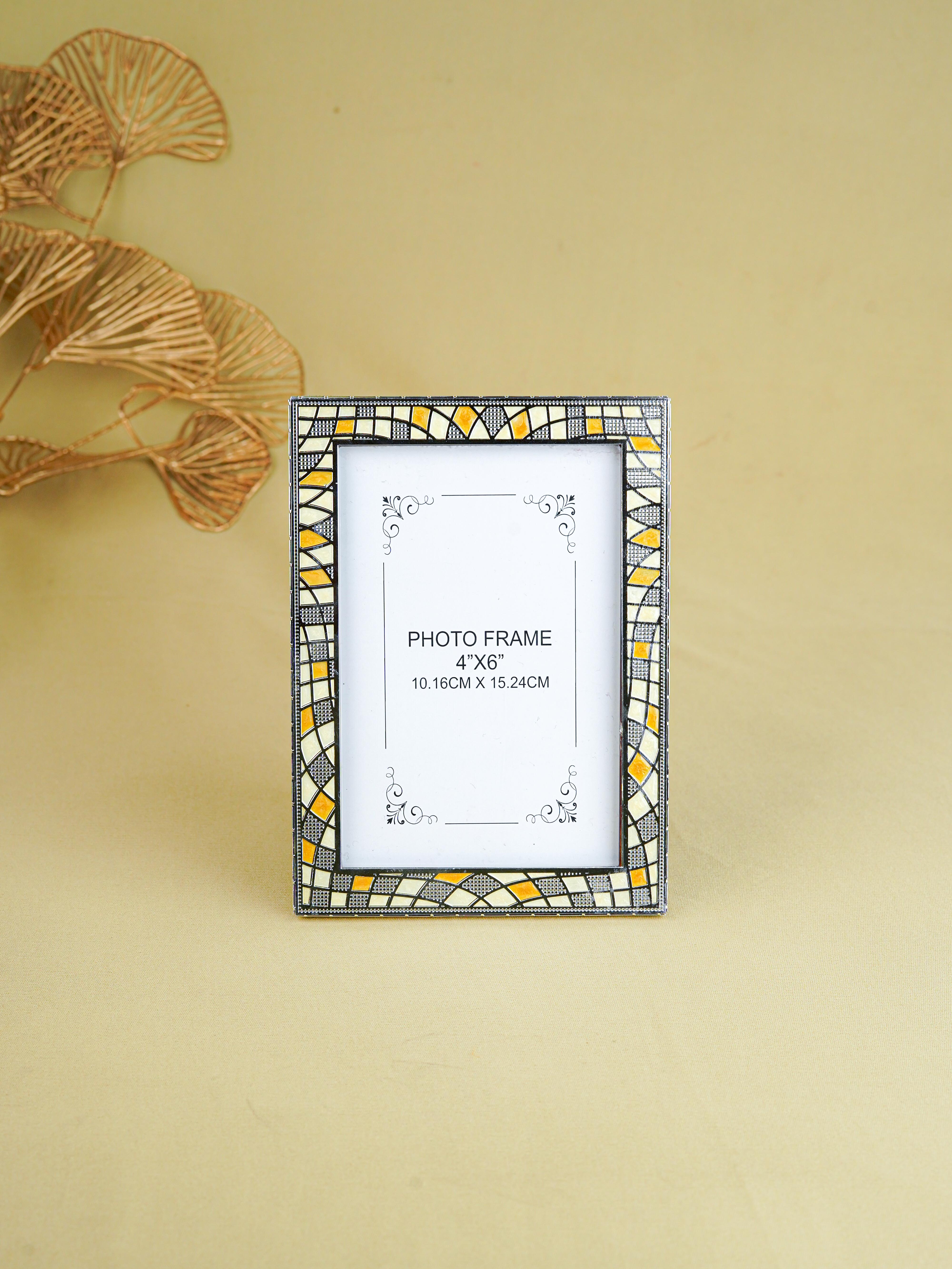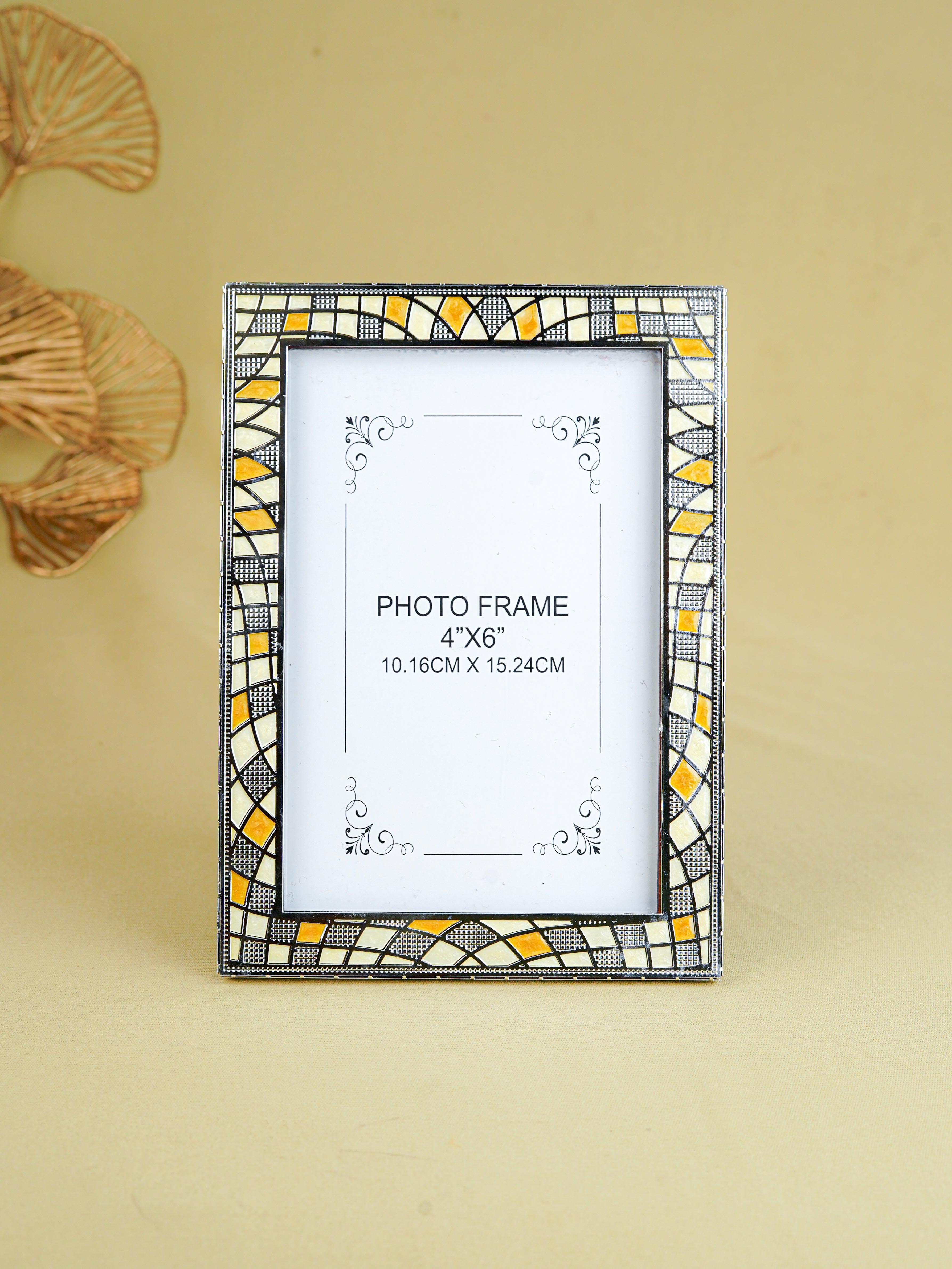 - White Metal Photo Frame Features a Beautiful Mosaic-Style Design with Intricate Patterns in Shades of Yellow & White.