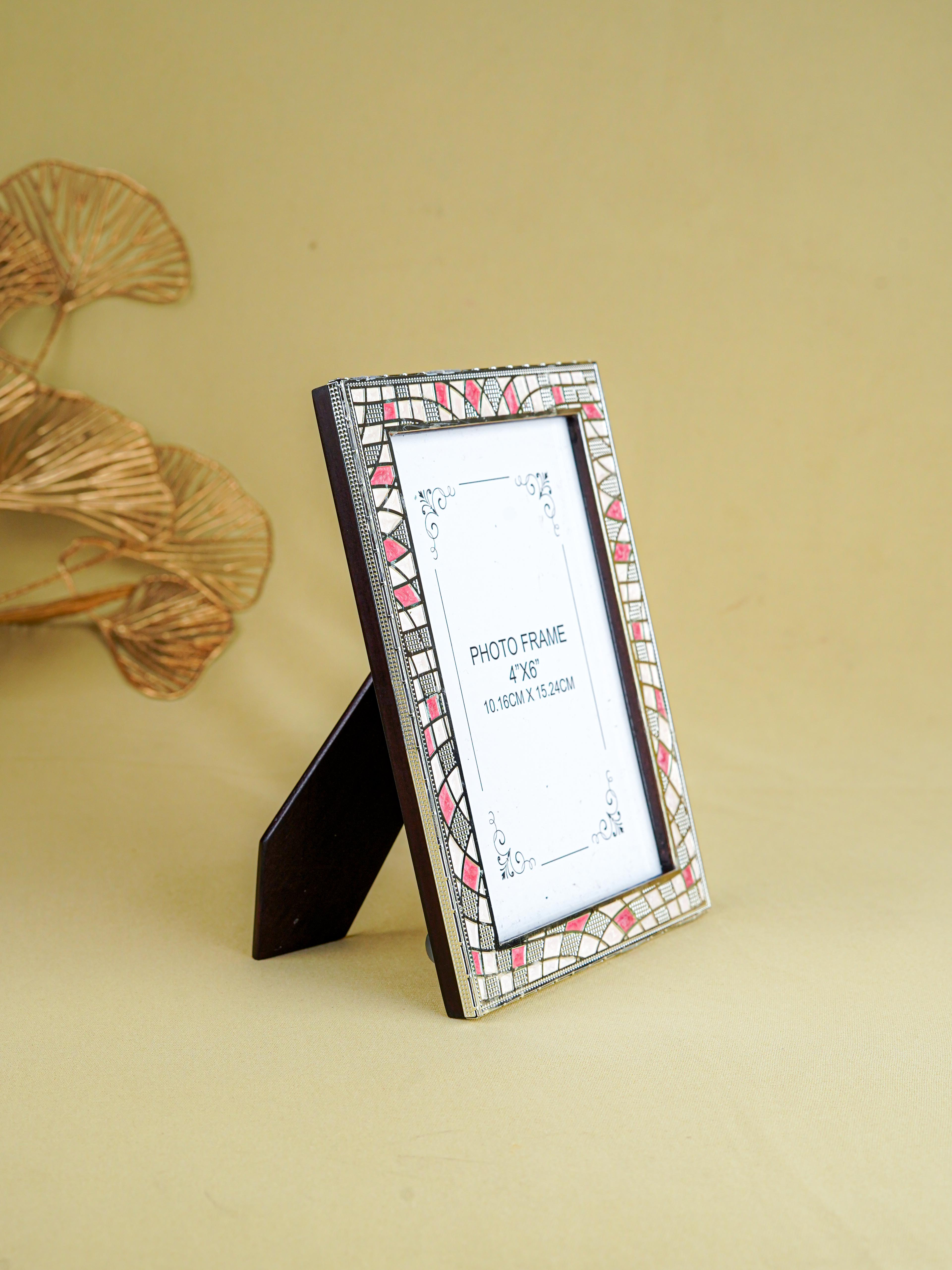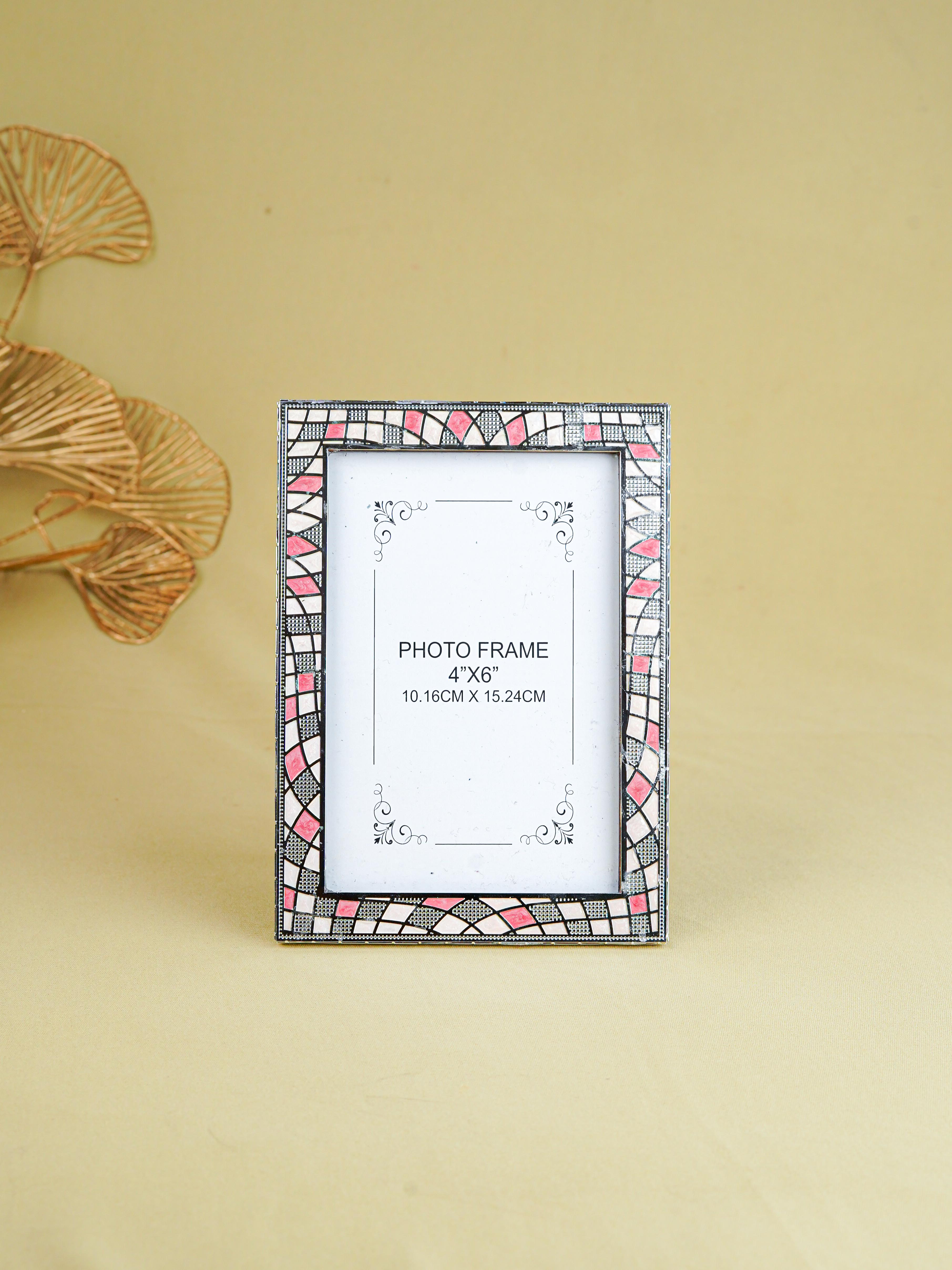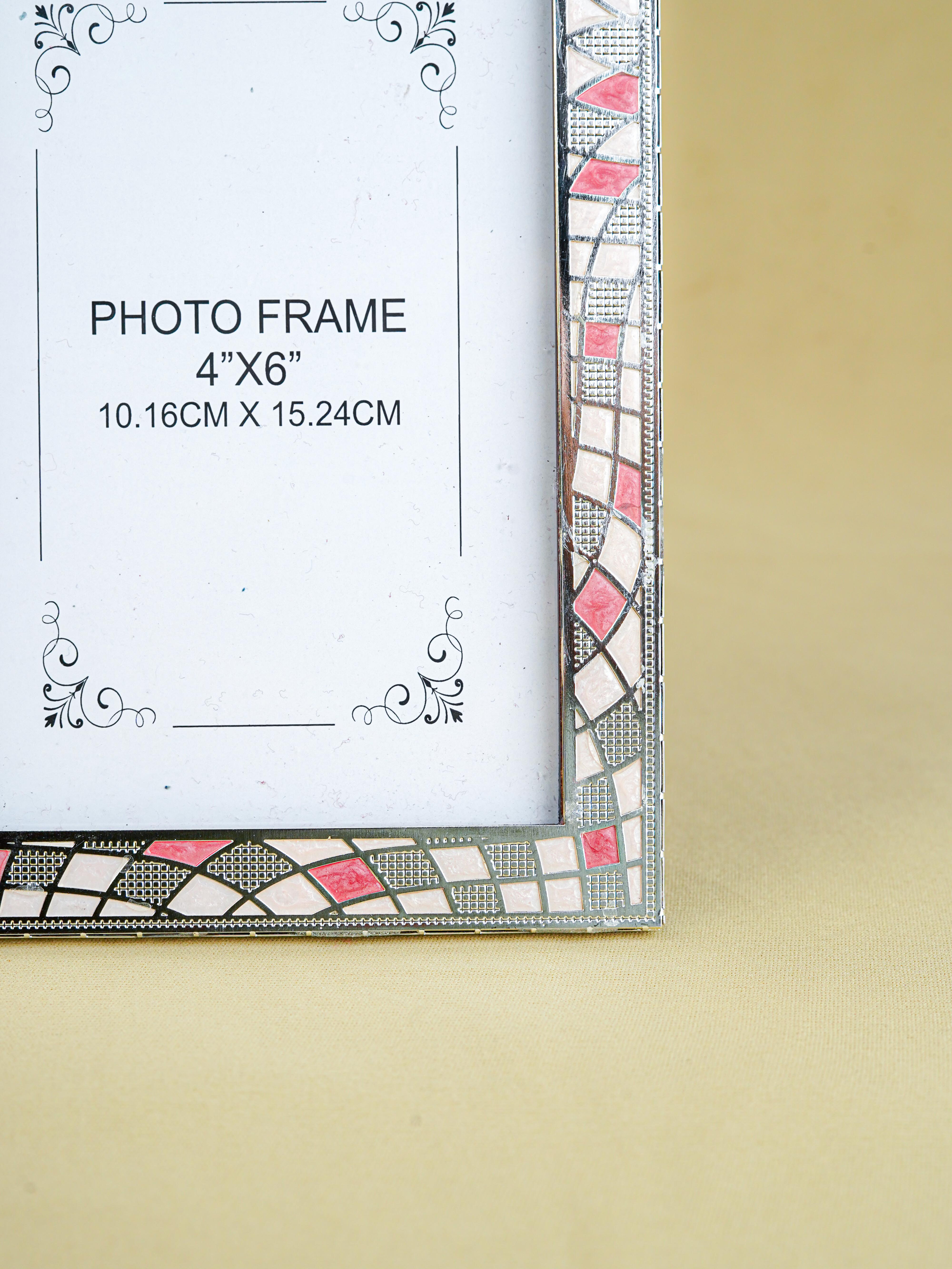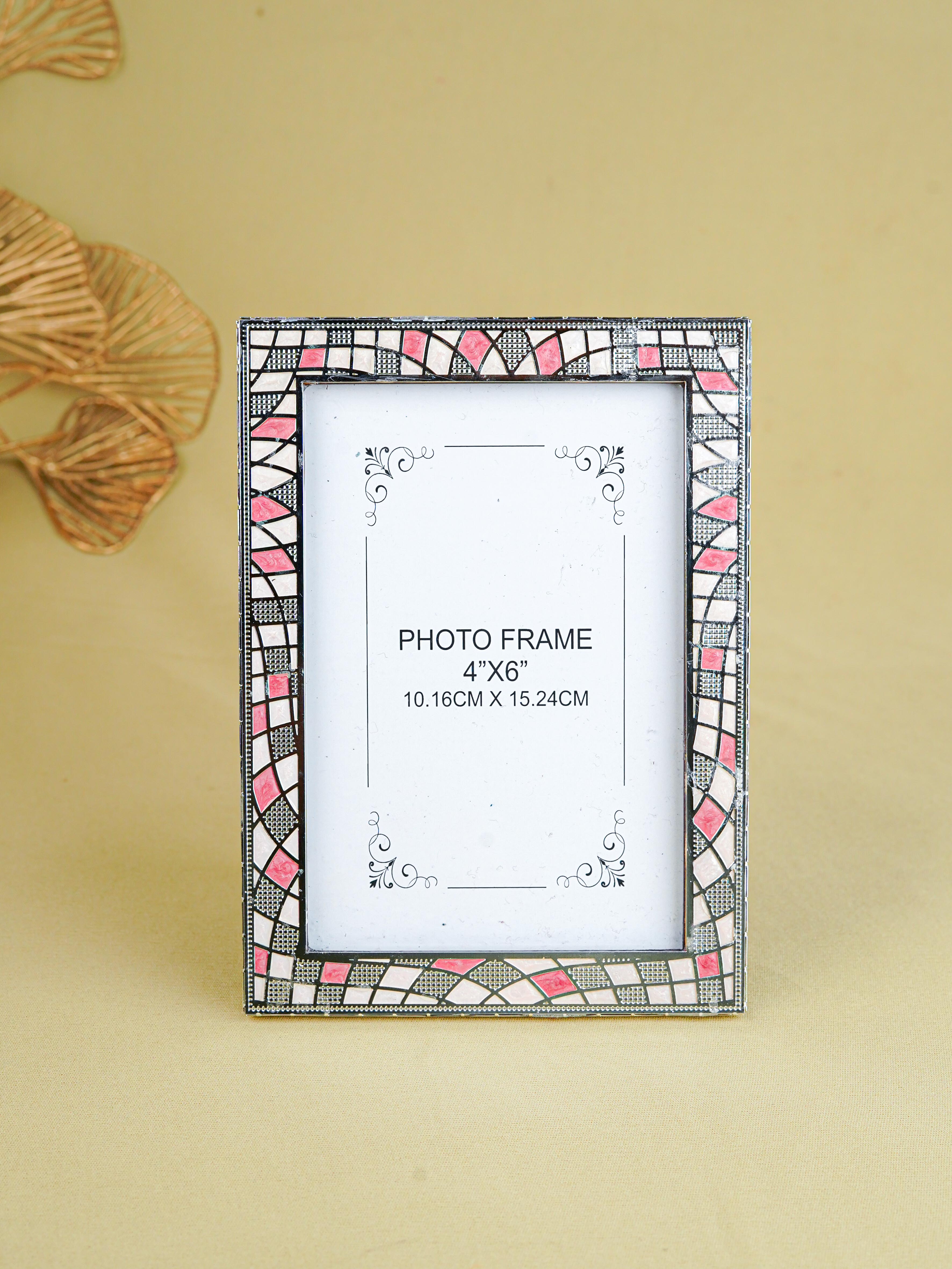 - White Metal Photo Frame Features a Beautiful Mosaic-Style Design with Intricate Patterns in Shades of Pink & White.