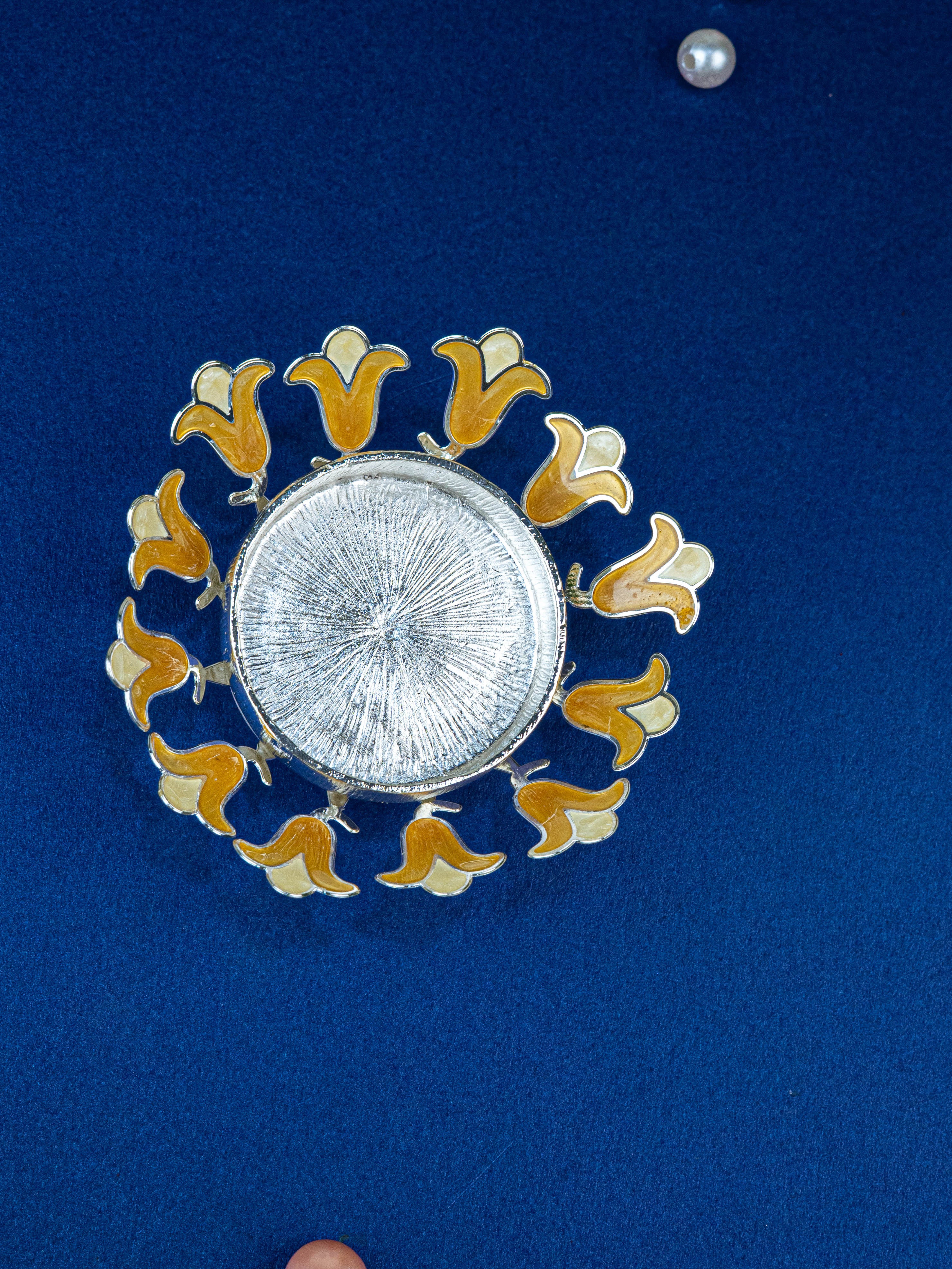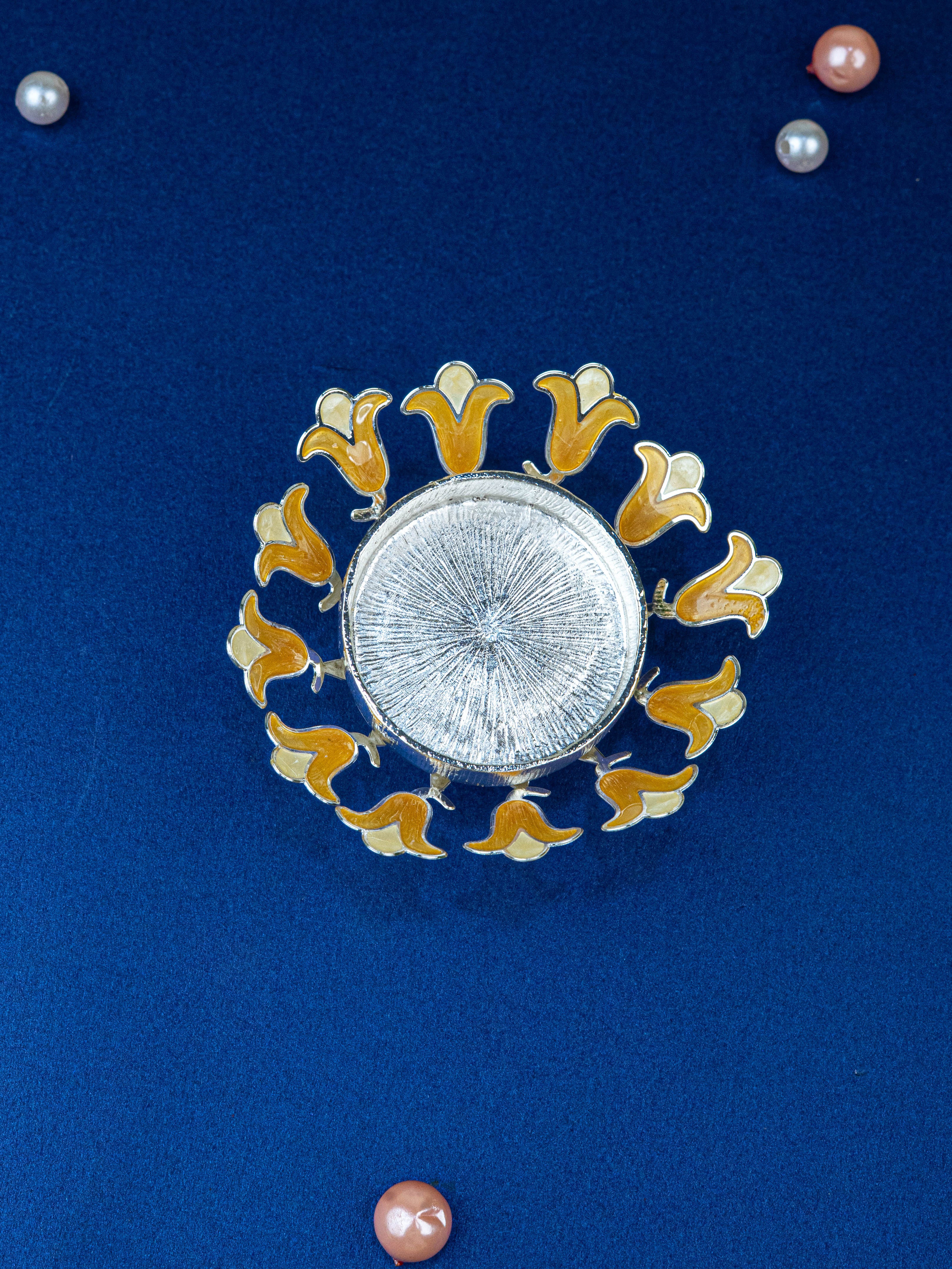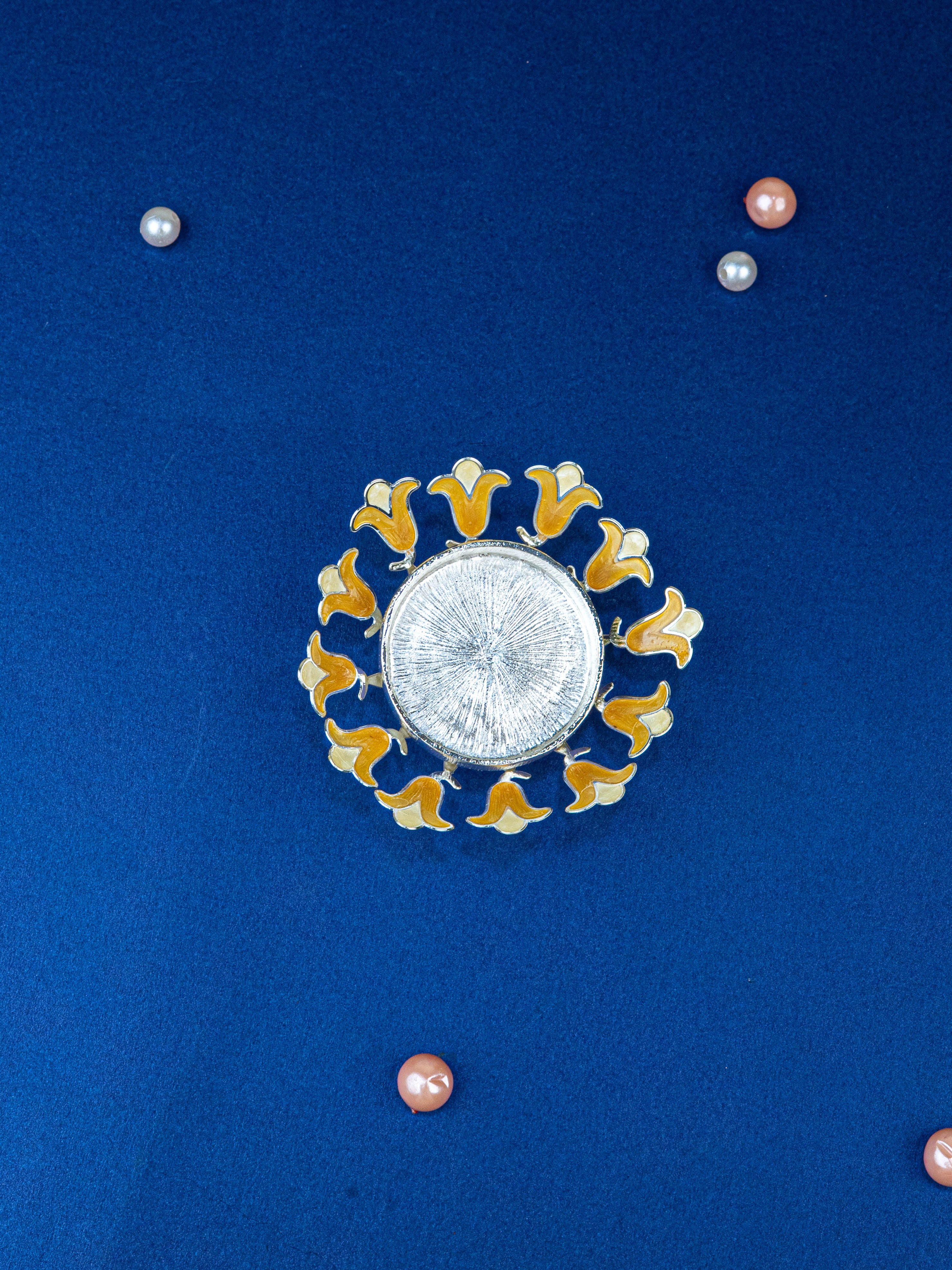 - Each Petal has a Metallic Silver Outline with Beige Enamel Filling.