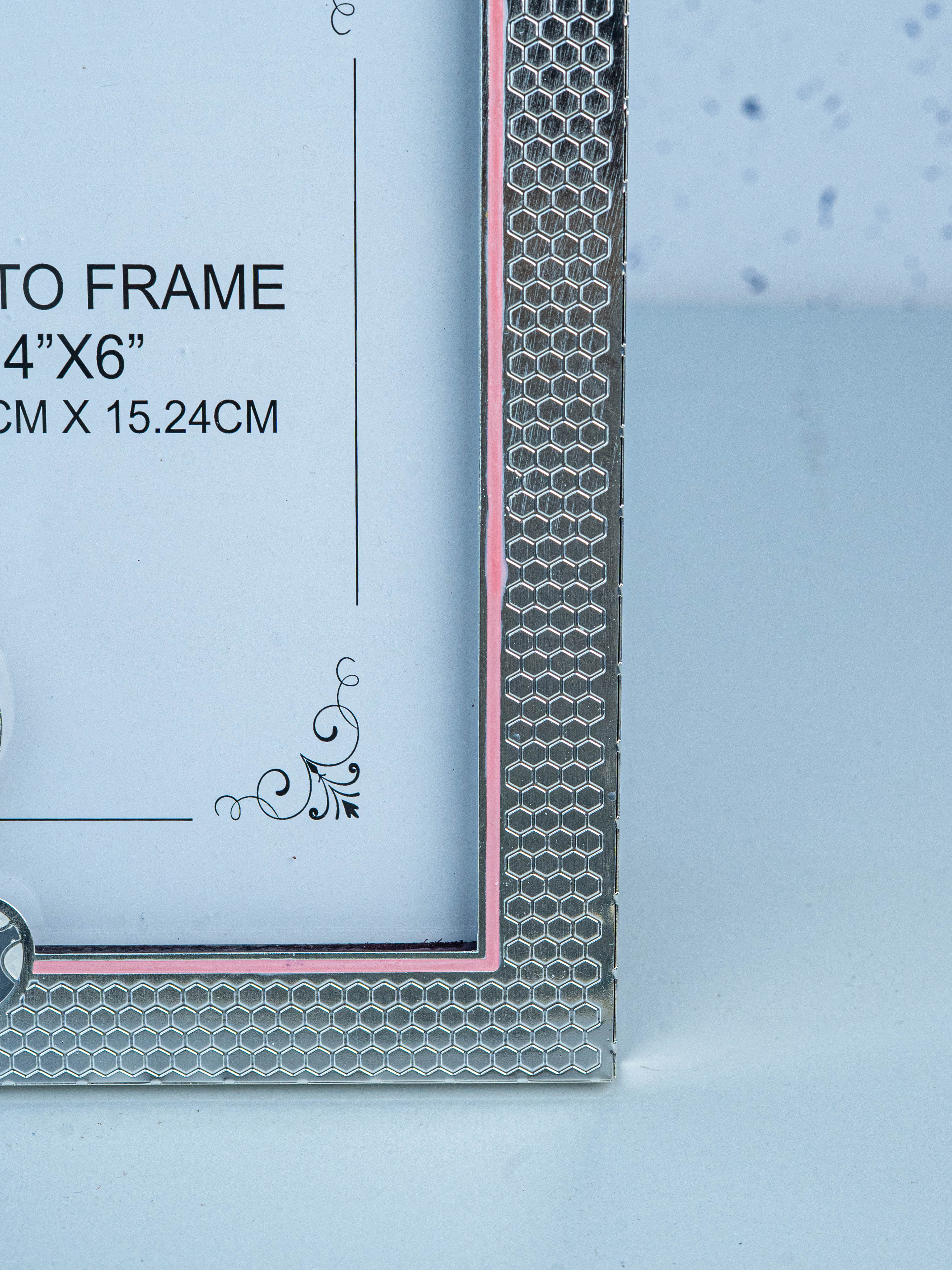 - This Frame Features a Textured Silver Honeycomb Pattern Border with a Subtle Pink Inner Lining, adding a Soft and Charming Accent.
