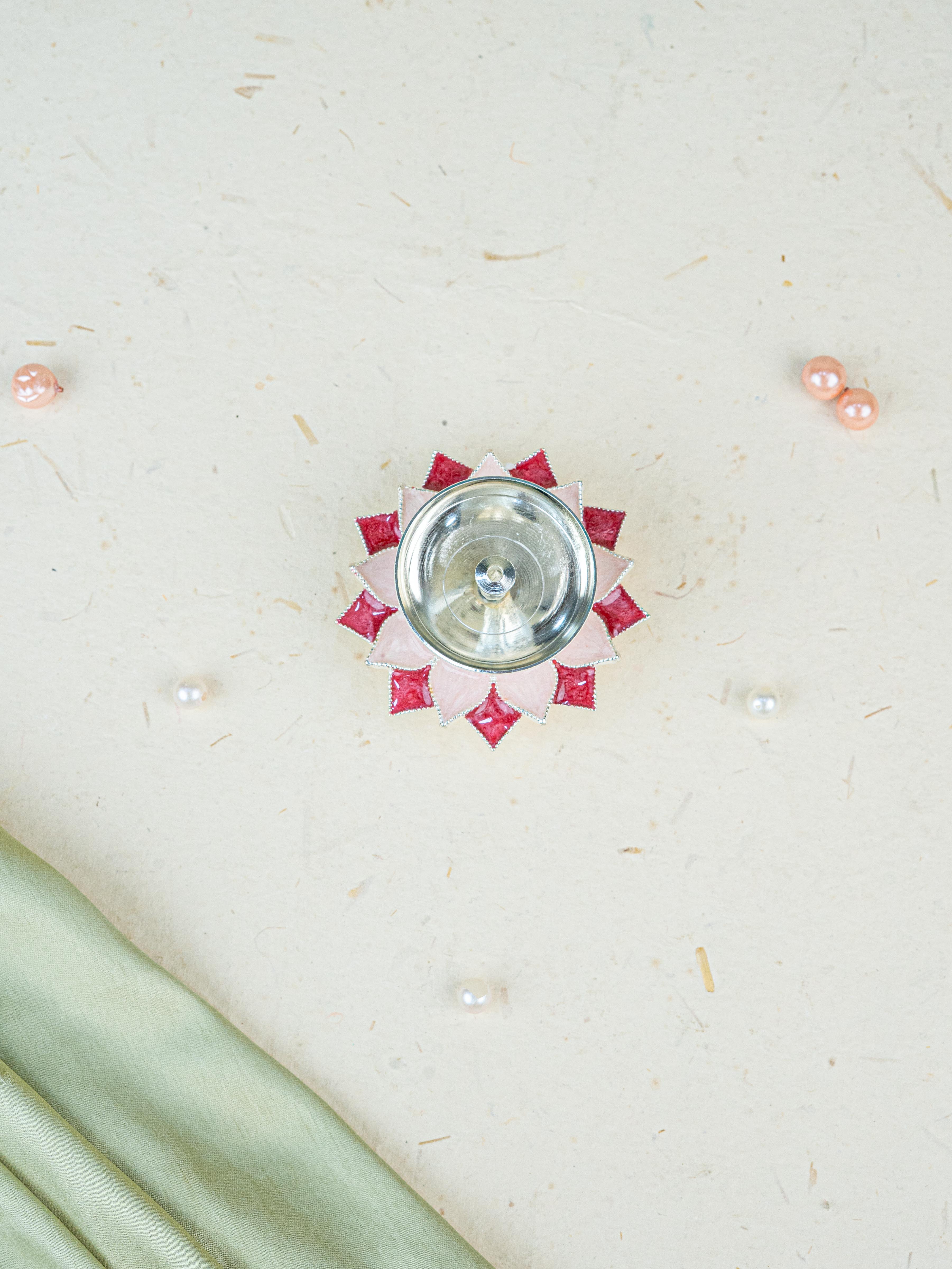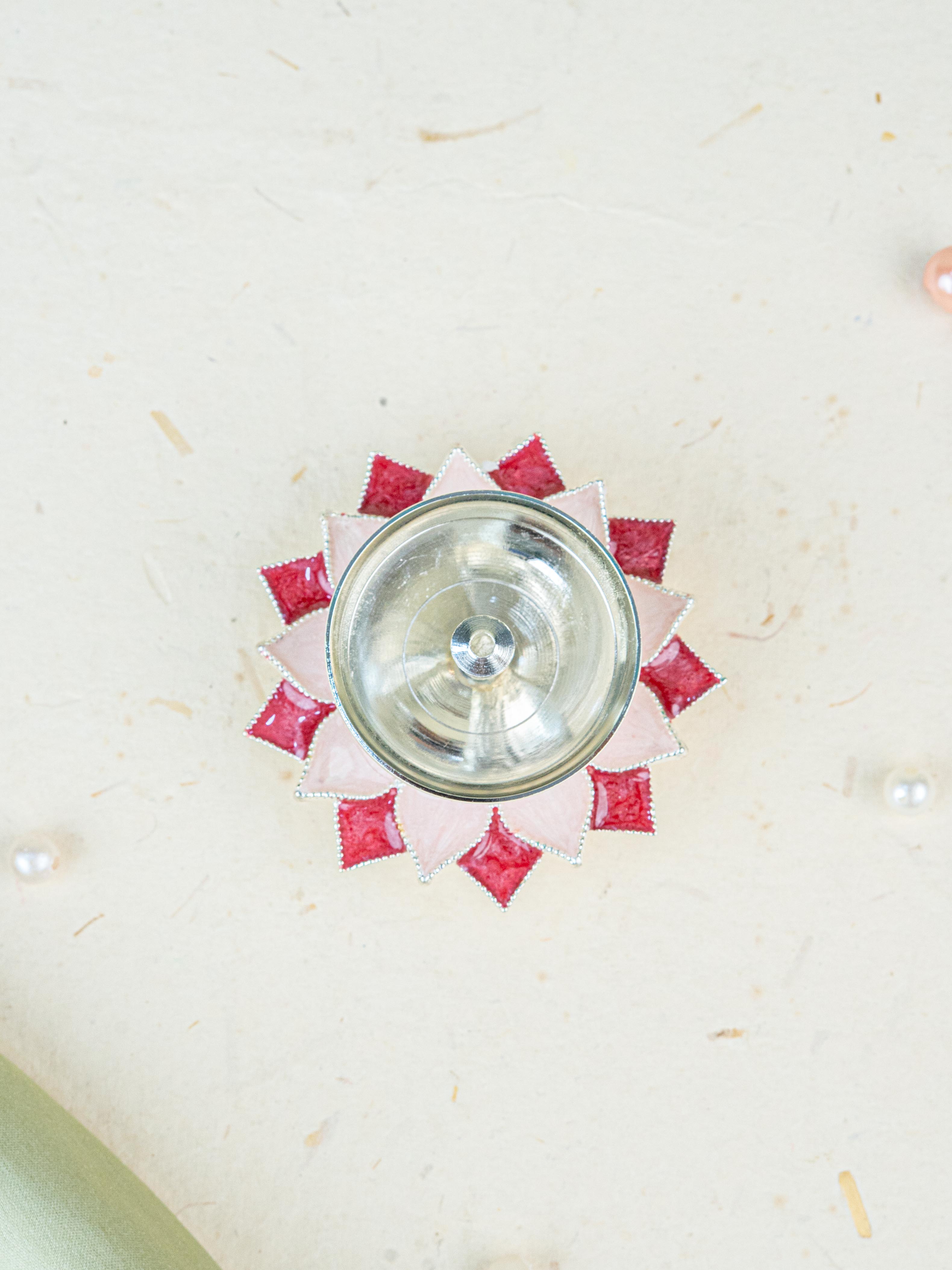 - Floral Lotus Design Diya with Alternating Pink Petals, Embellished with a Shiny Beaded, Enamel Finish that Adds a Festive Charm.