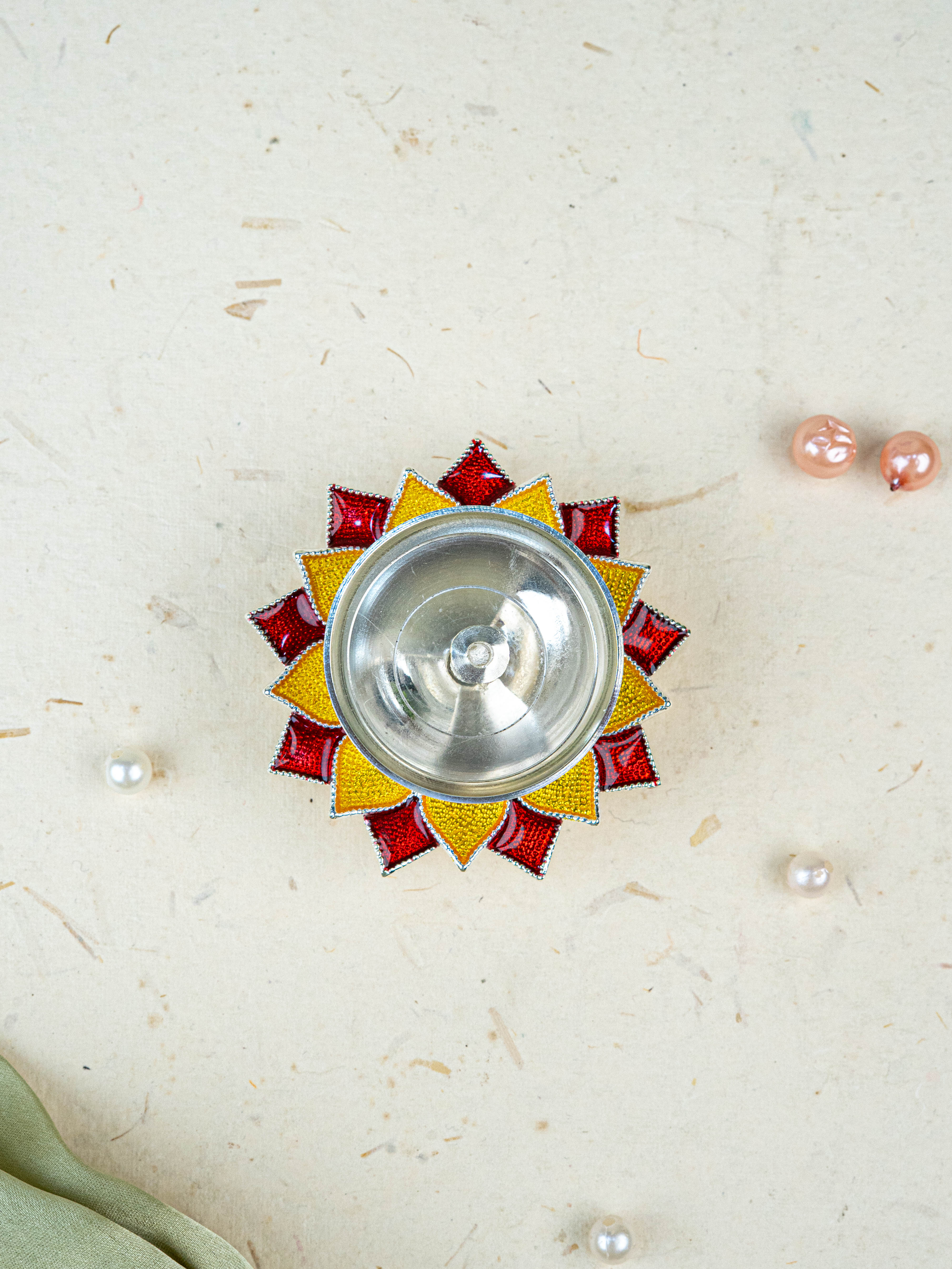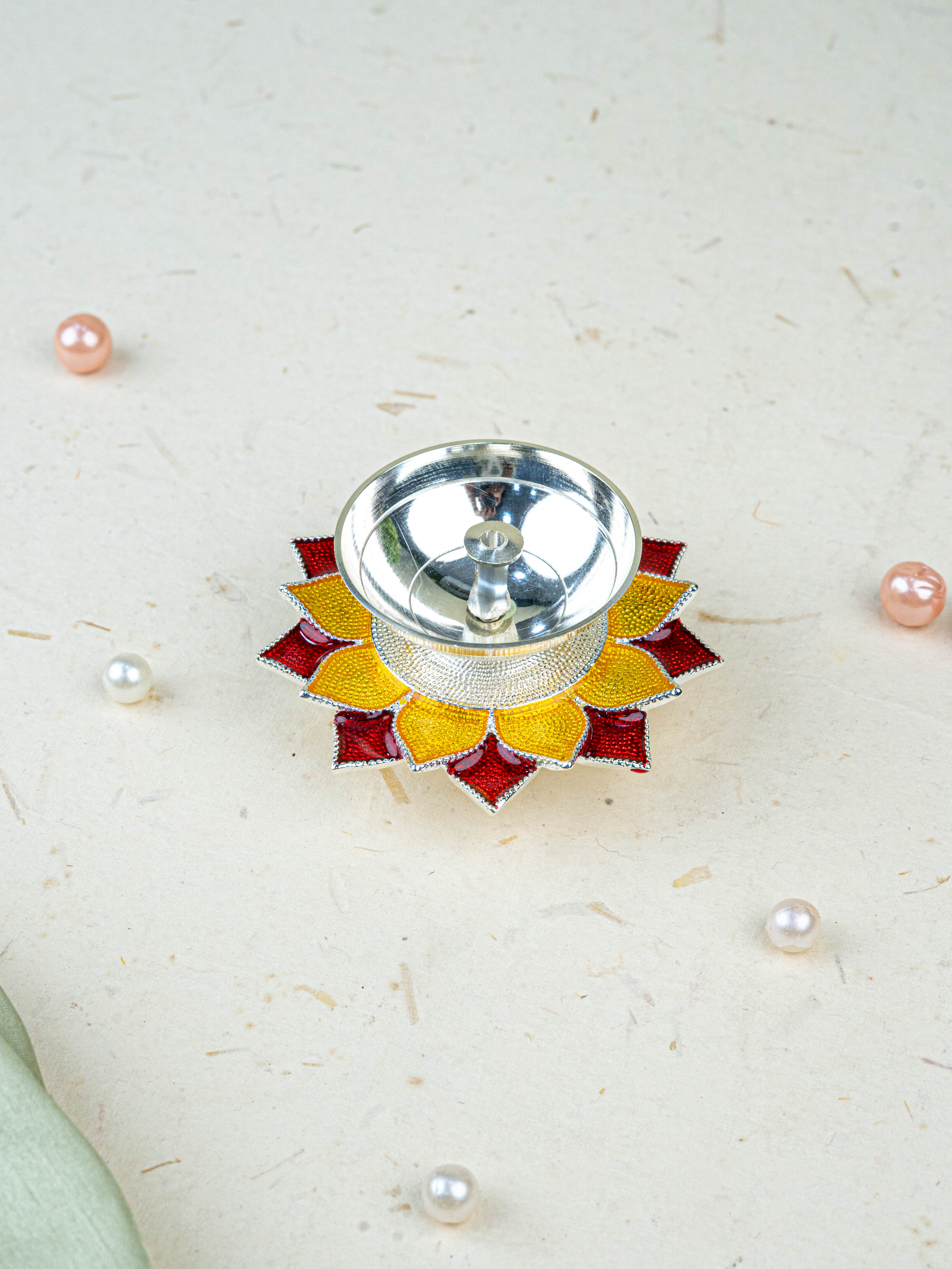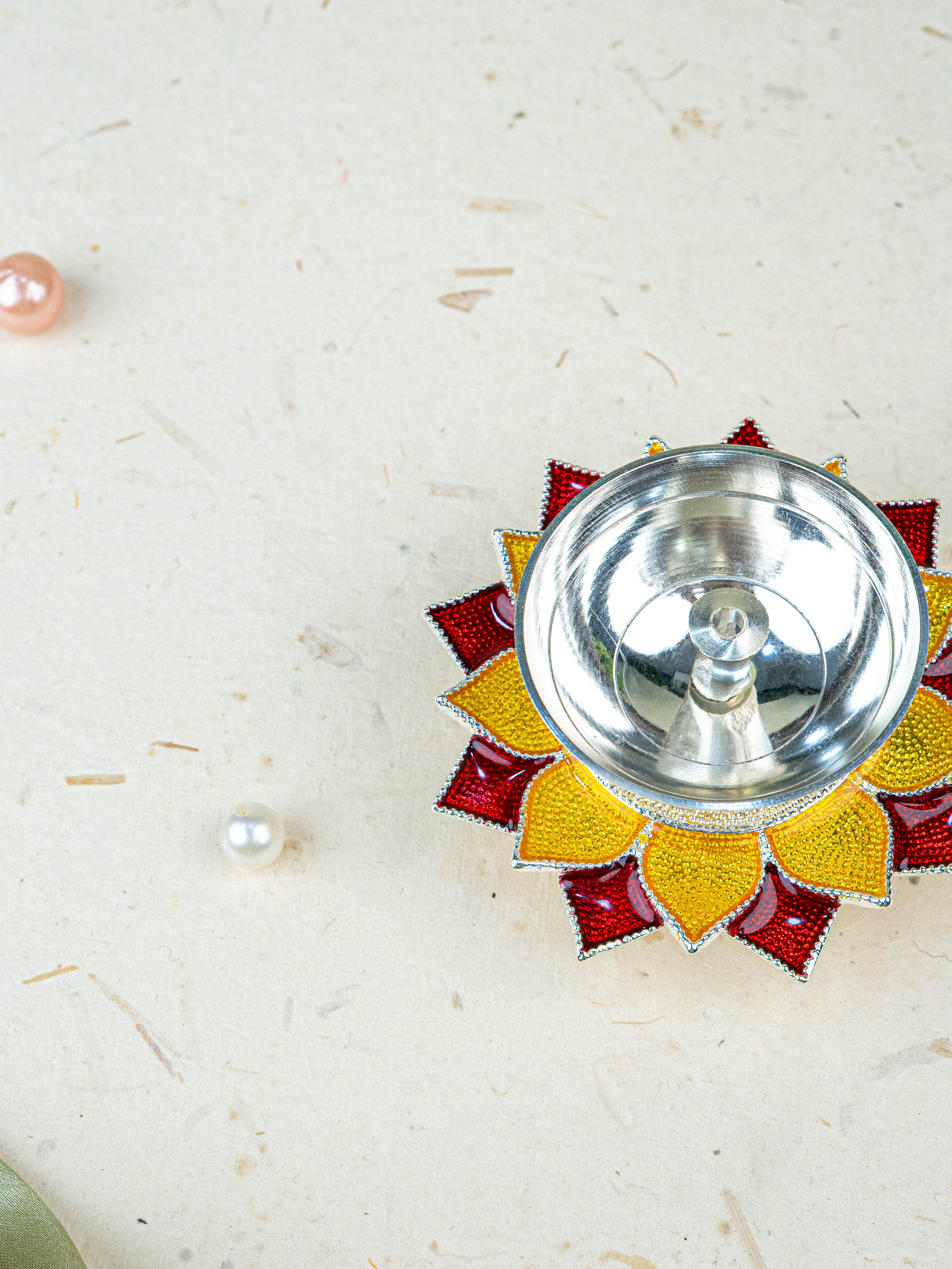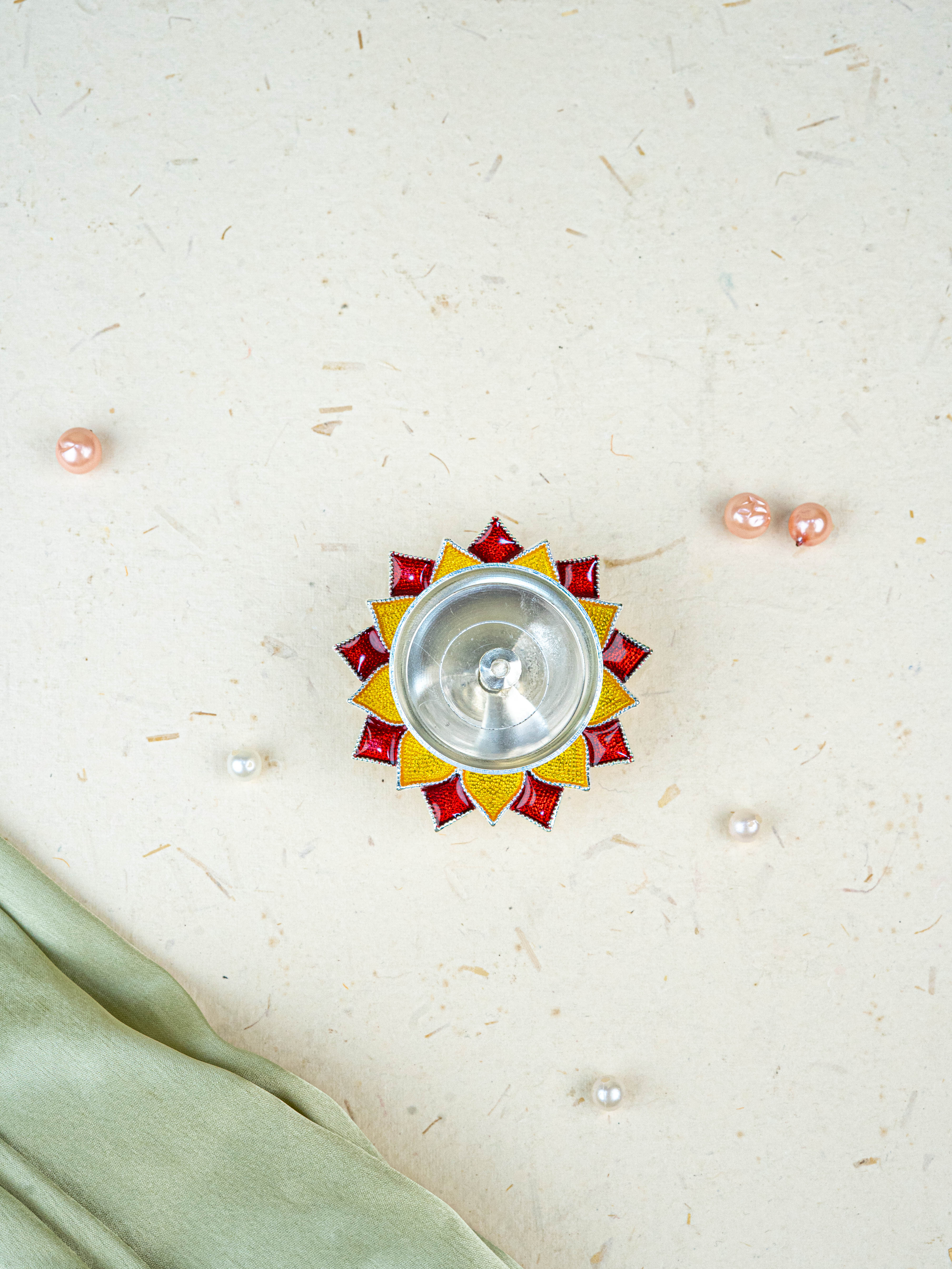- This Diya Features a Metallic Silver Oil Holder in the Center, Ideal for Placing a Cotton Wick.