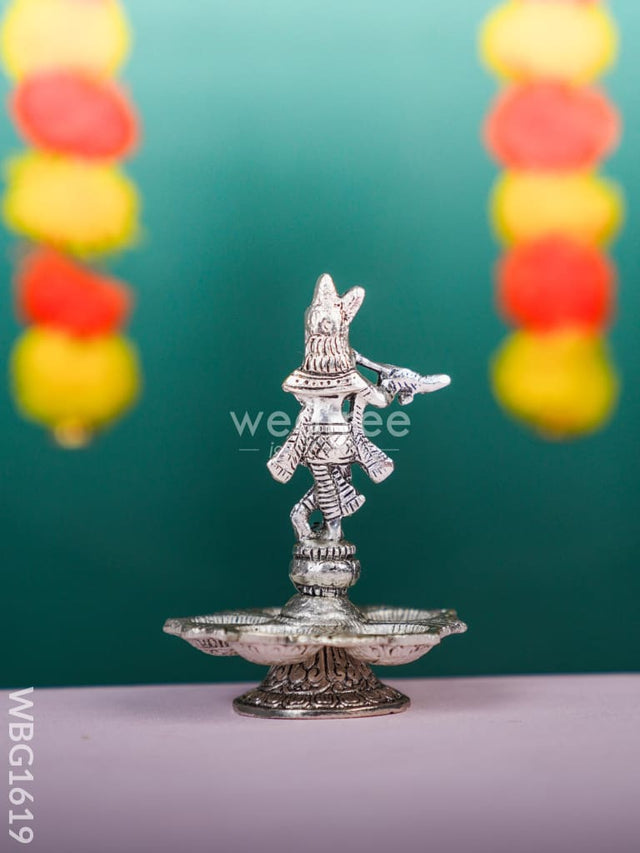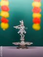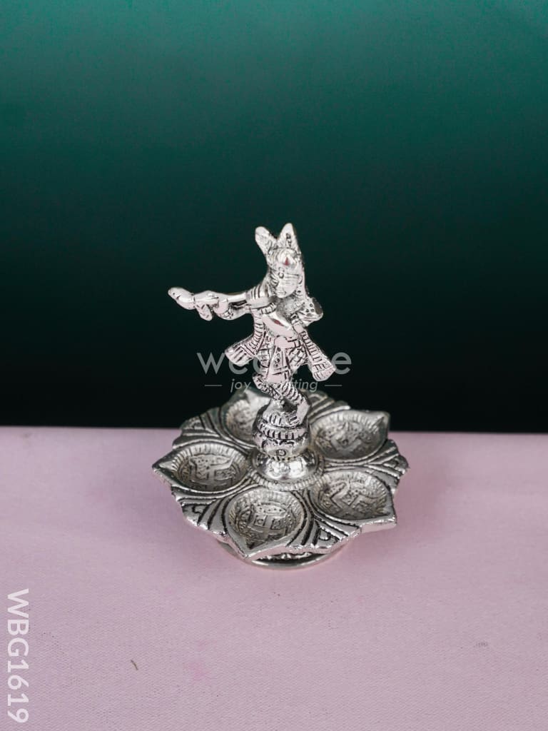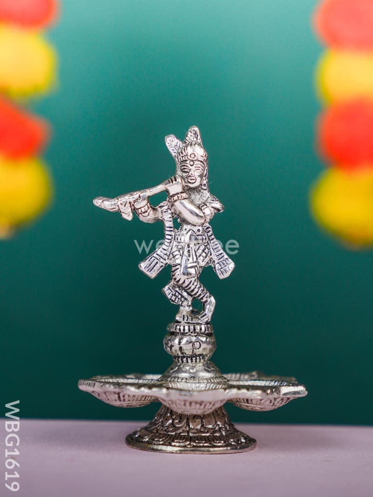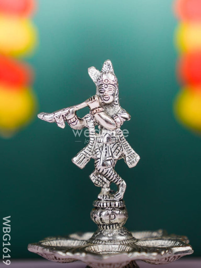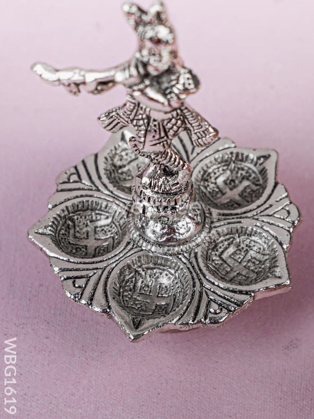 - Our White Metal Krishna Holding a Flute, Adorned with 5 Intricate Diya each featuring a Swastik Symbol inside Each Diya.
