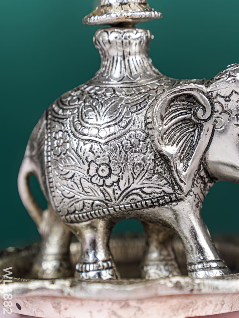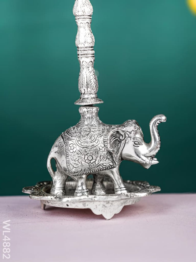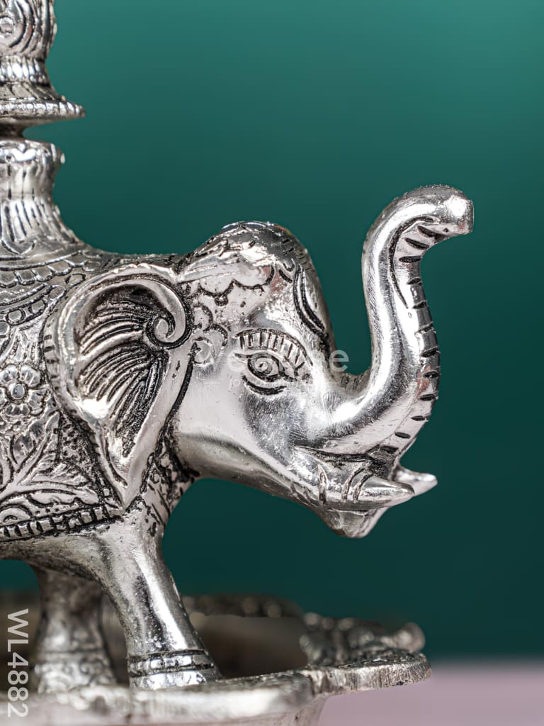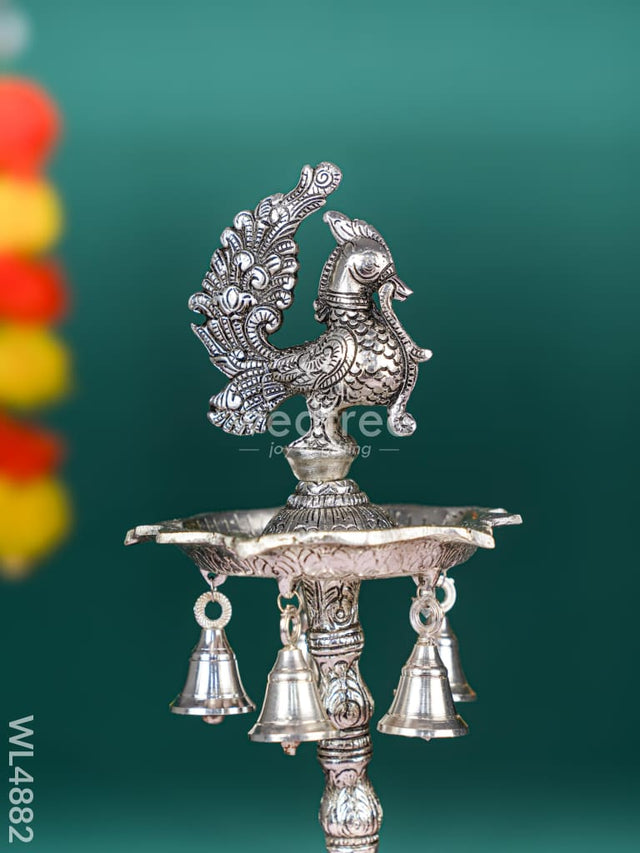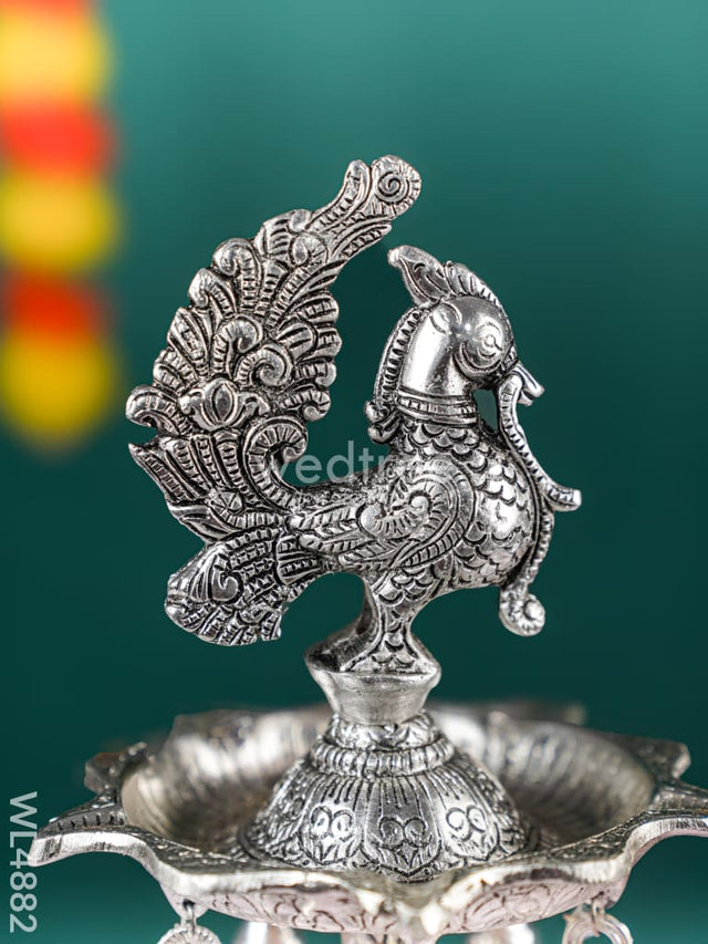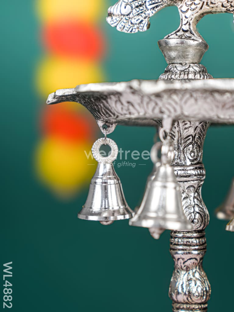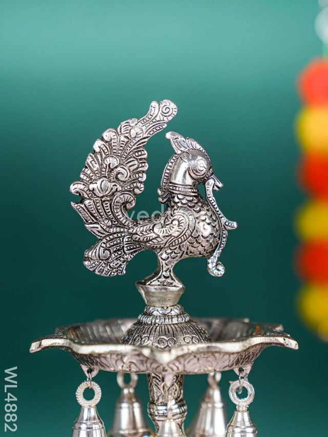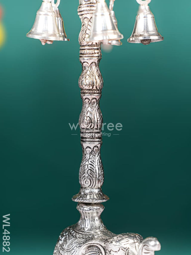 - Our White Metal Kuthu Vilaku featuring a Beautiful Annapakshi on Top and a Majestic Elephant Below, Along with 5 Bells Around the Diya.