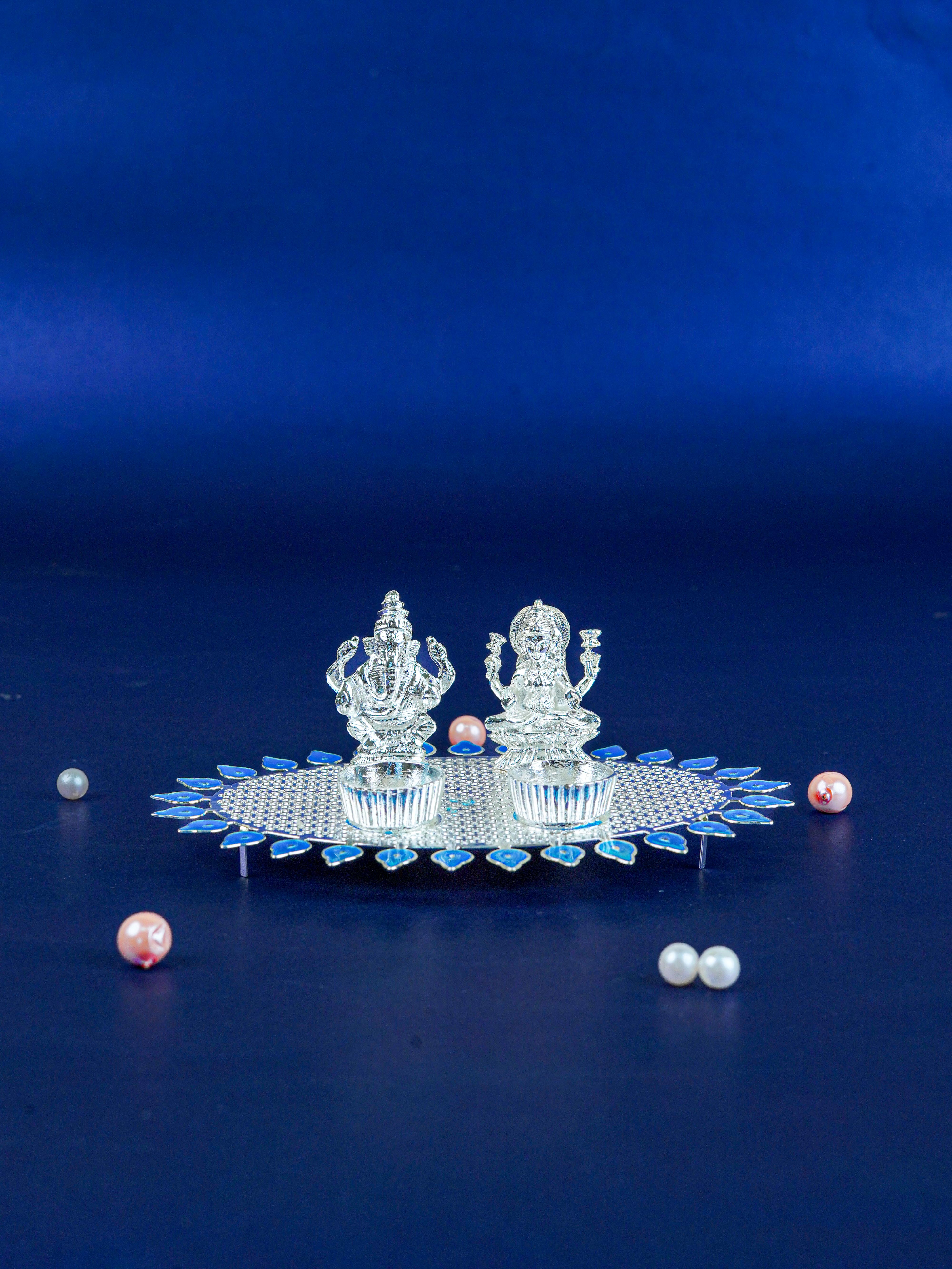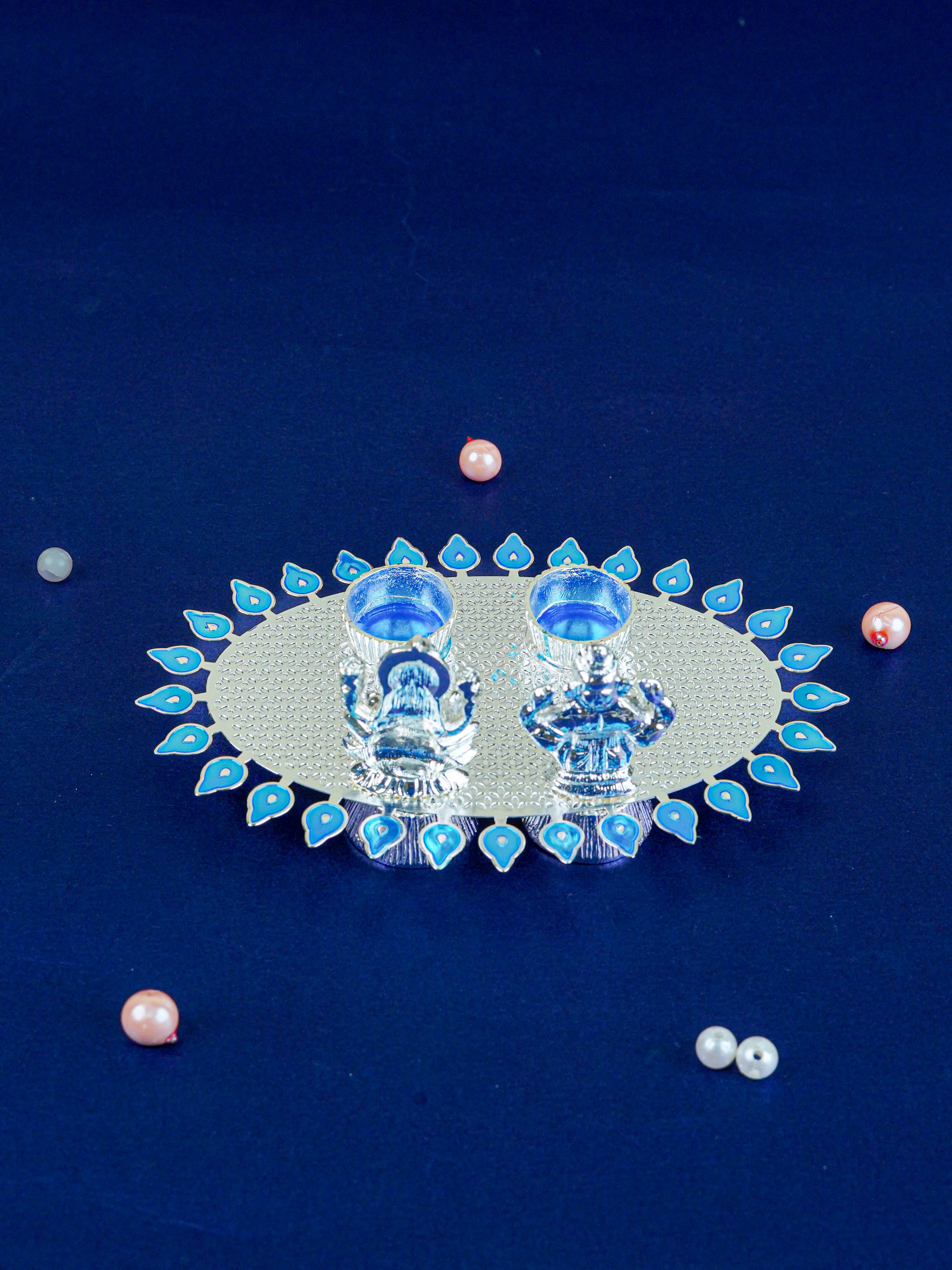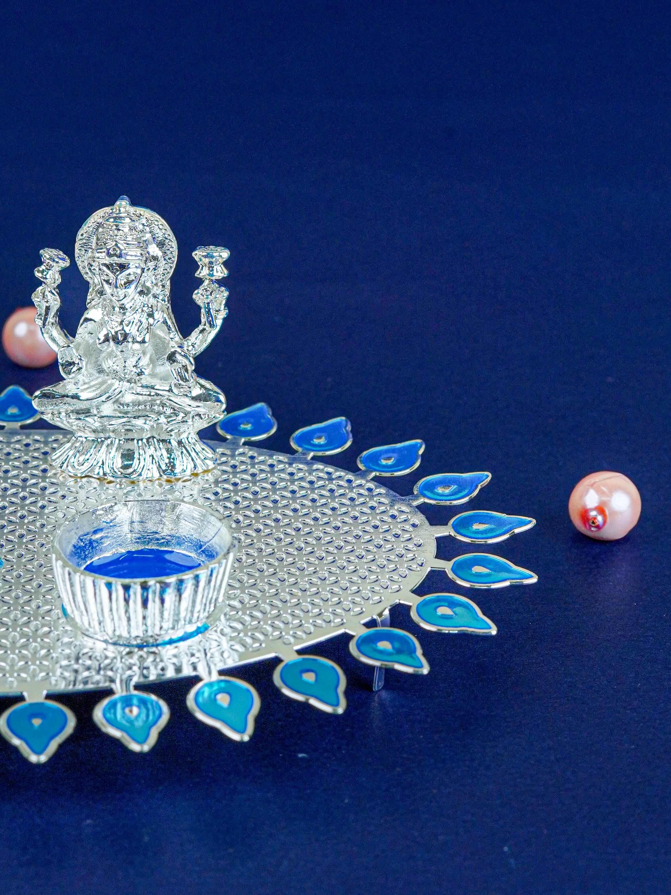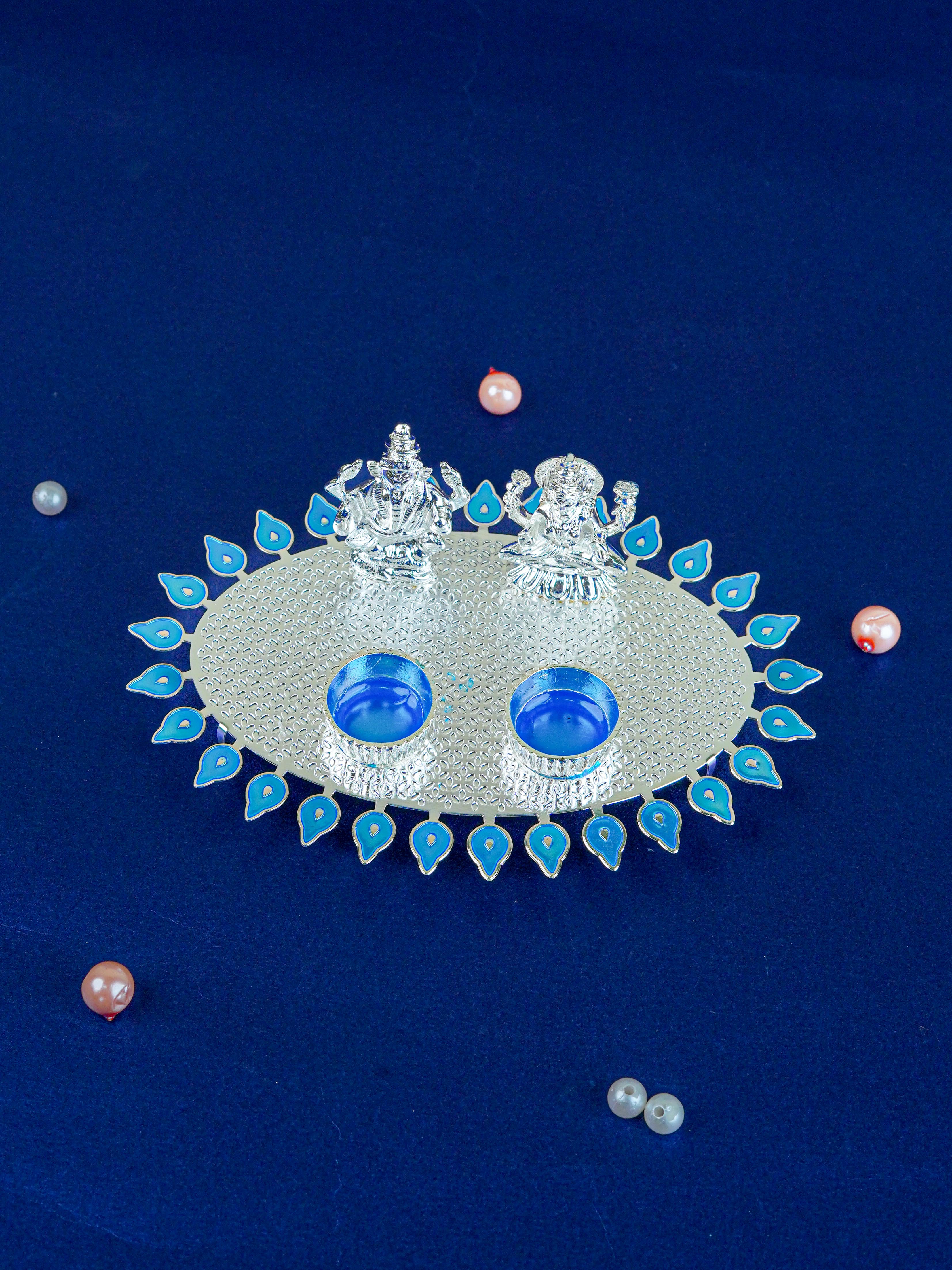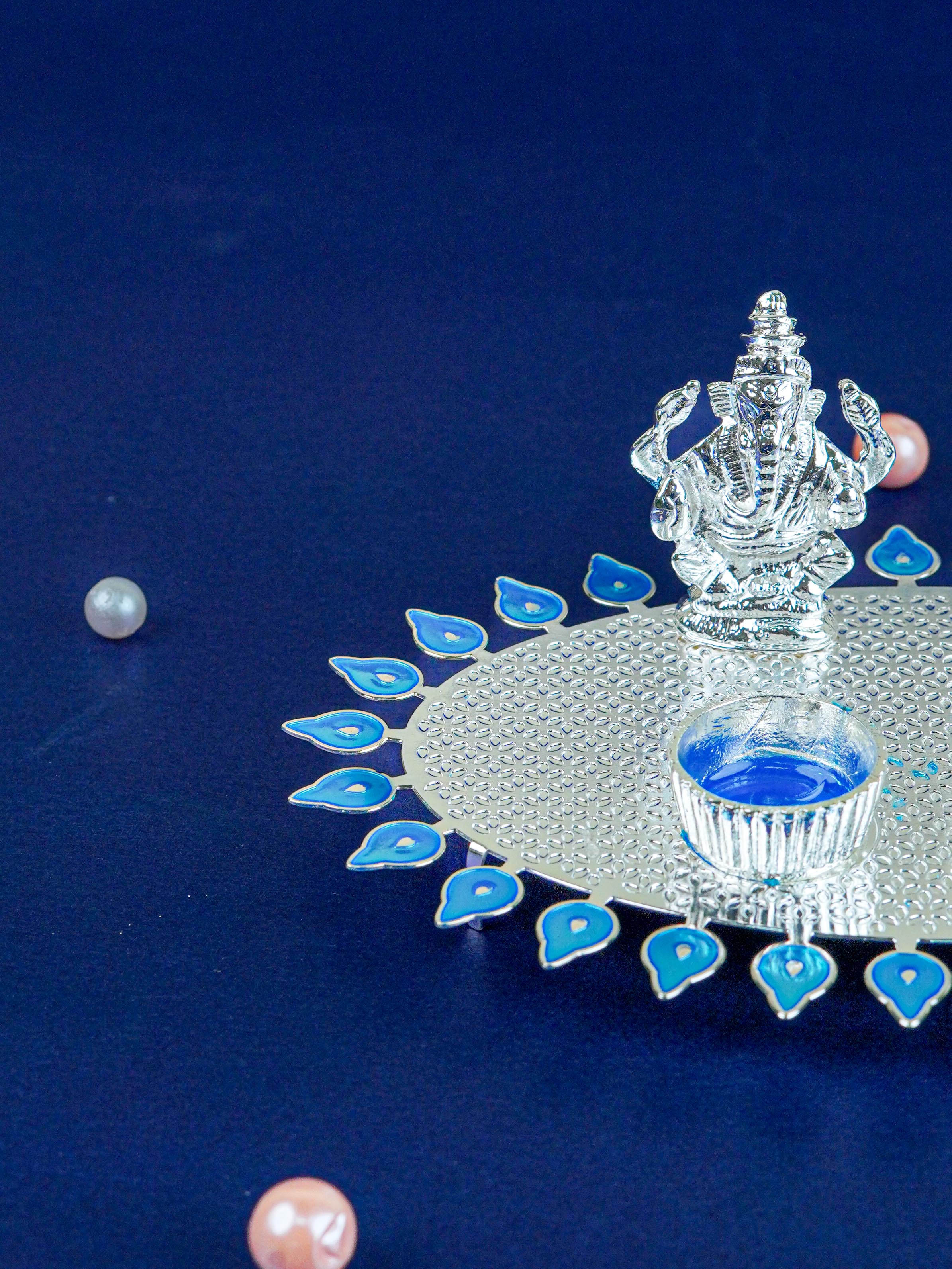 White Metal Lakshmi Ganesha Kumkum Holder - Blue - WL5586-2