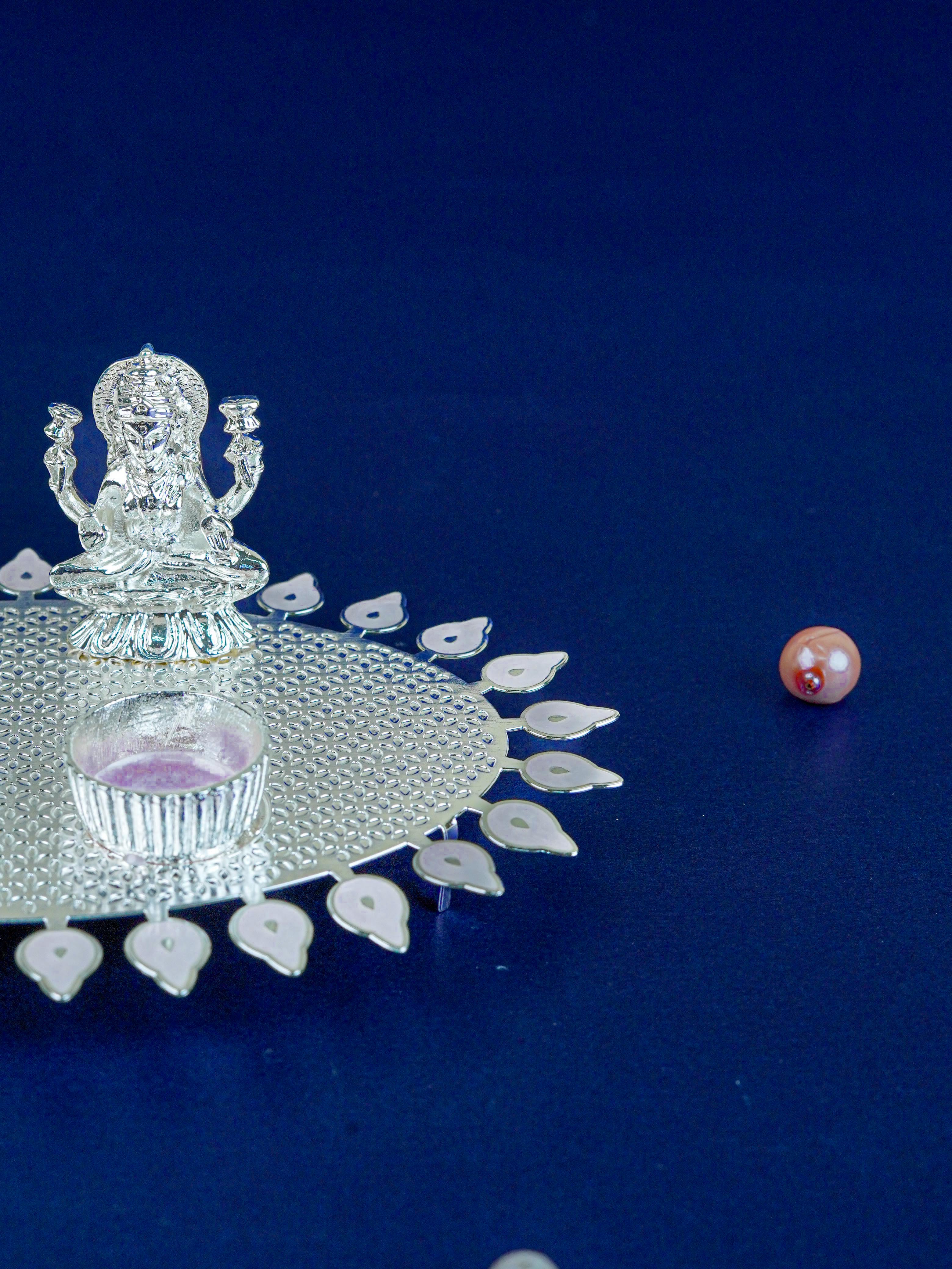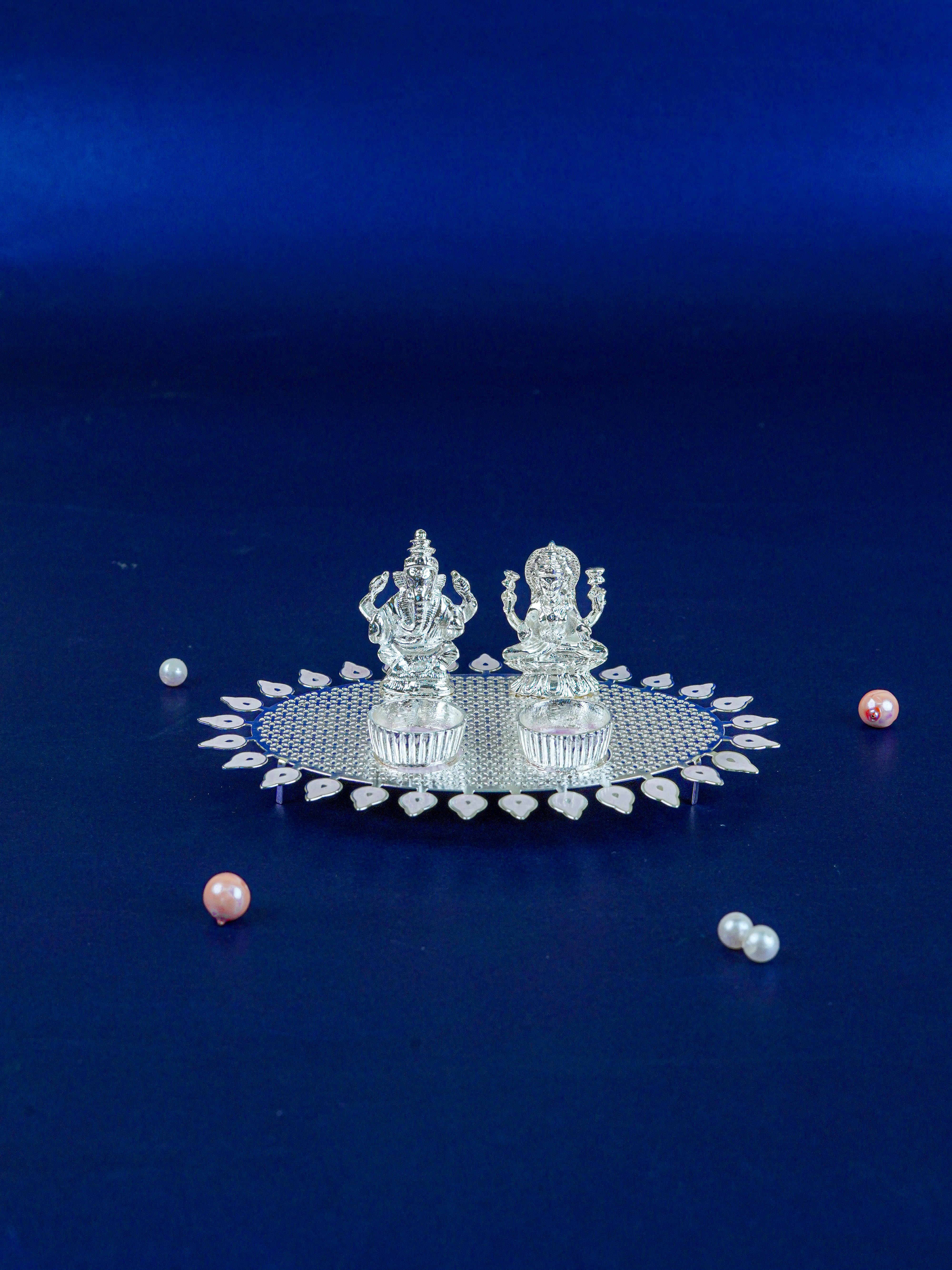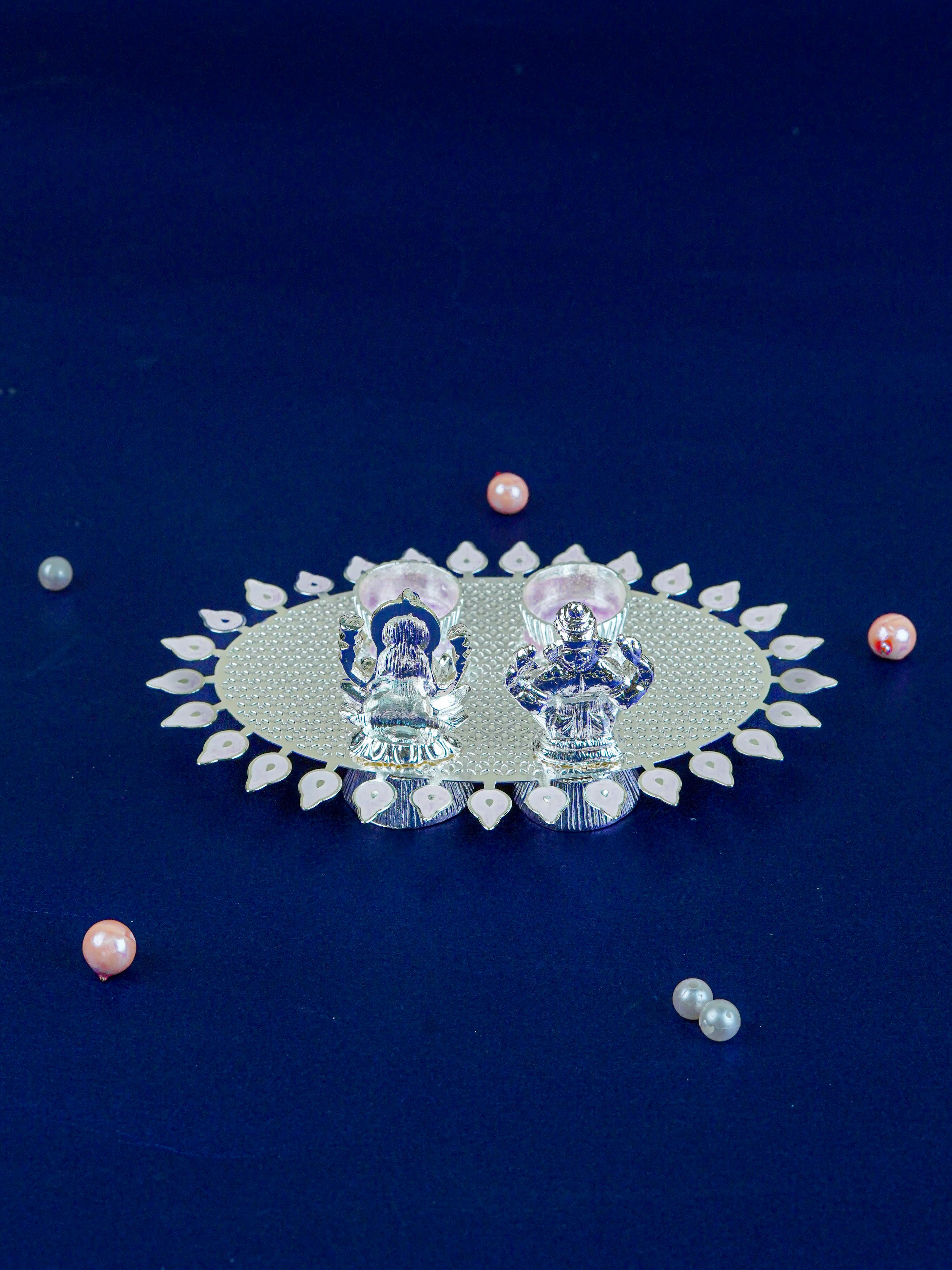 - This Kumkum Holder Features Two Intricately Crafted Silver-Toned Idols, Placed Side-by-Side on a Decorative Circular Base.