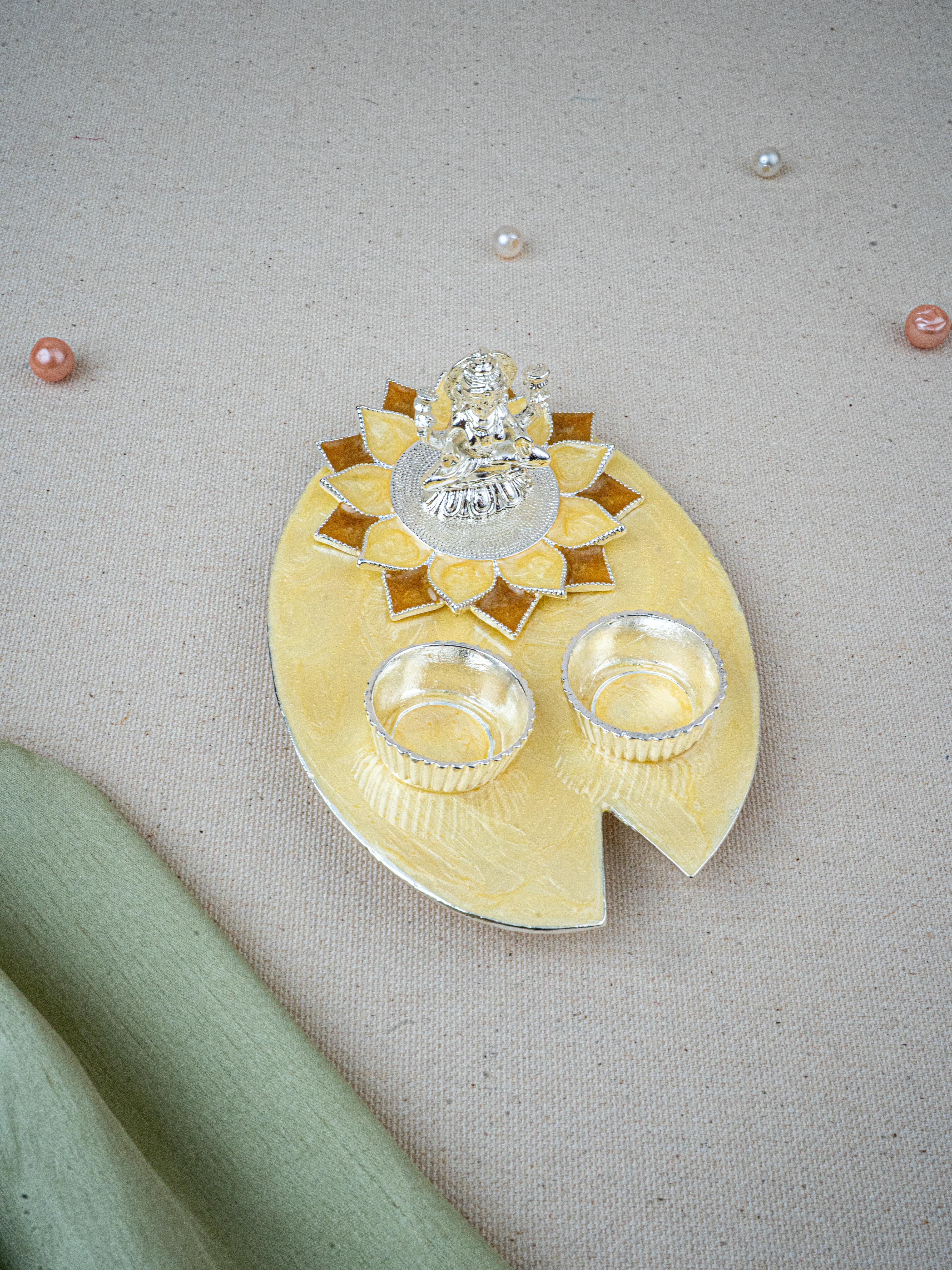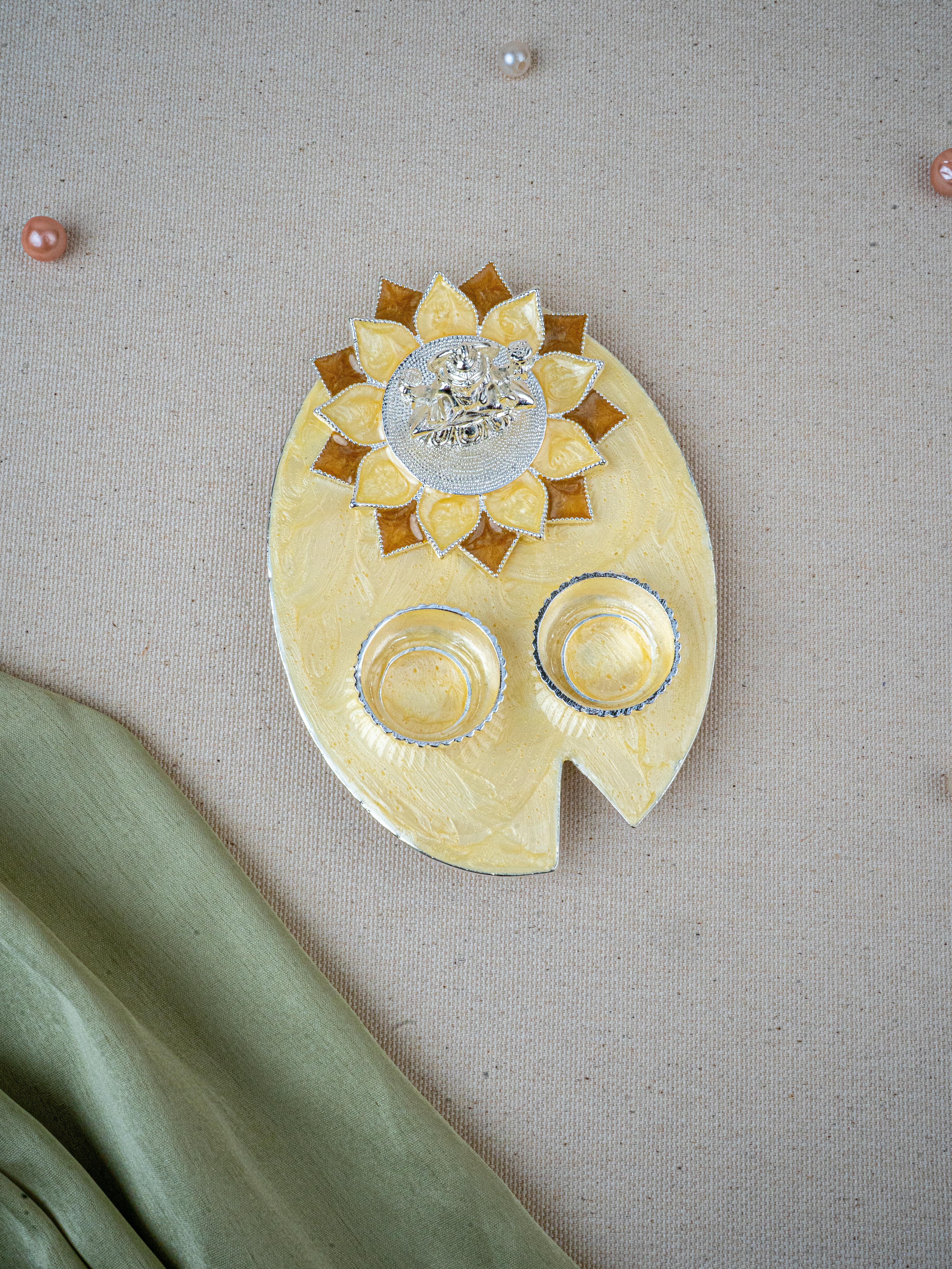 - Top of the Leaf with Small Statue of Lord Lakshmi, the Remover of Obstacles and the Deity of Auspicious Beginnings. He is Seated and Placed over a Colorful Lotus.