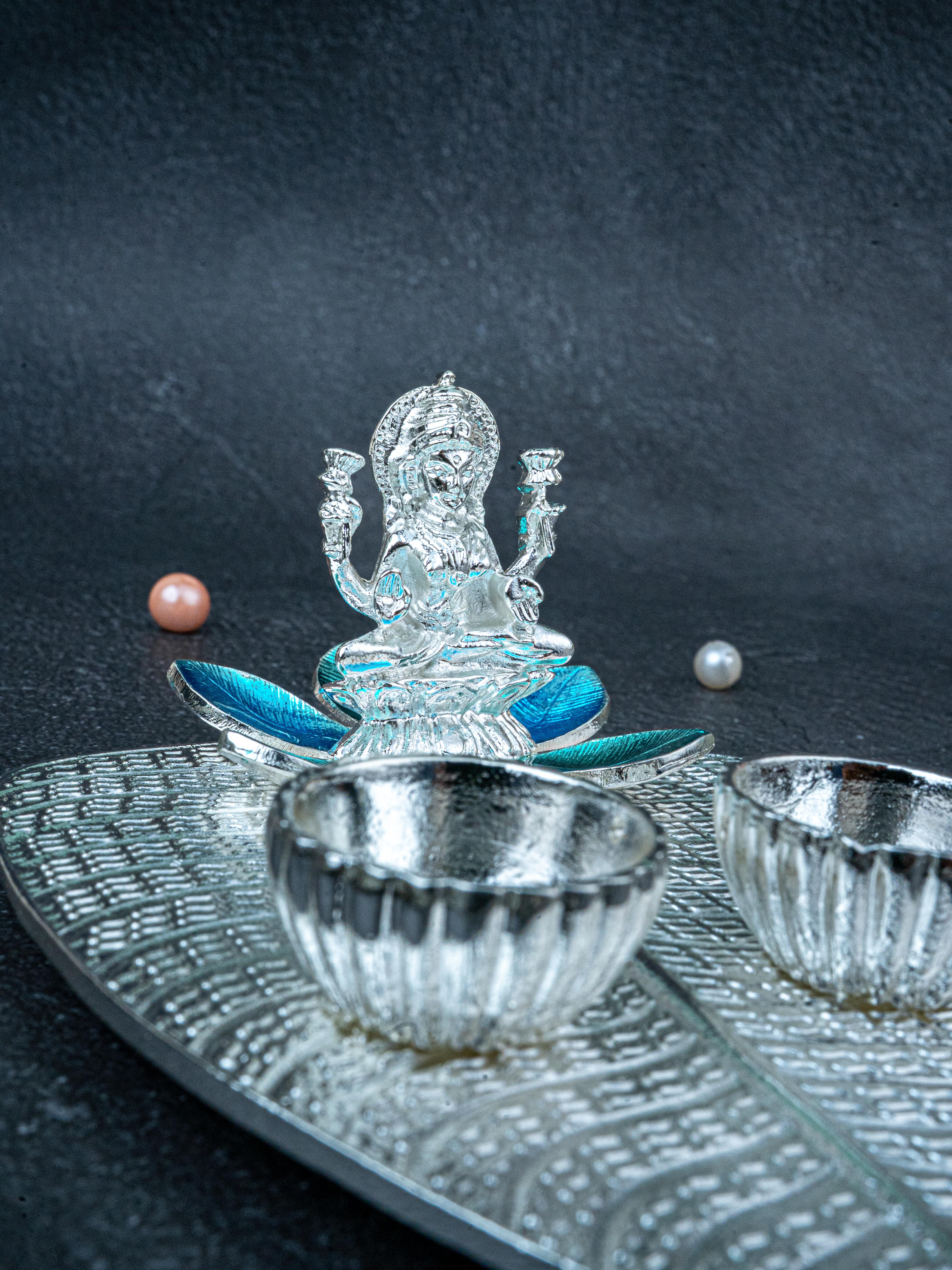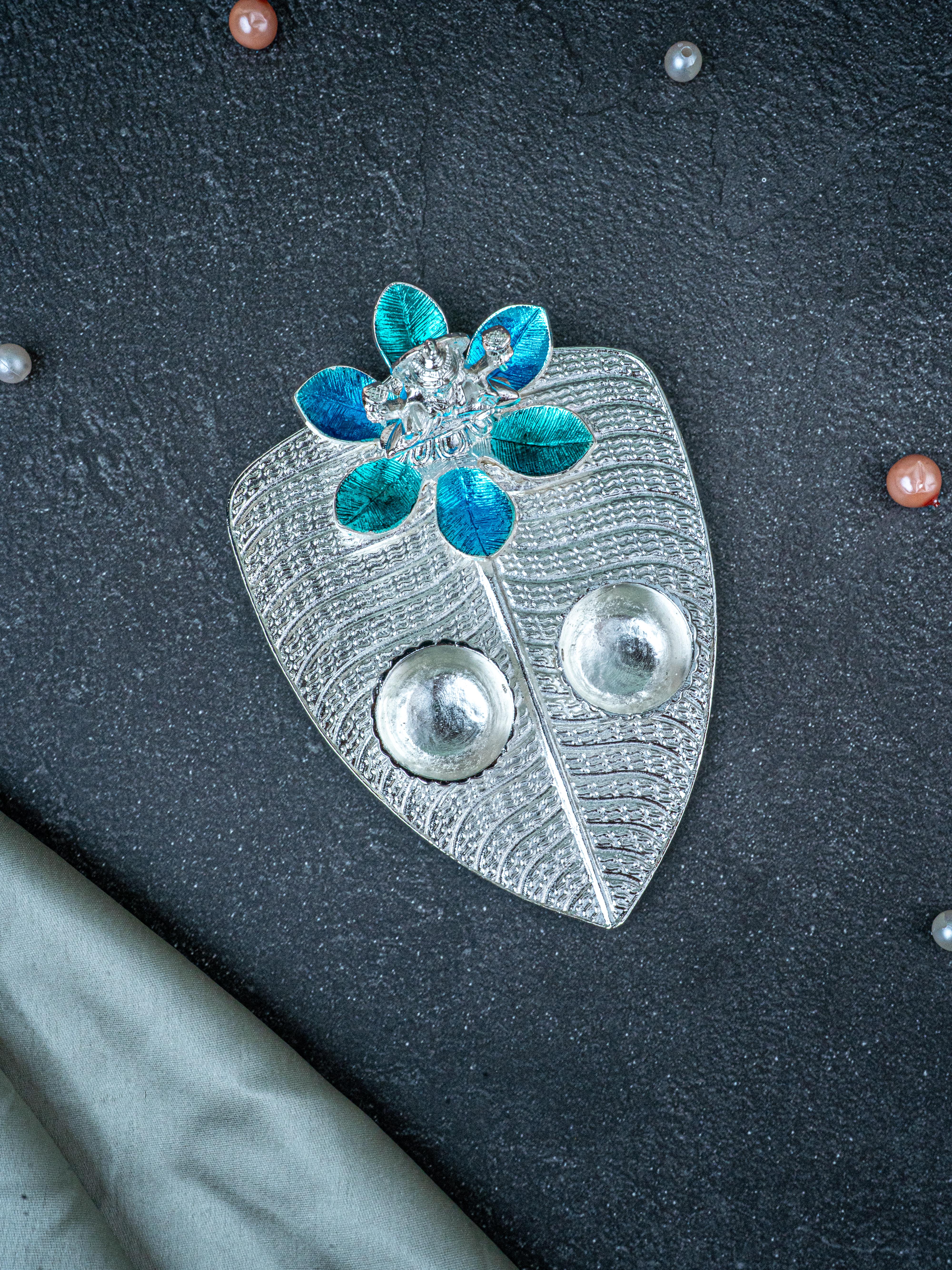 - Top of the Leaf with Small Statue of Lord Lakshmi, is Seated and Placed over a Colorful Lotus with Blue & Green Stones on Petals.