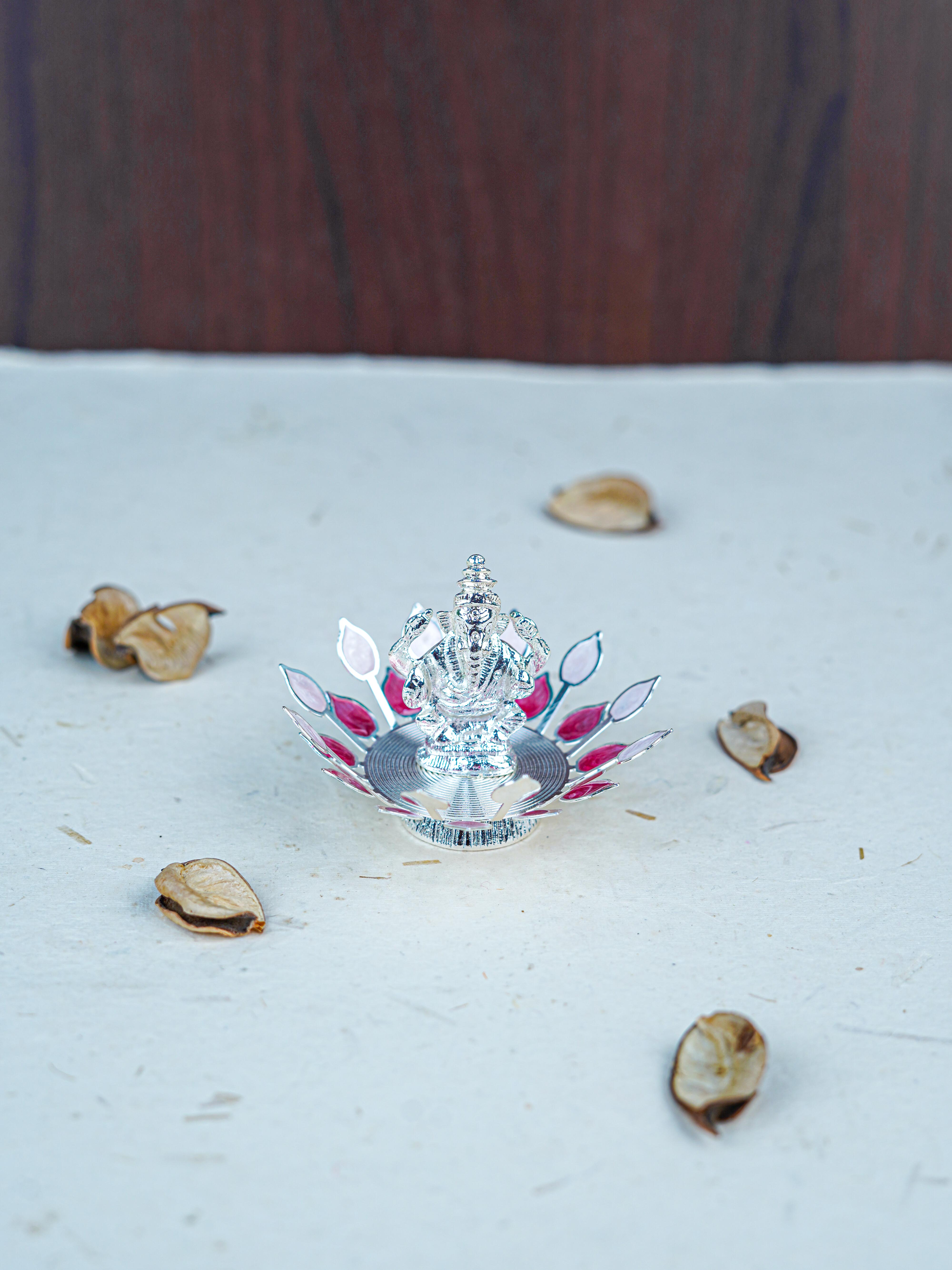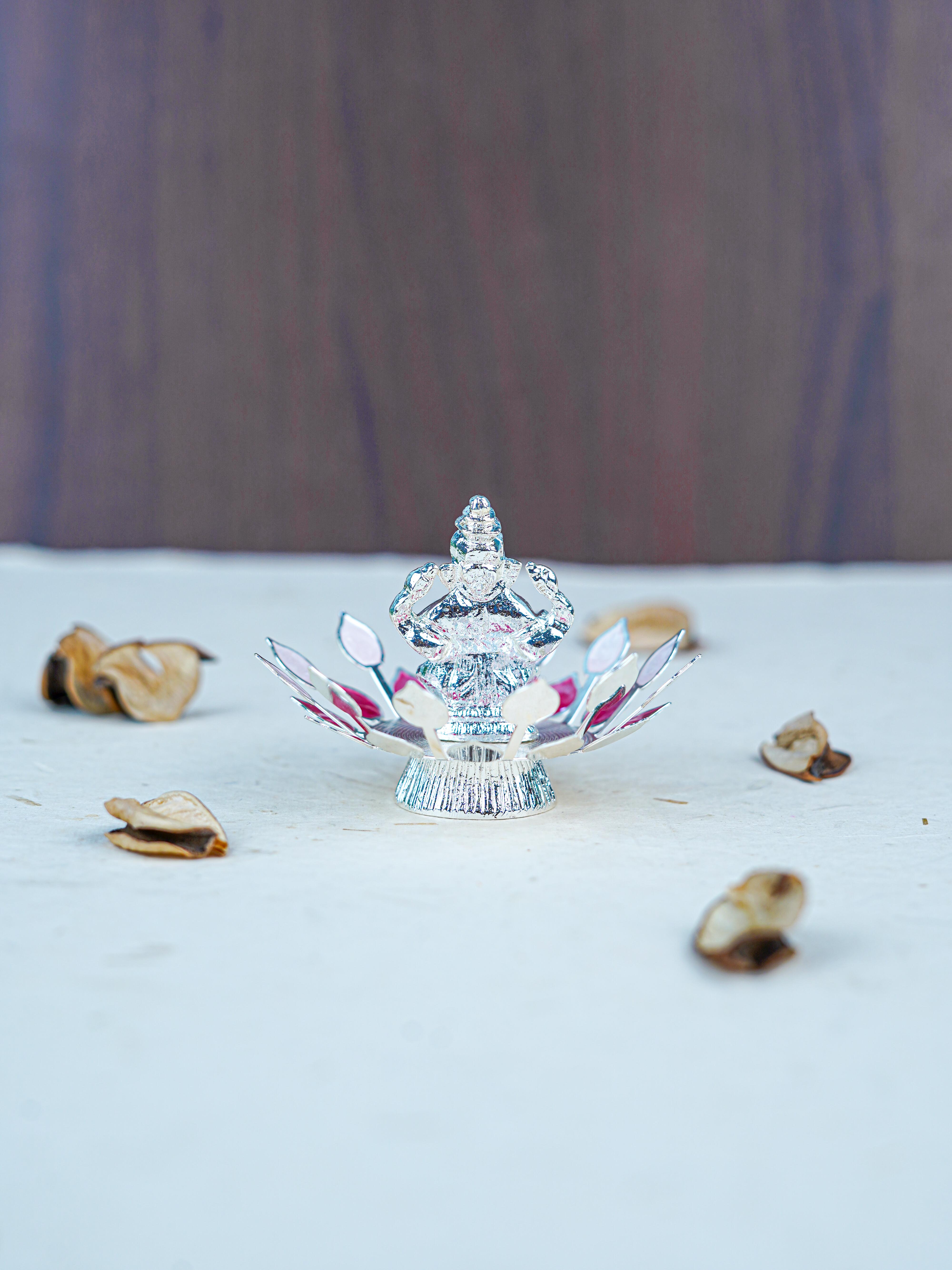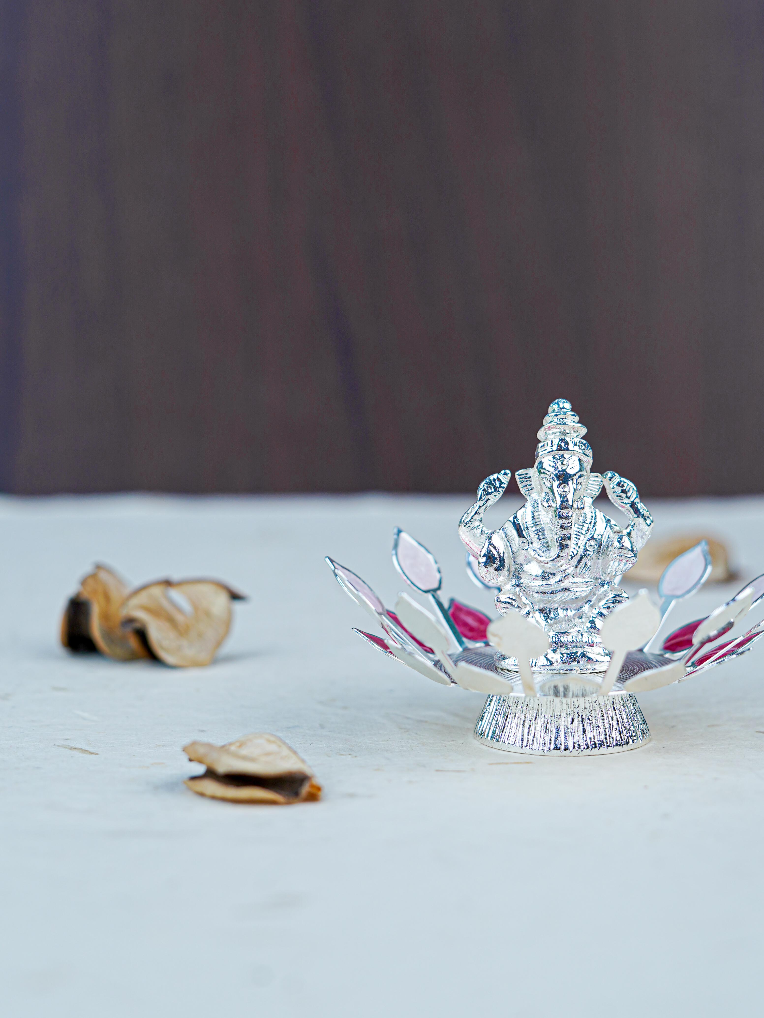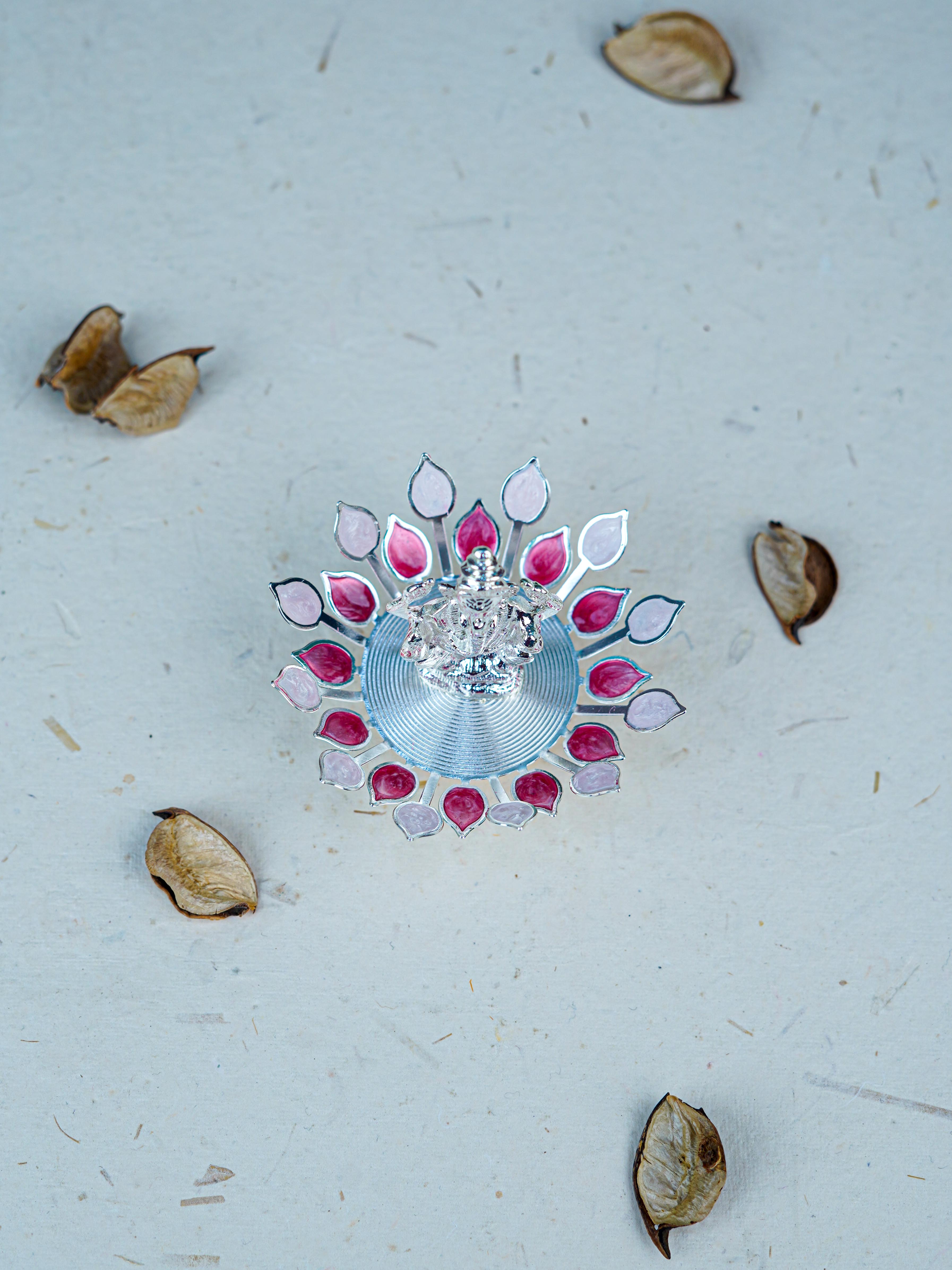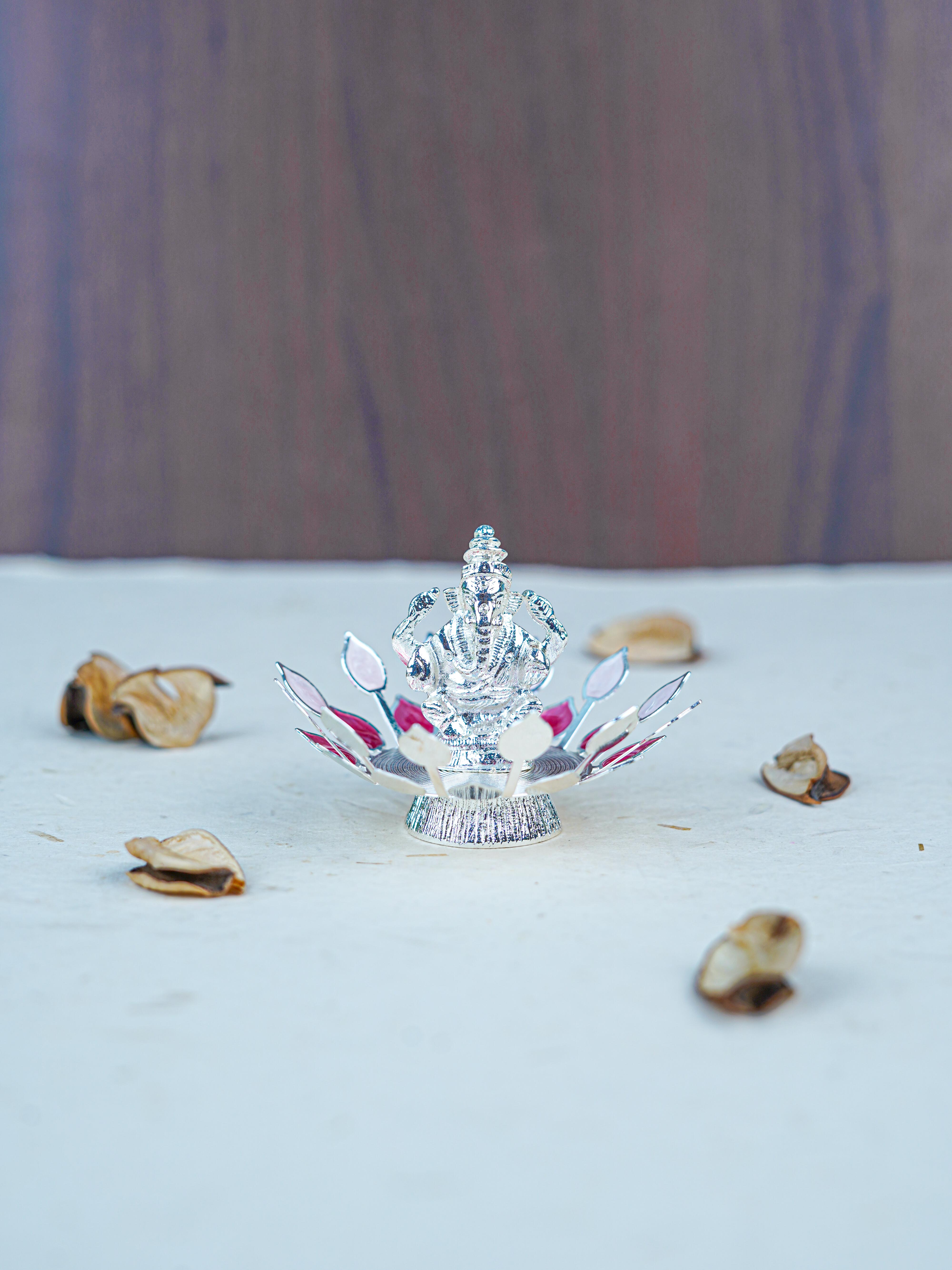 - White Metal Lord Ganesha Surrounded by Petal-like Extensions Radiating Outward, Resembling Sun Rays.