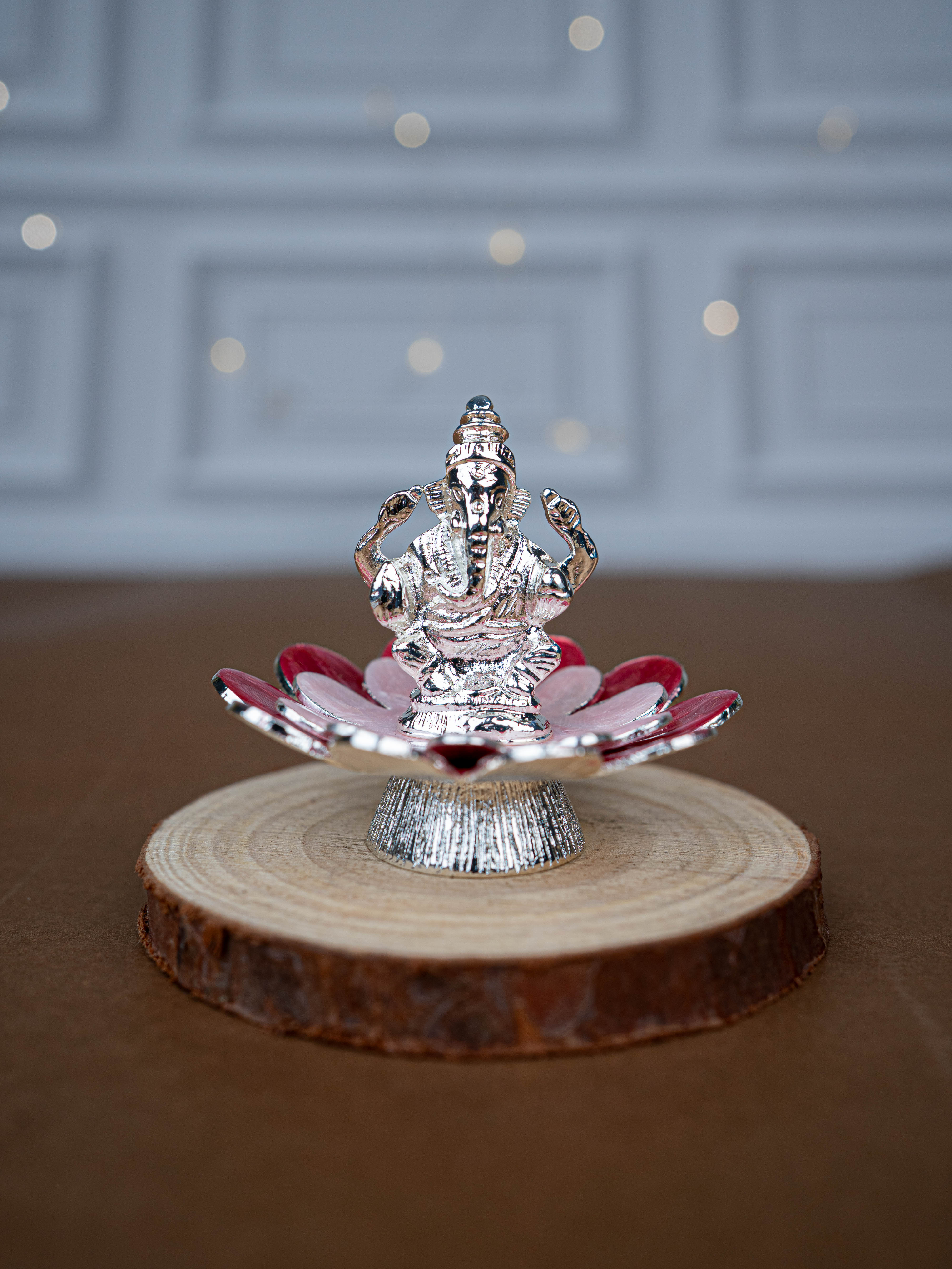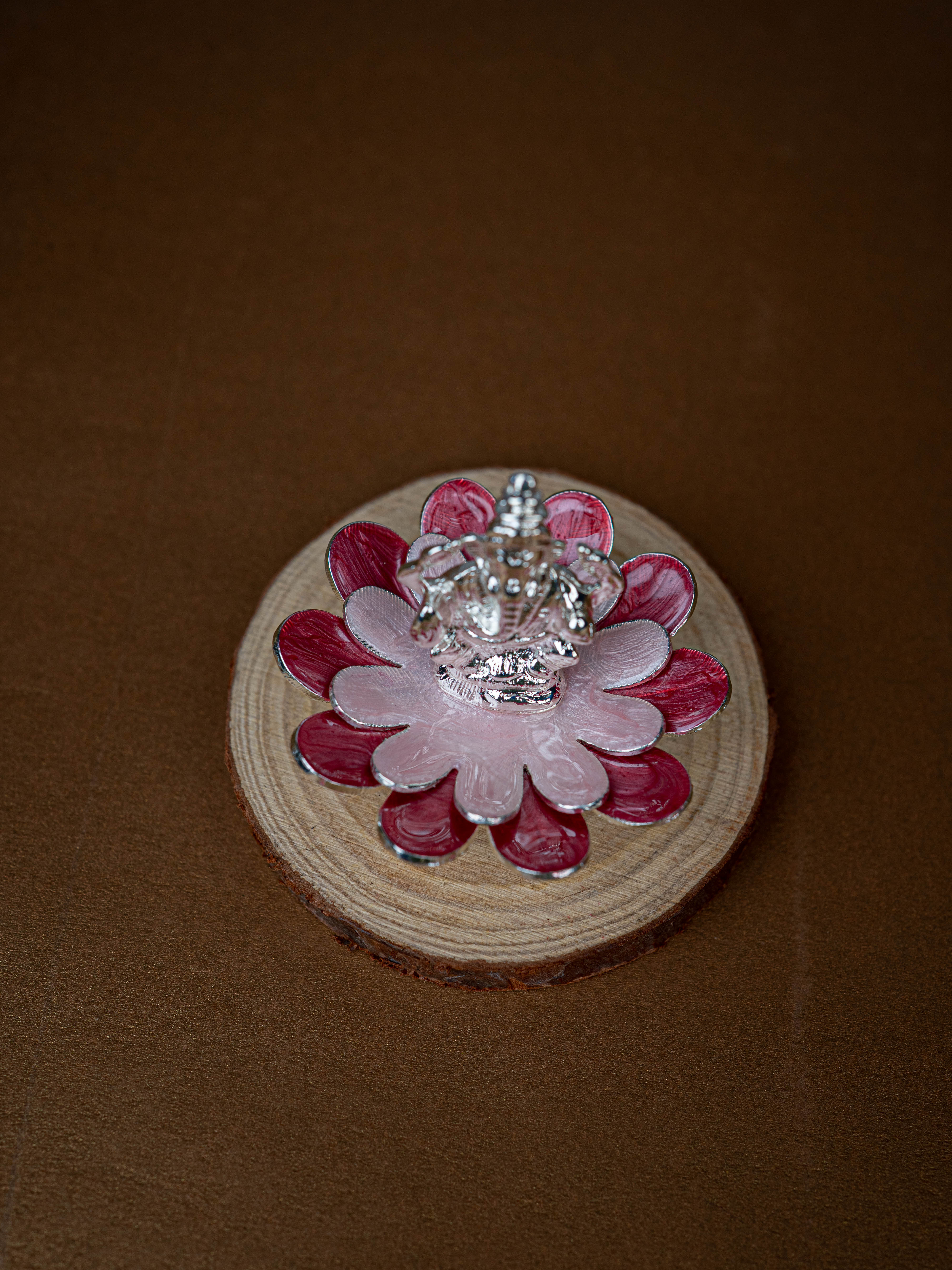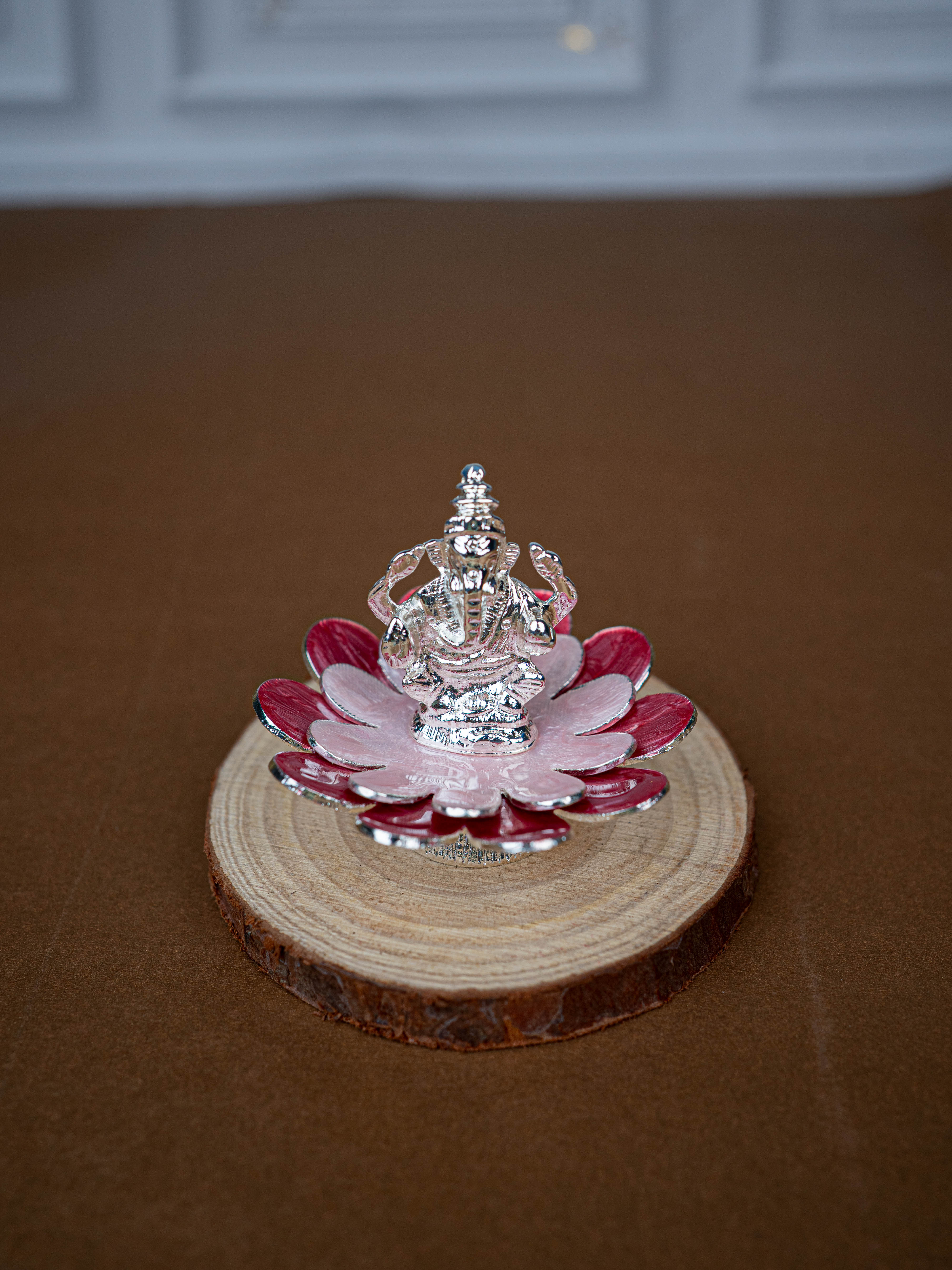 White Metal Lord Ganesha on Floral Base - Pink - WL5502-1