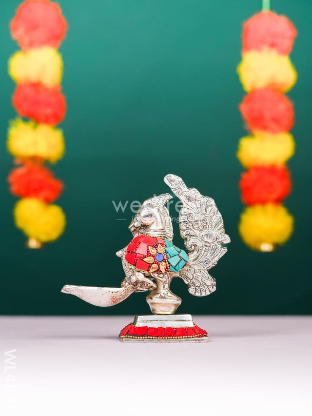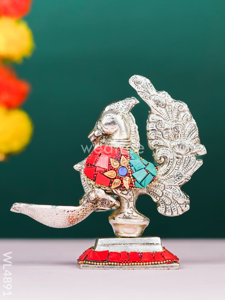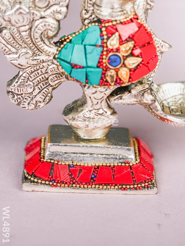 - This Elegant 5-inch Figurine Features a Majestic Peacock Adorned with Intricate Red Tile Work, Holding a Diya.