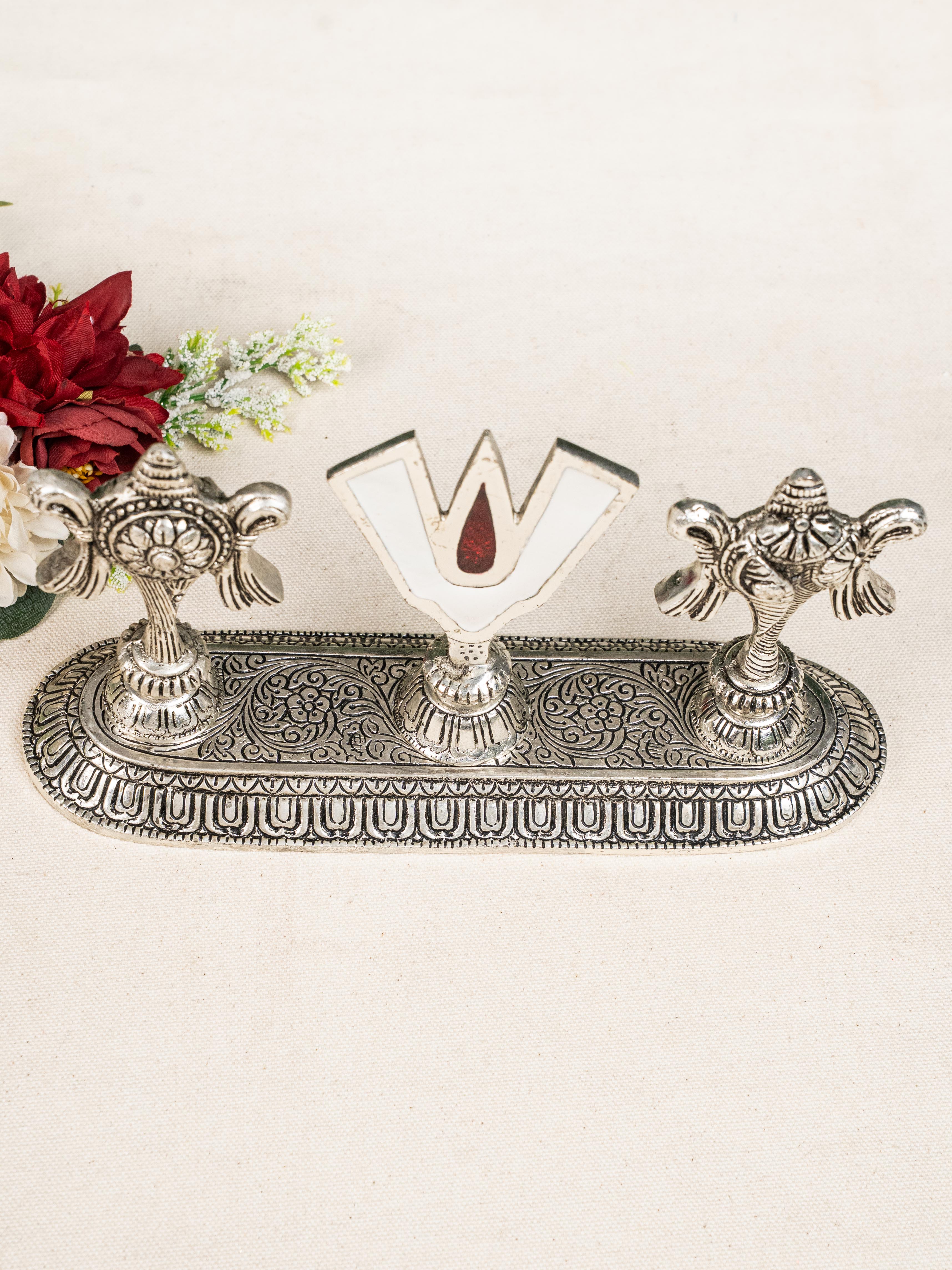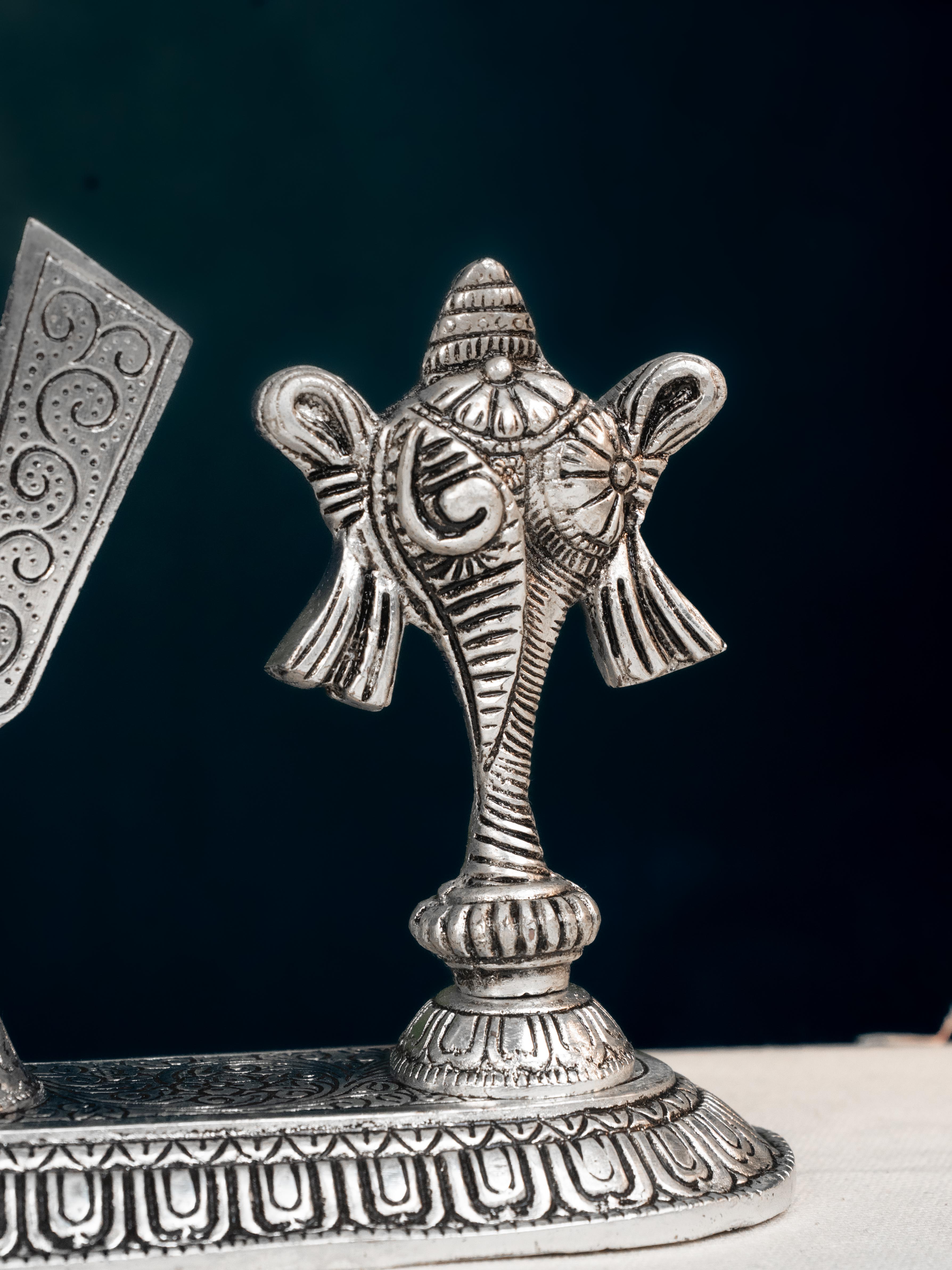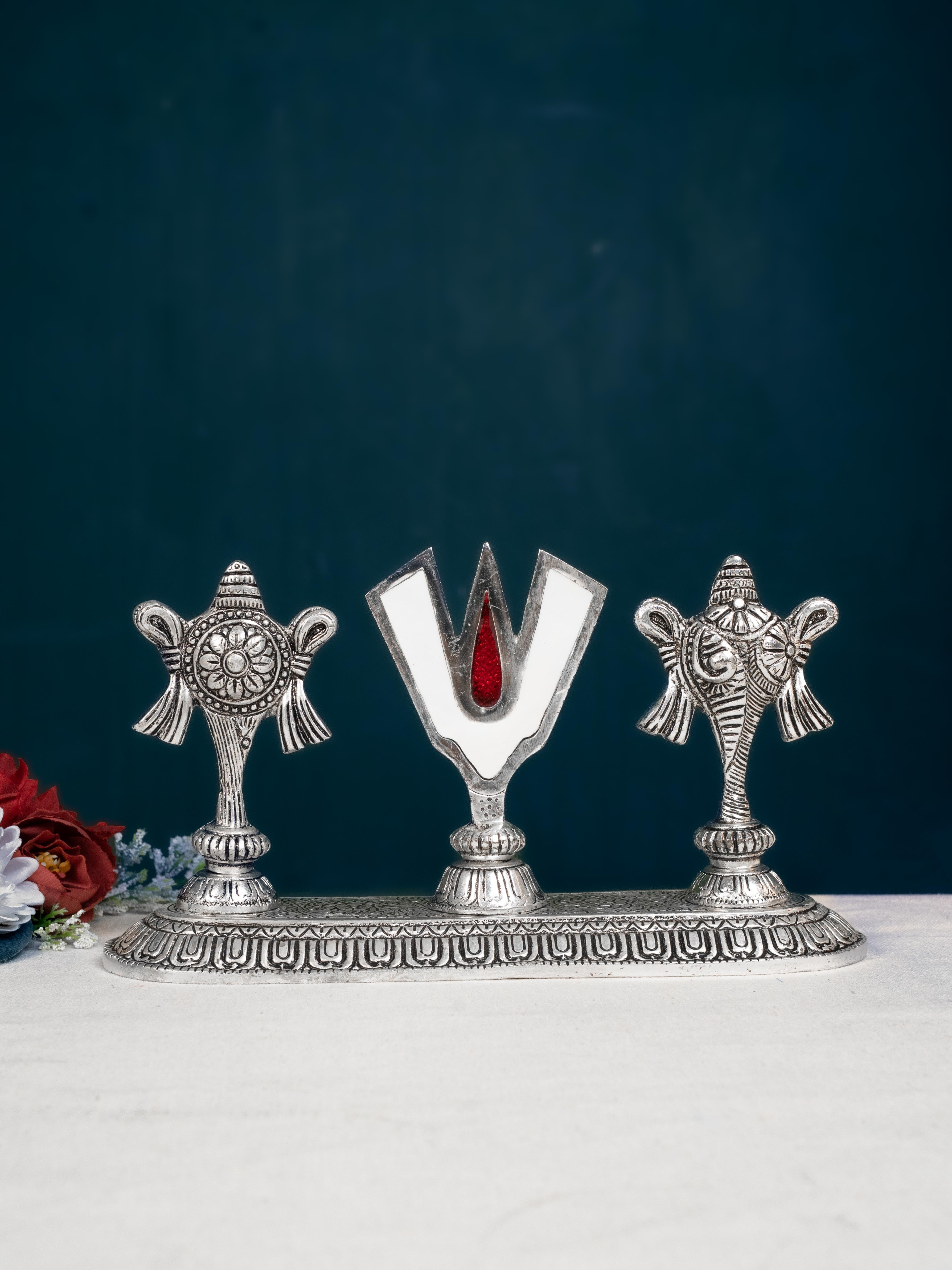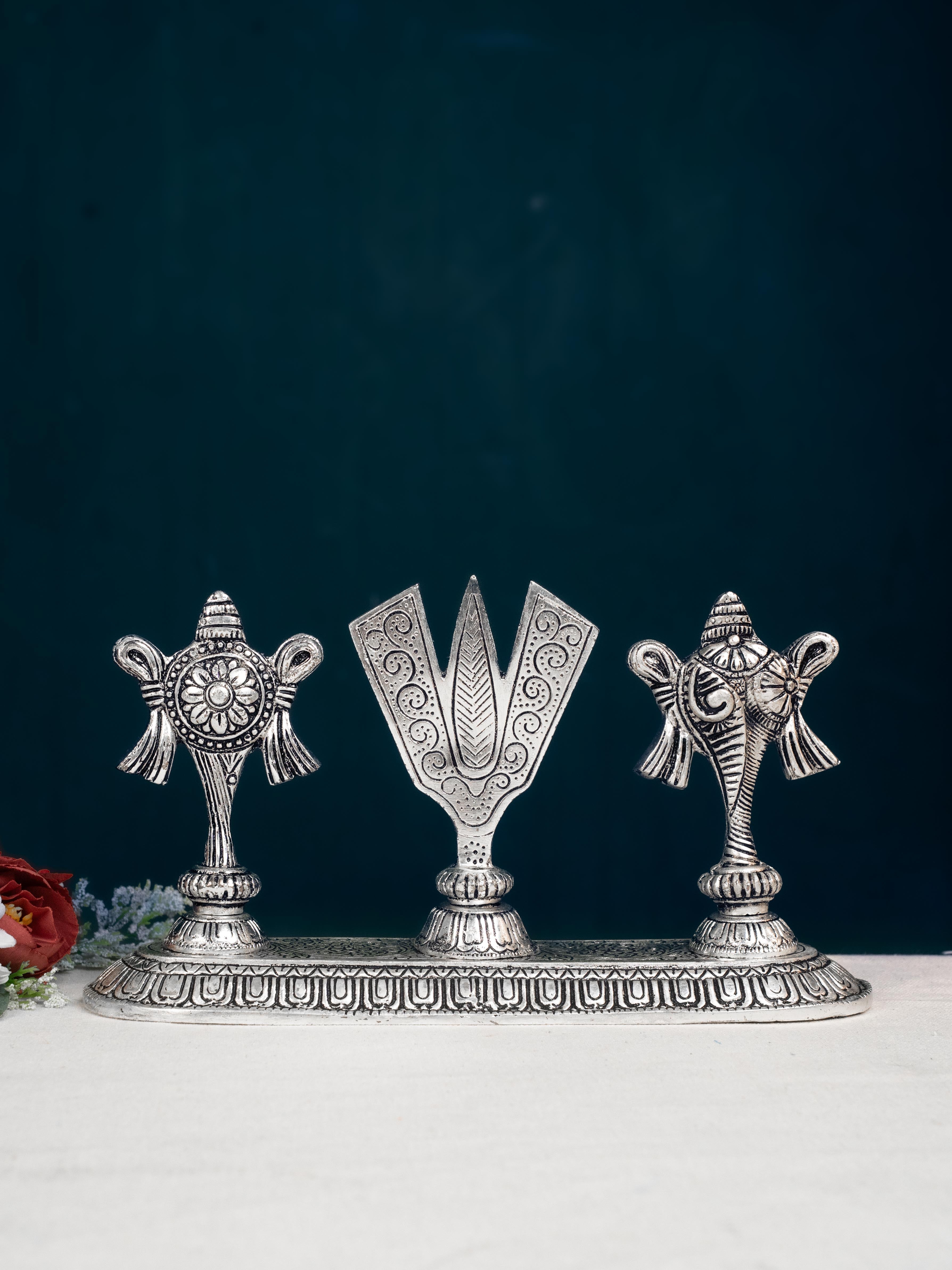 - Beautifully Crafted White Metal Vaishnav Symbol Set, Representing Sacred Emblems of Lord Vishnu Worship.