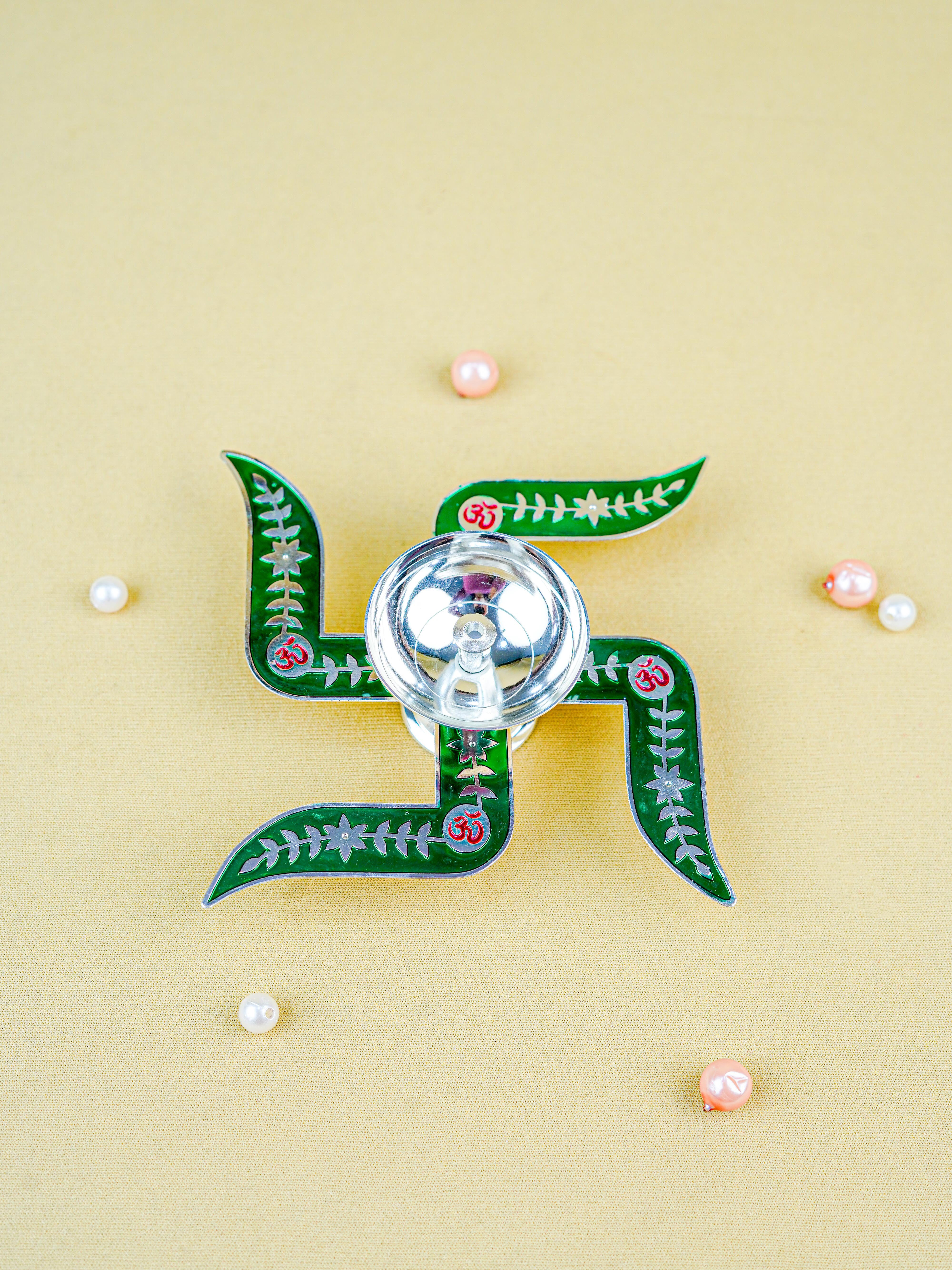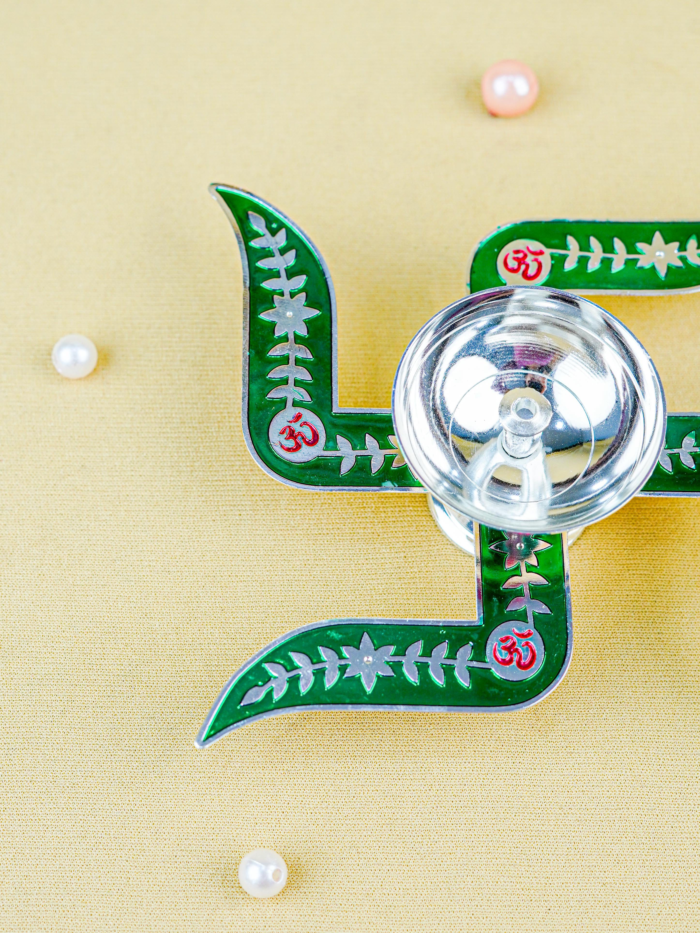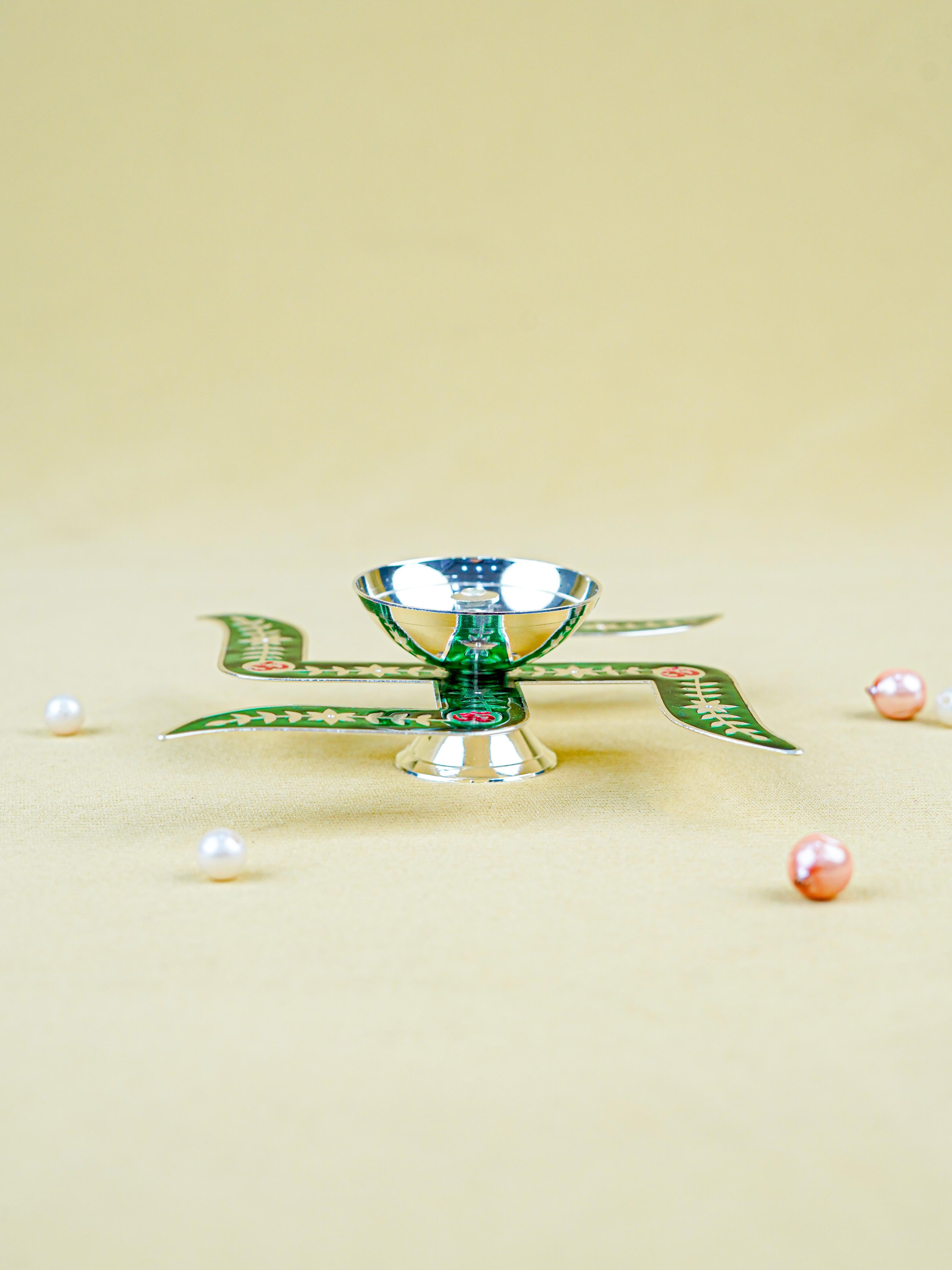 White Metal Swastik Shape Diya - Green - WL5549-2