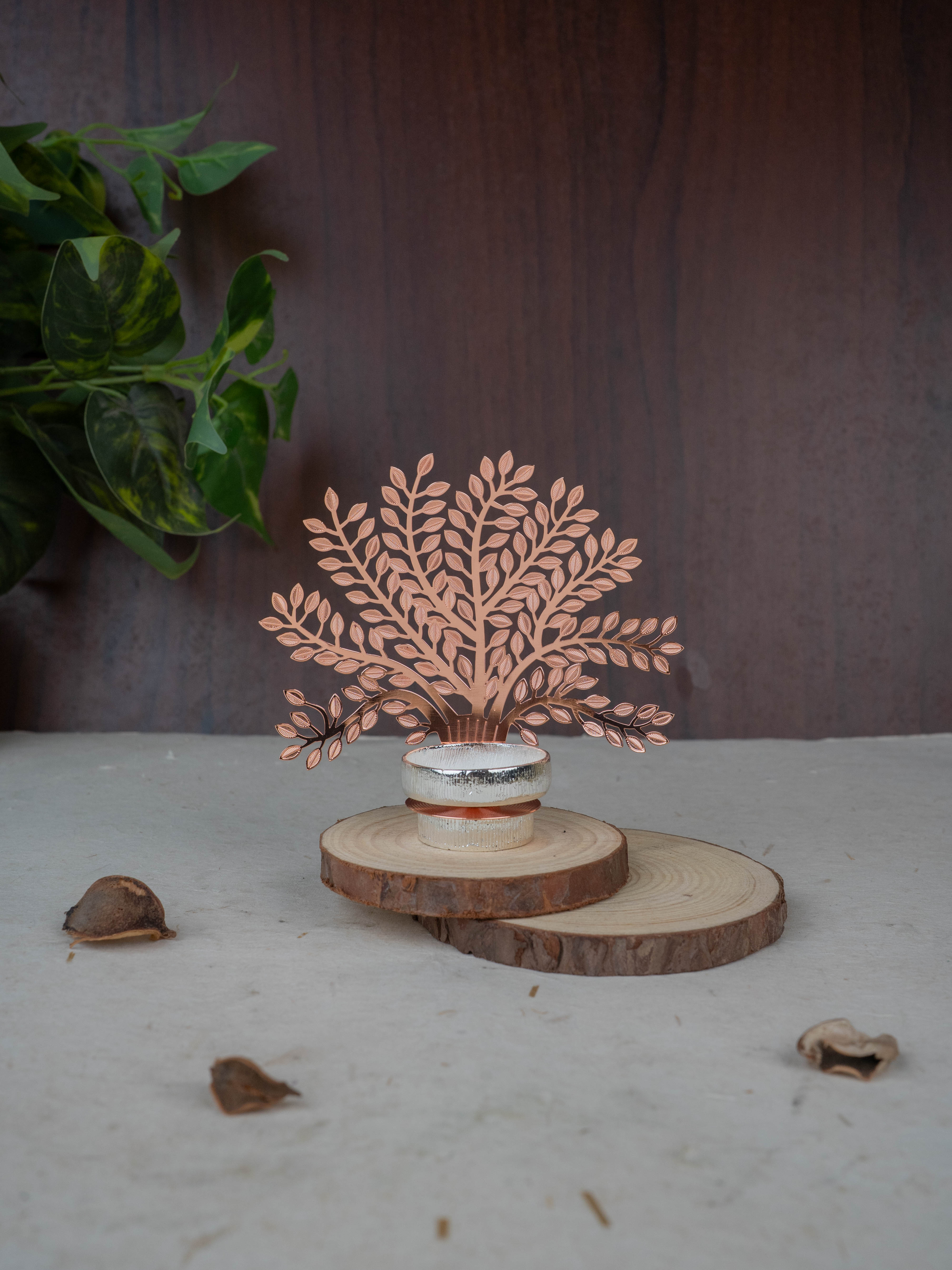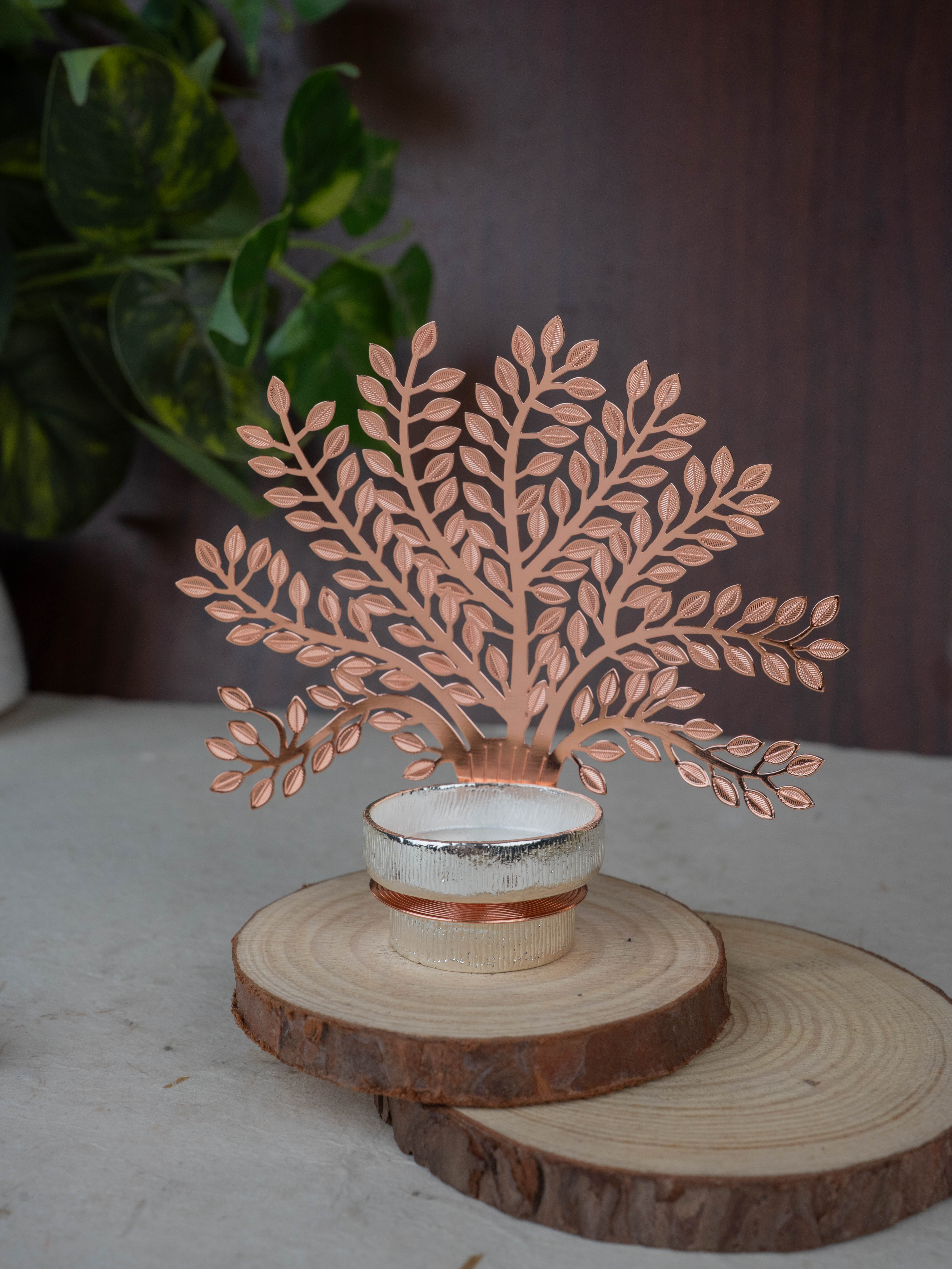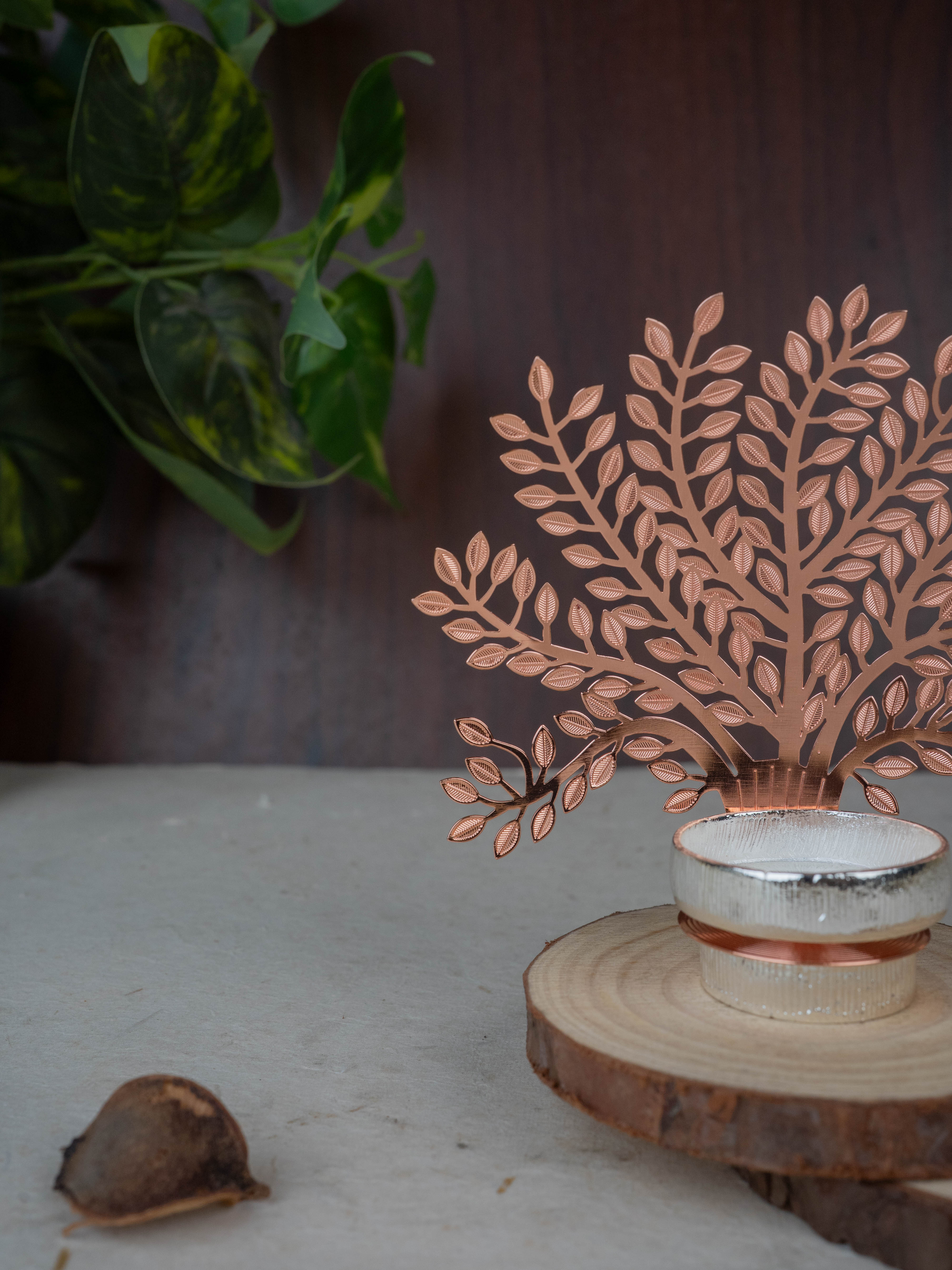 - Features Stylized Tree with Intricately Cut Branches and Leaves in a Soft Copper Tone, Symbolizing Growth and Prosperity.