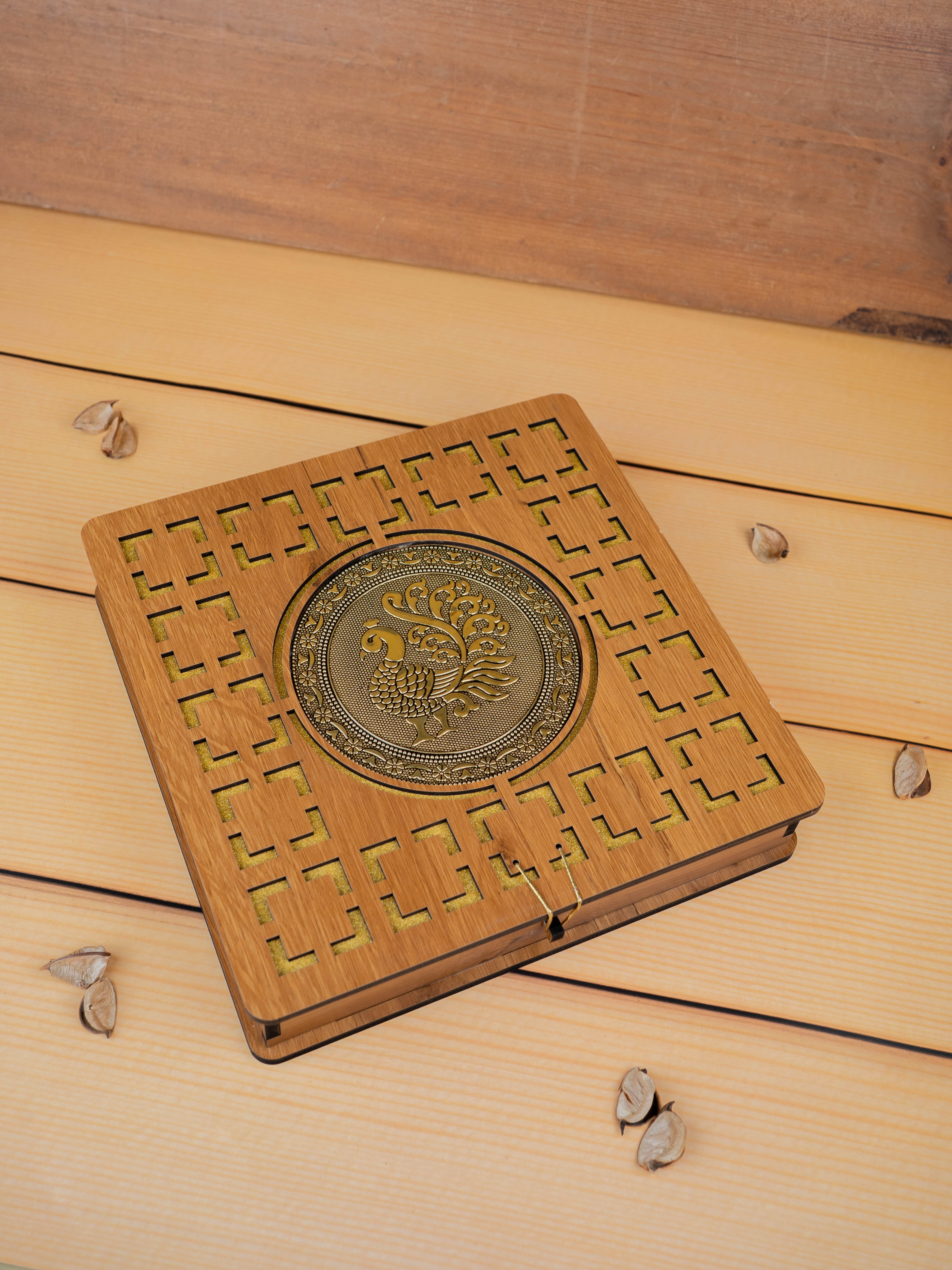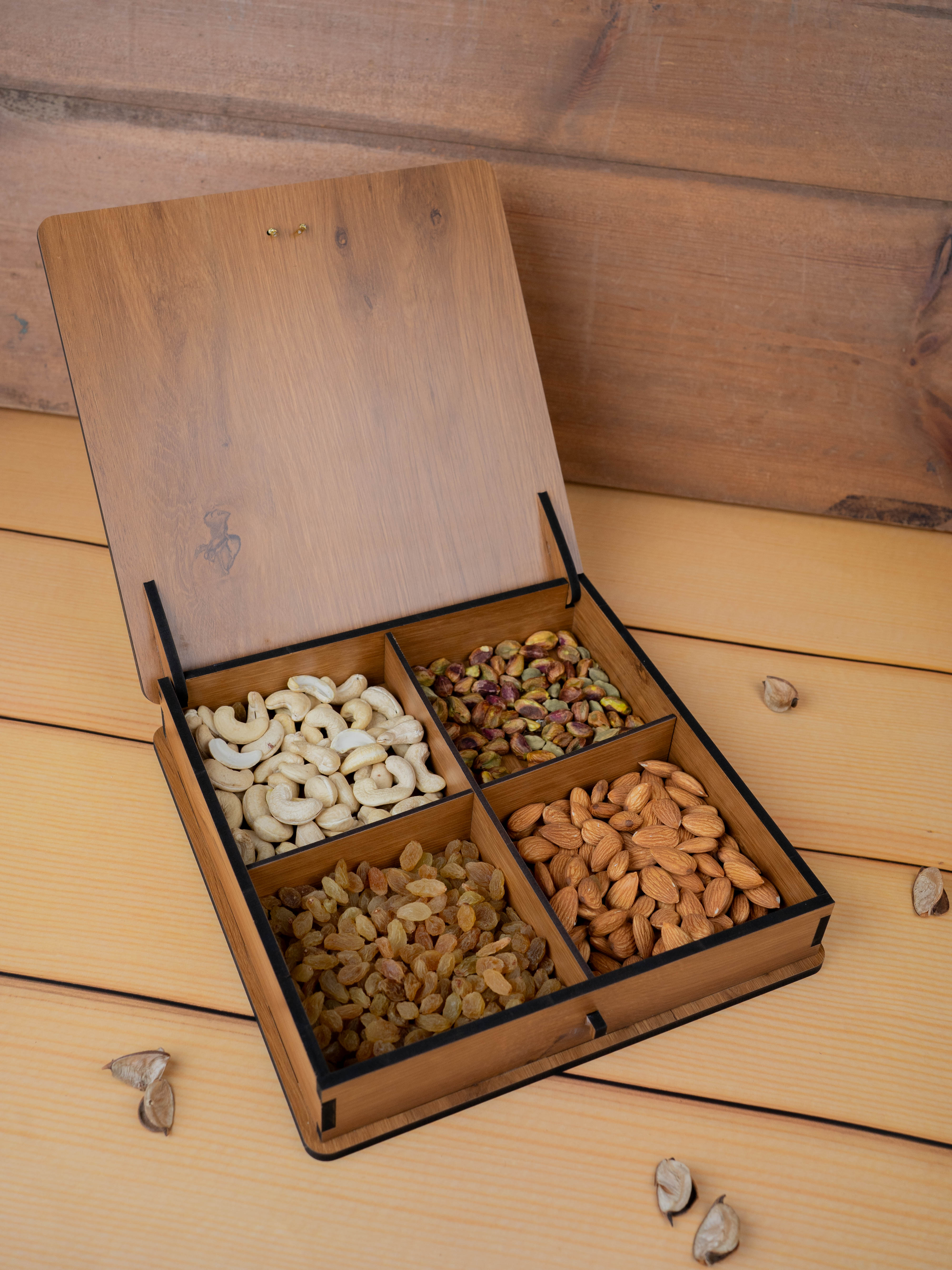 - Beautifully Designed Wooden Dry Fruit Box with a Rich, Traditional Aesthetic. This Box features a Square Shape with a Wooden Finish, Giving it a Warm and Premium Look.