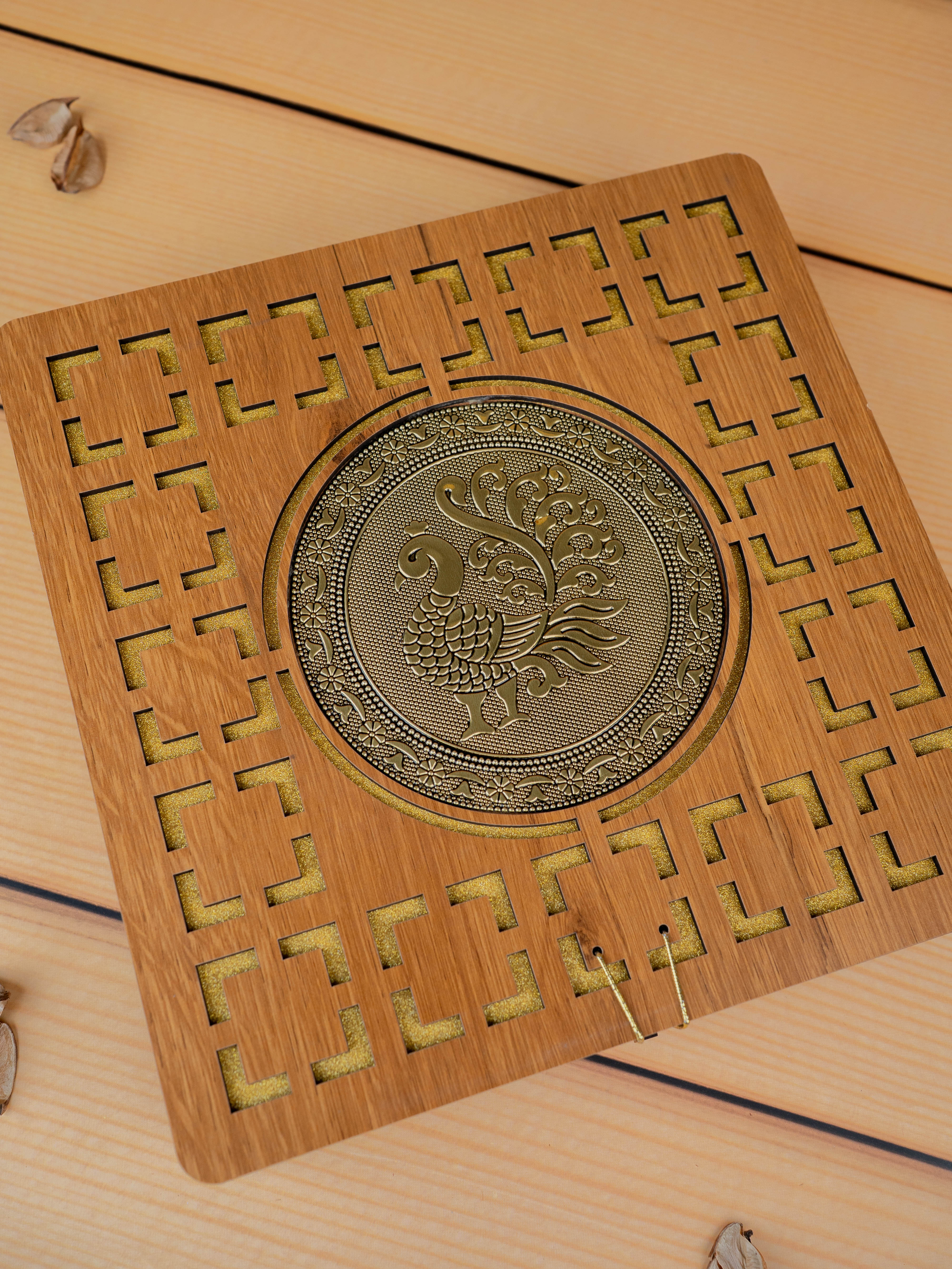 - Intricately Embossed Round Metal at the Center, Showcasing a Detailed Peacock Design Surrounded by Ornate Patterns.