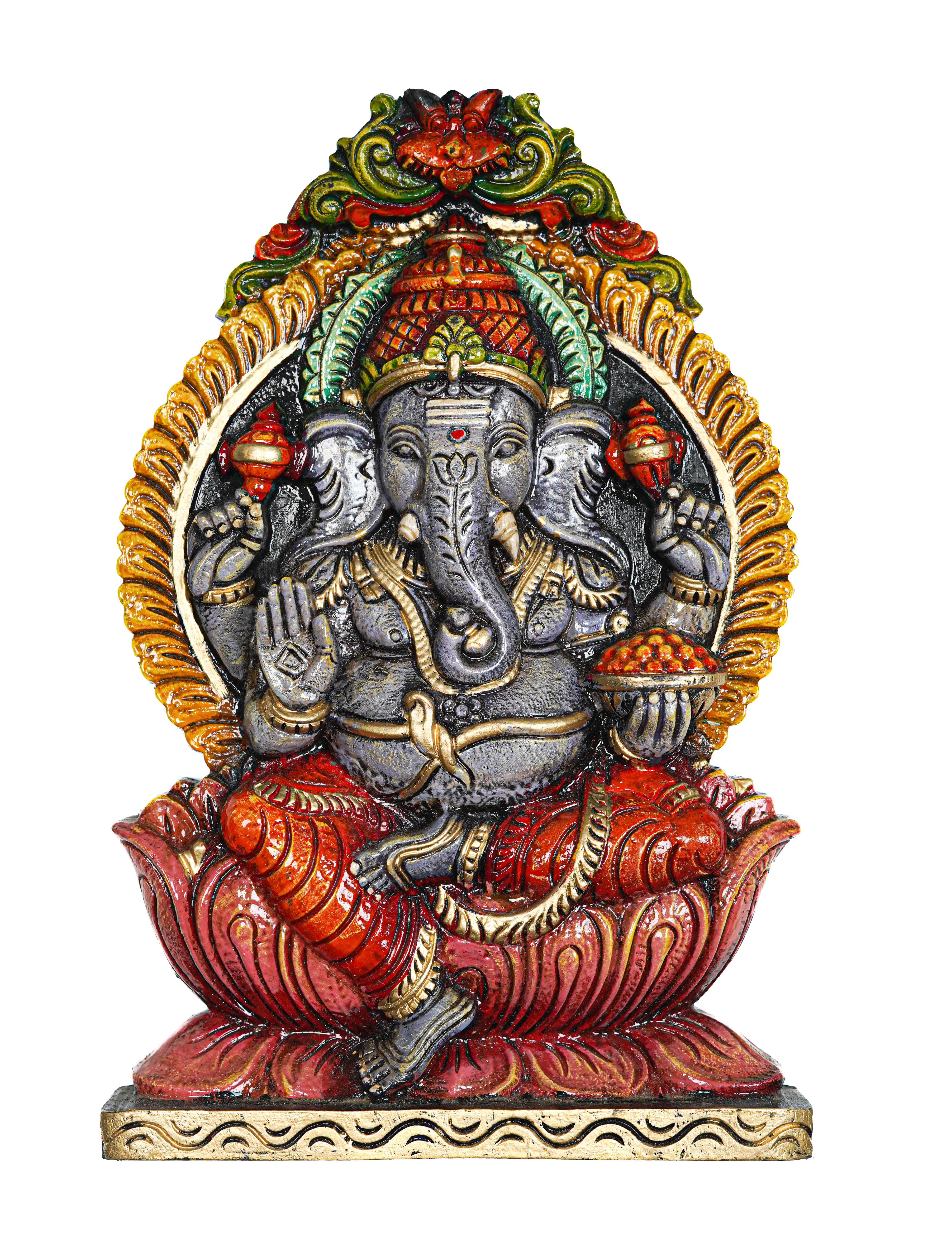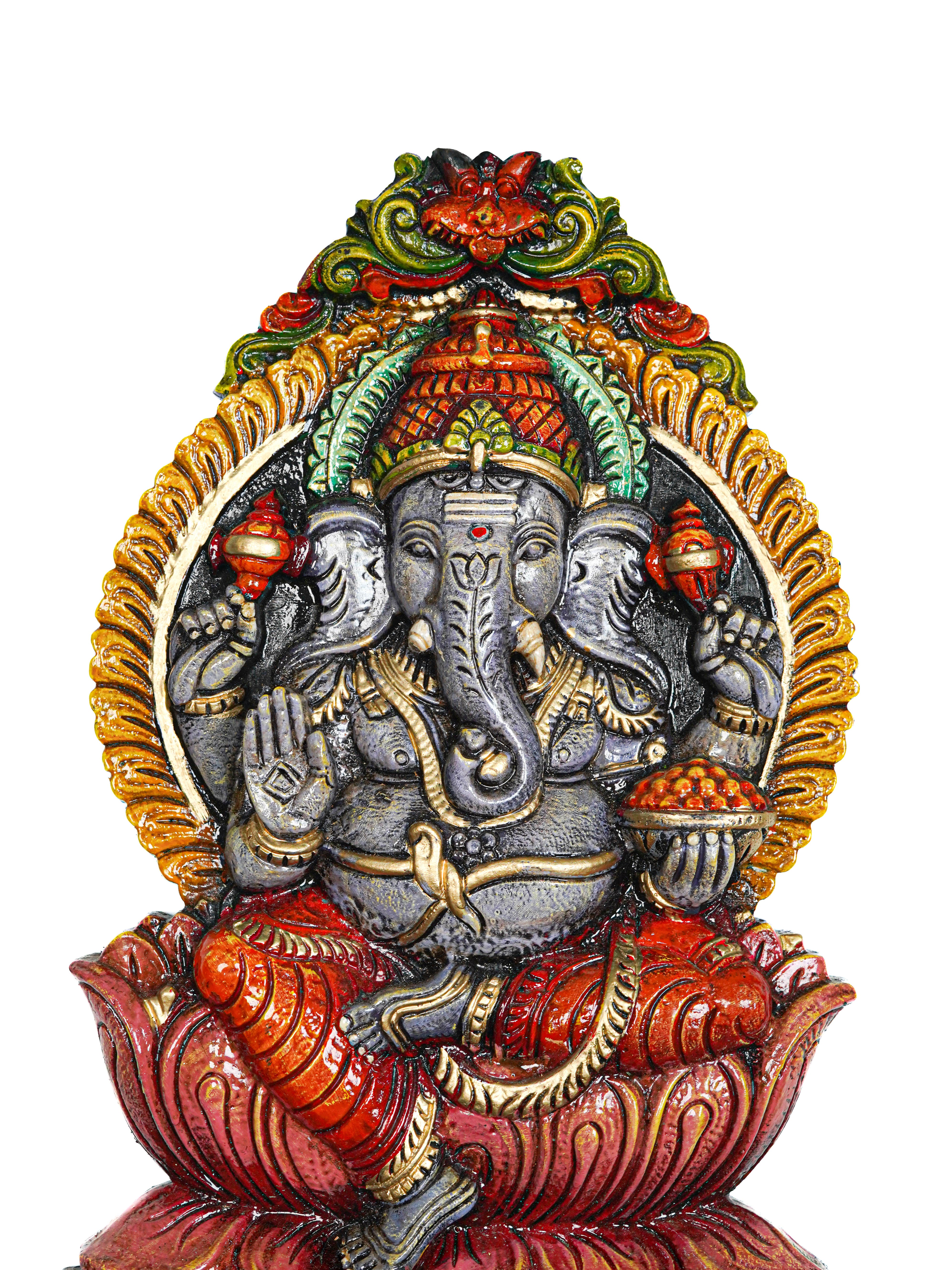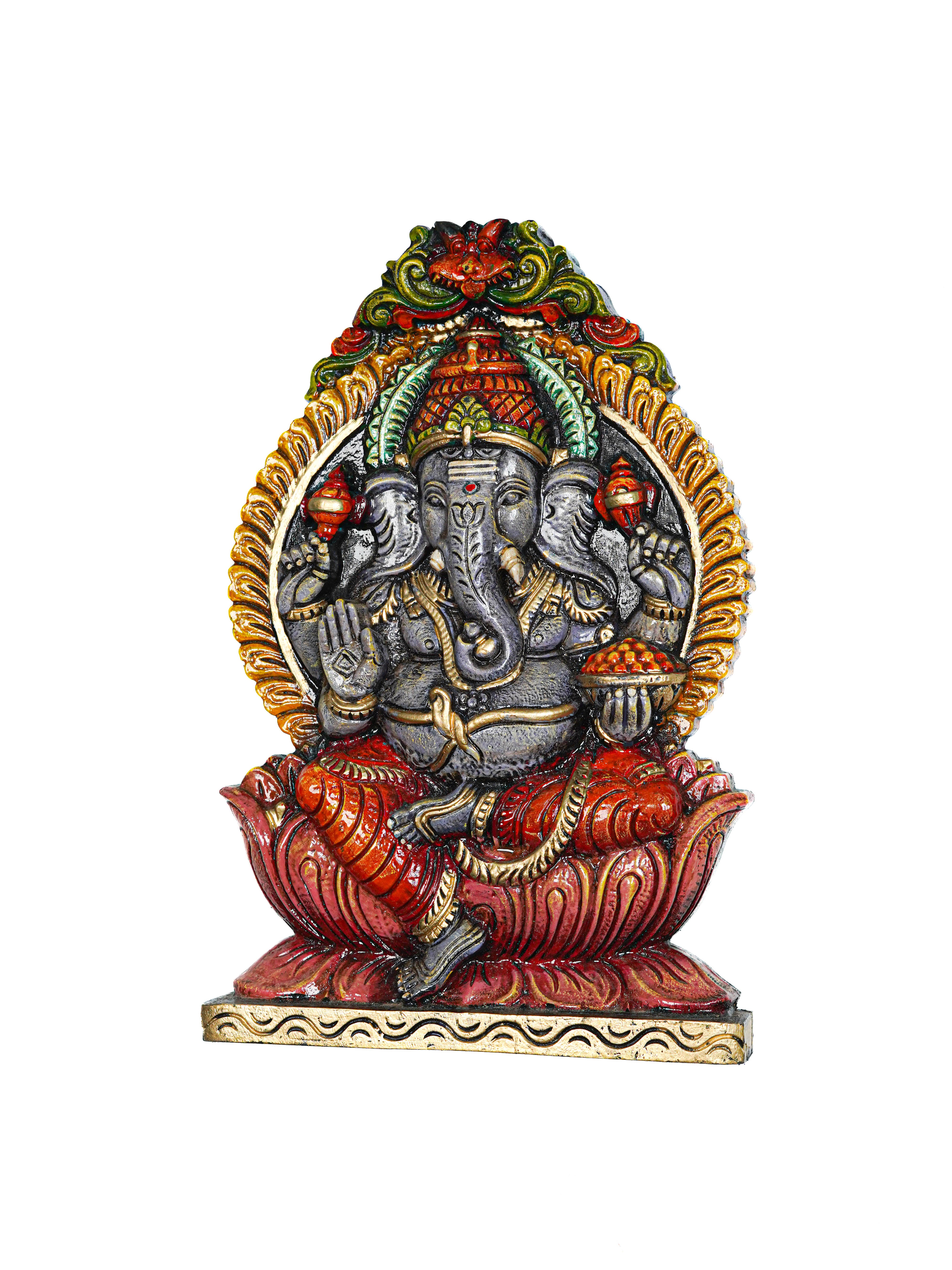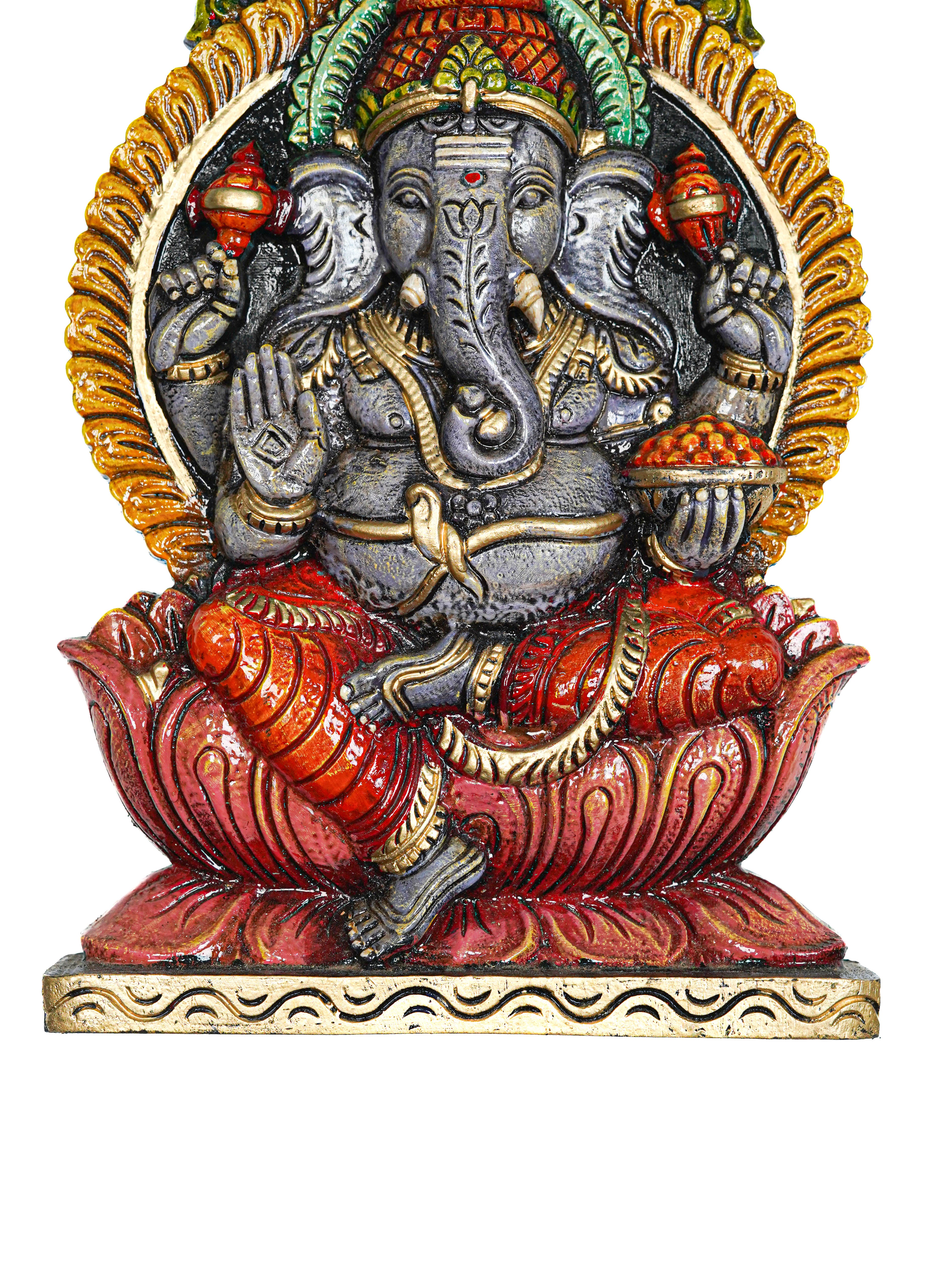 - This Vibrant and Intricately Designed Ganesha Wall Hanging Features Lord Ganesha Seated Gracefully on a Large Blooming Lotus.