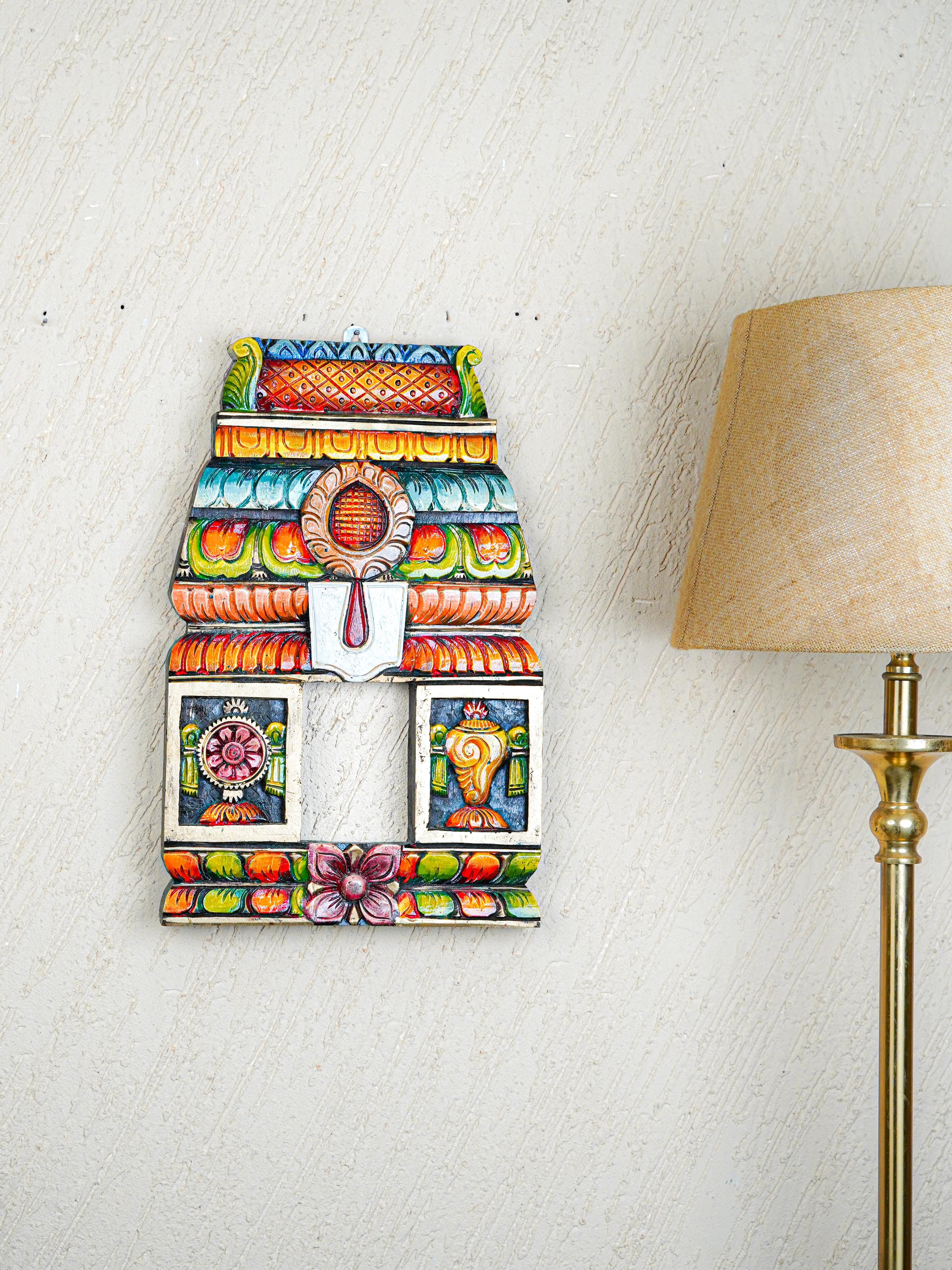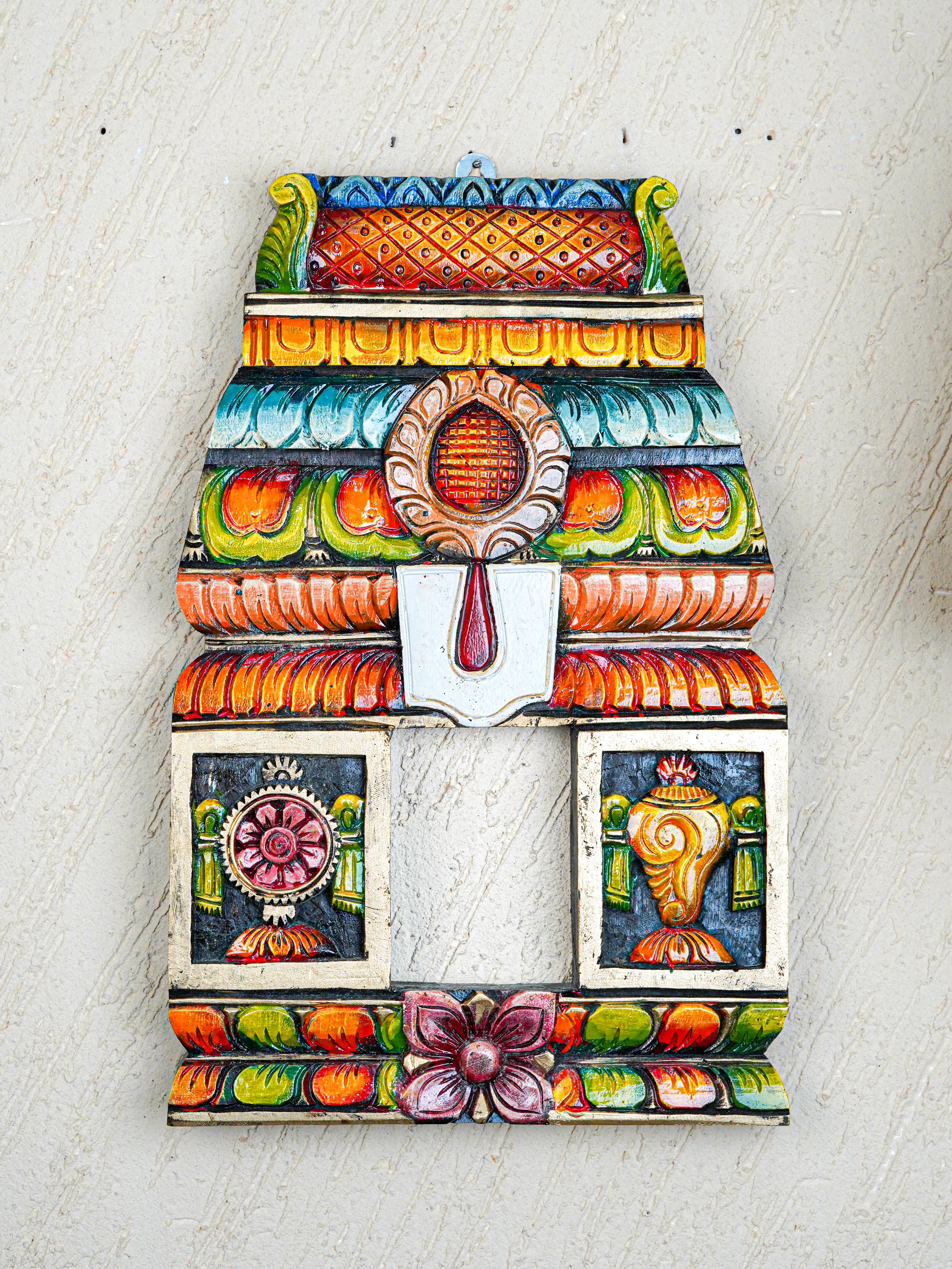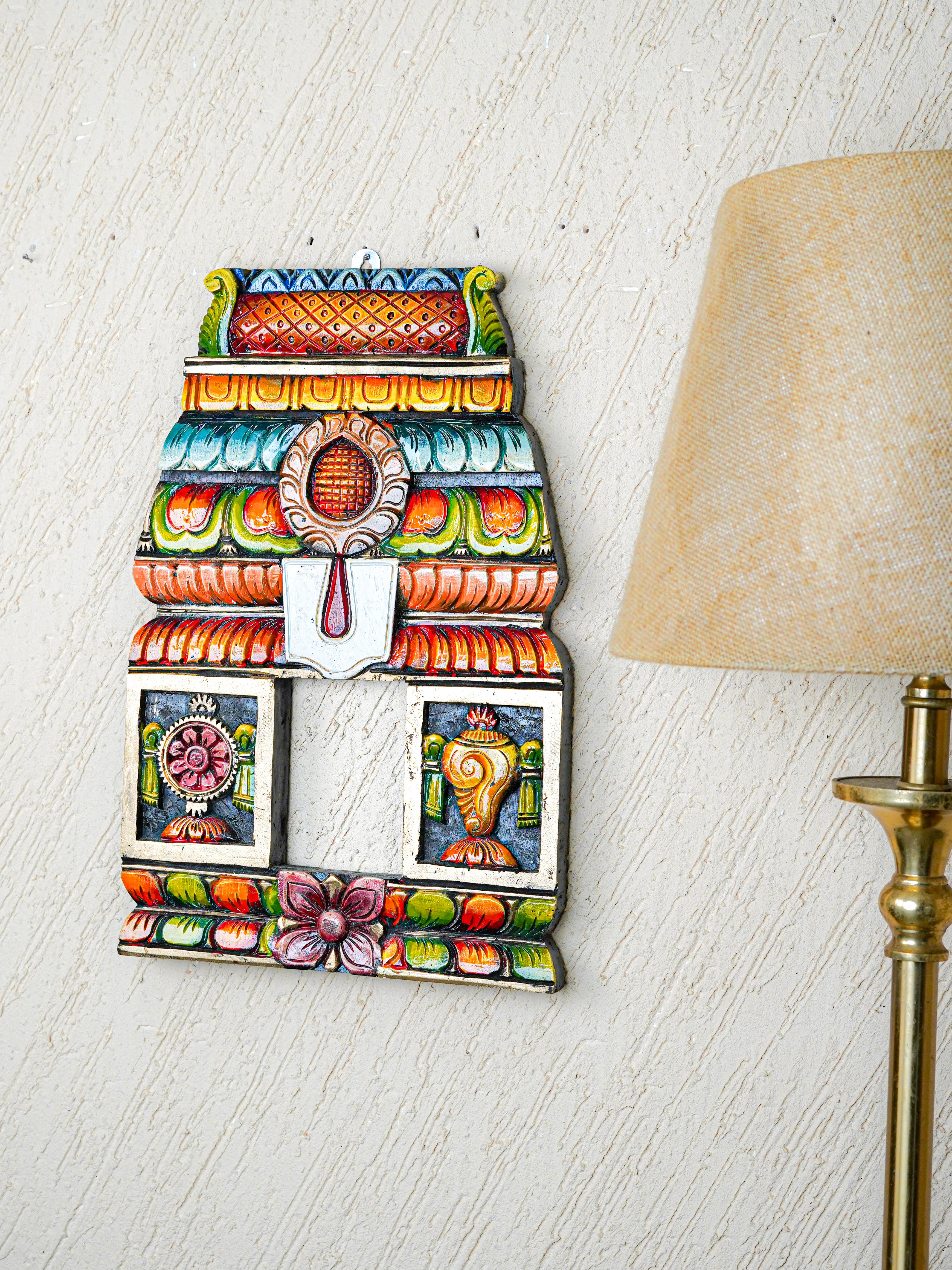 - Enhance your Sacred Space with this Carved Wooden Wall Panel featuring in a Traditional South Indian Kovil Gopuram-Style Frame with Namam, Handcrafted in Multicolour-Finished, this wall Hanging Radiates Divine Beauty and Spiritual Energy.