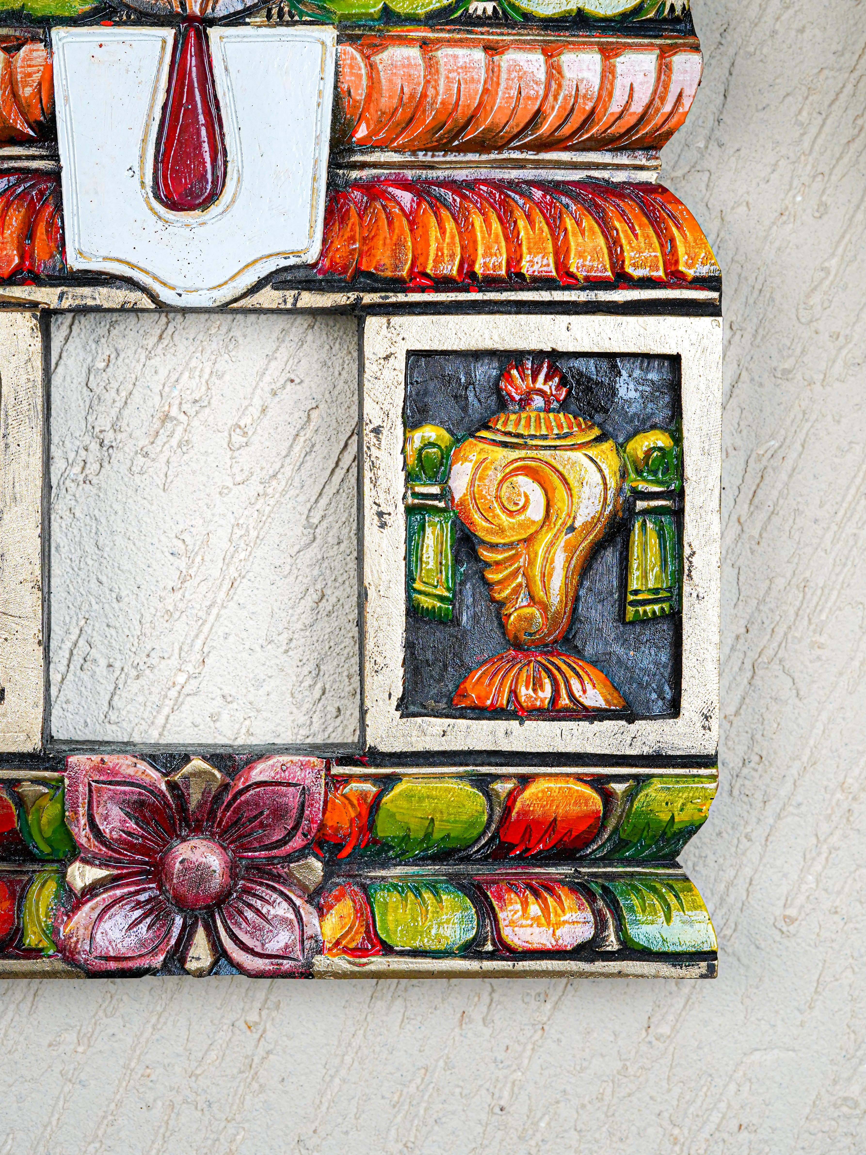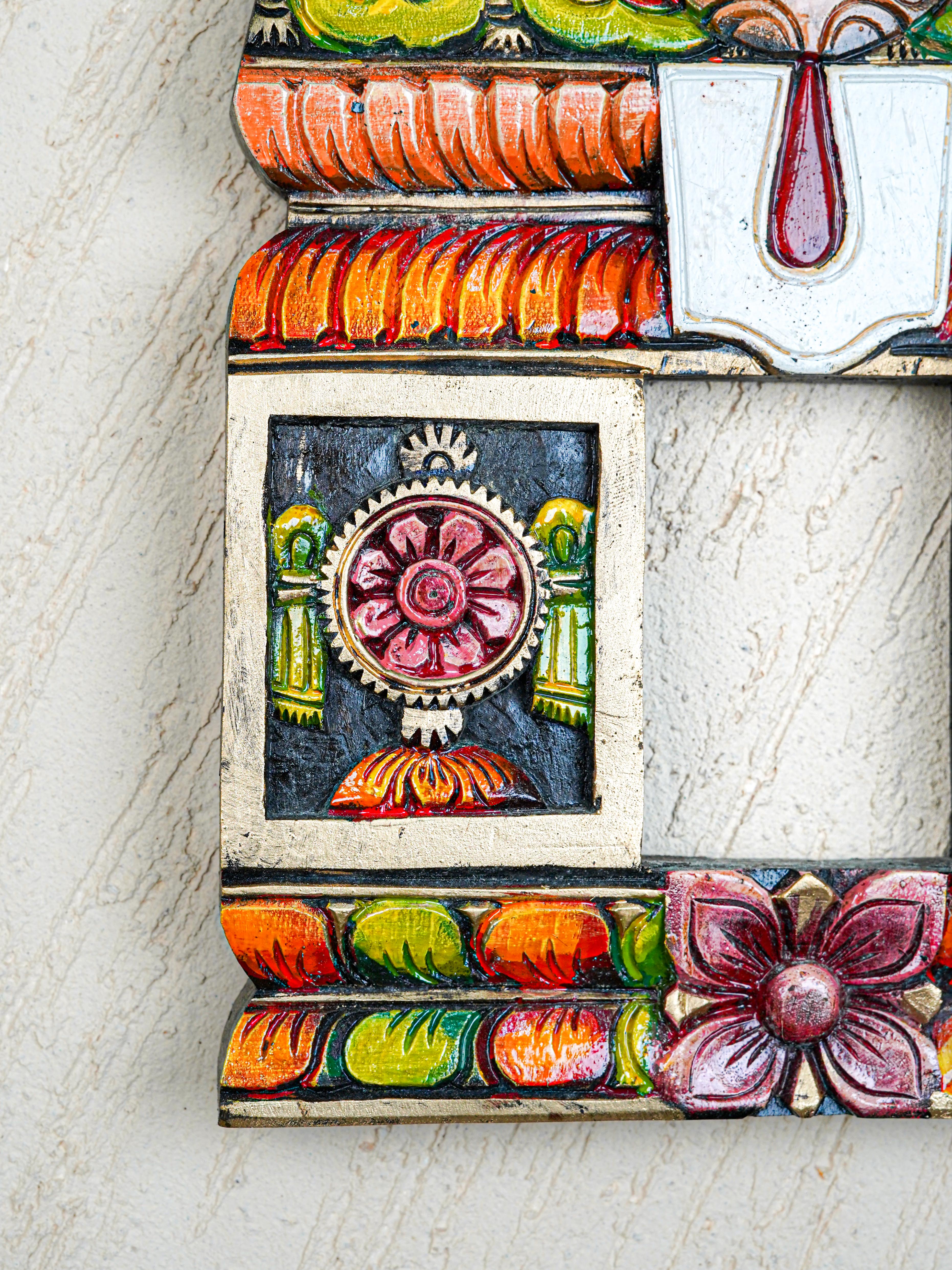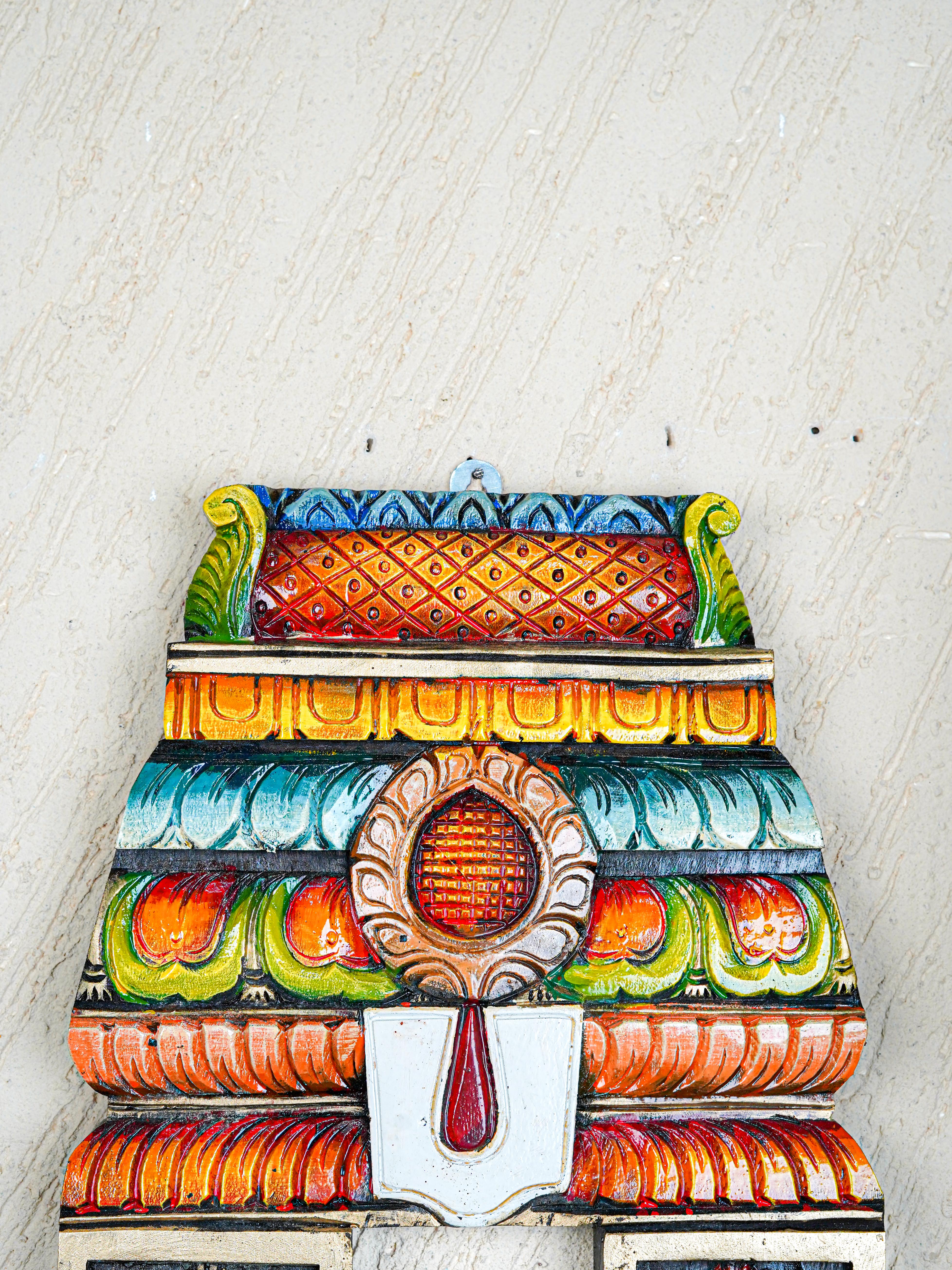 - Enhance your Sacred Space with this Carved Wooden Wall Panel featuring in a Traditional South Indian Kovil Gopuram-Style Frame with Namam, Handcrafted in Multicolour-Finished, this wall Hanging Radiates Divine Beauty and Spiritual Energy.