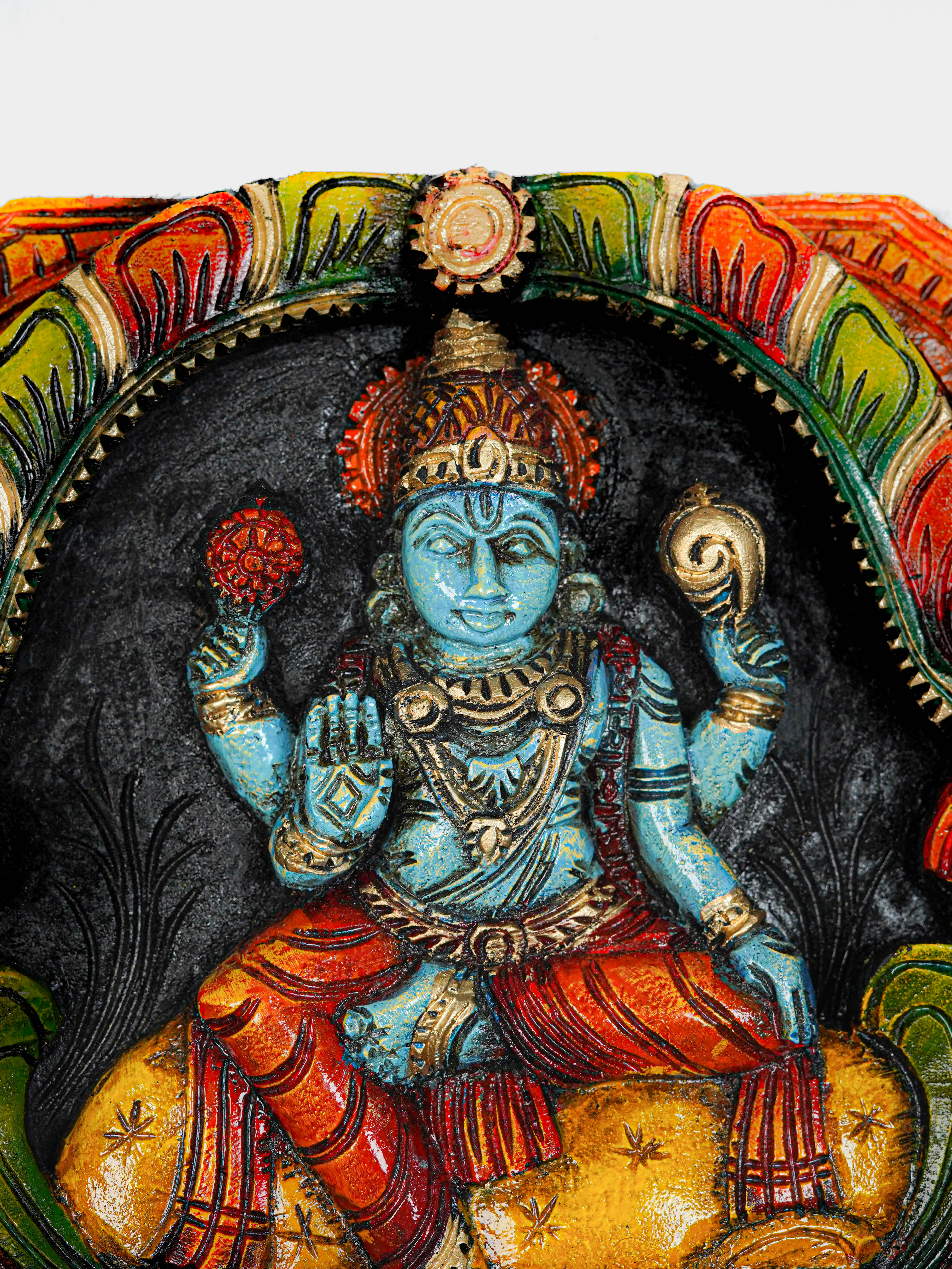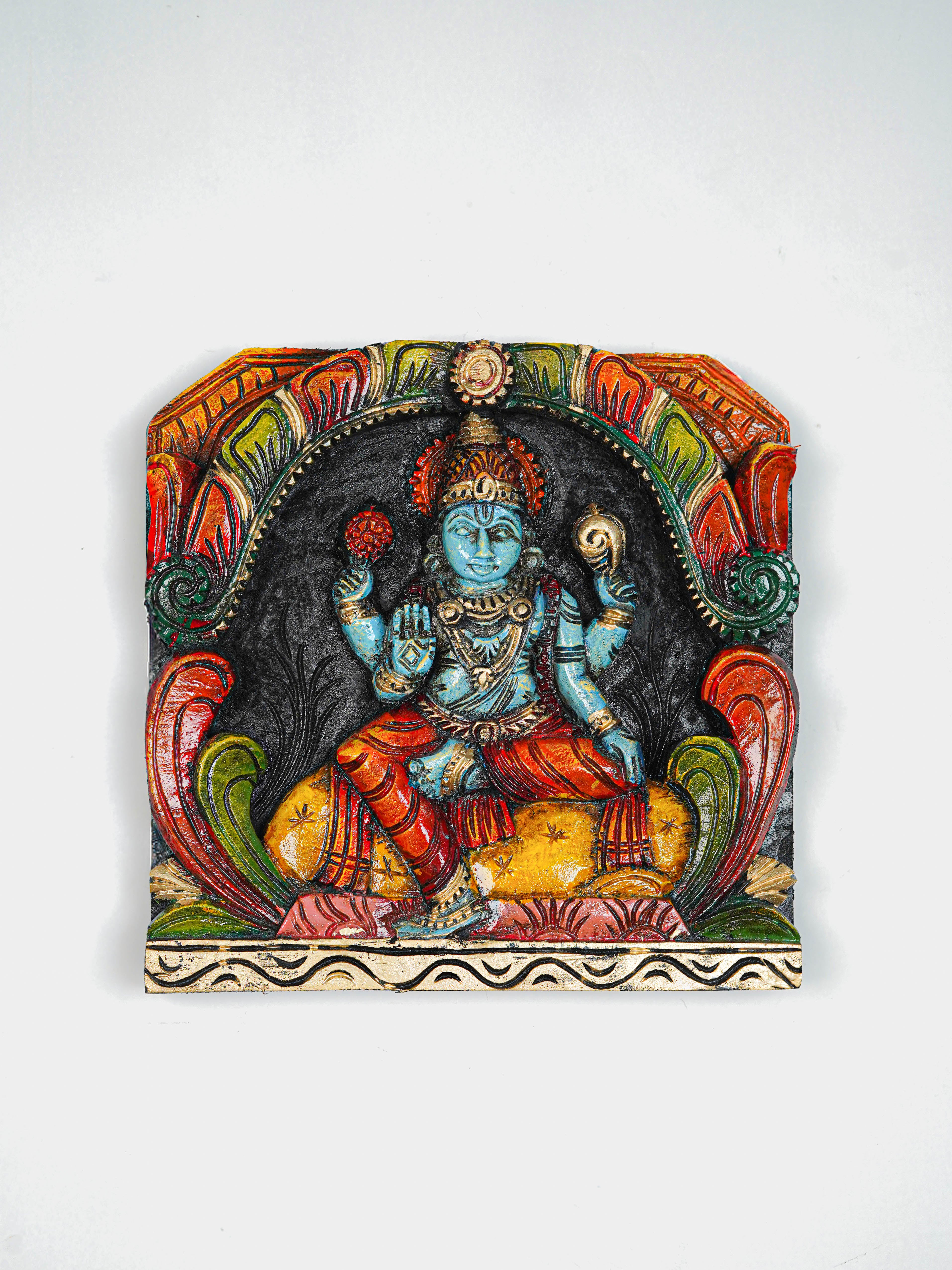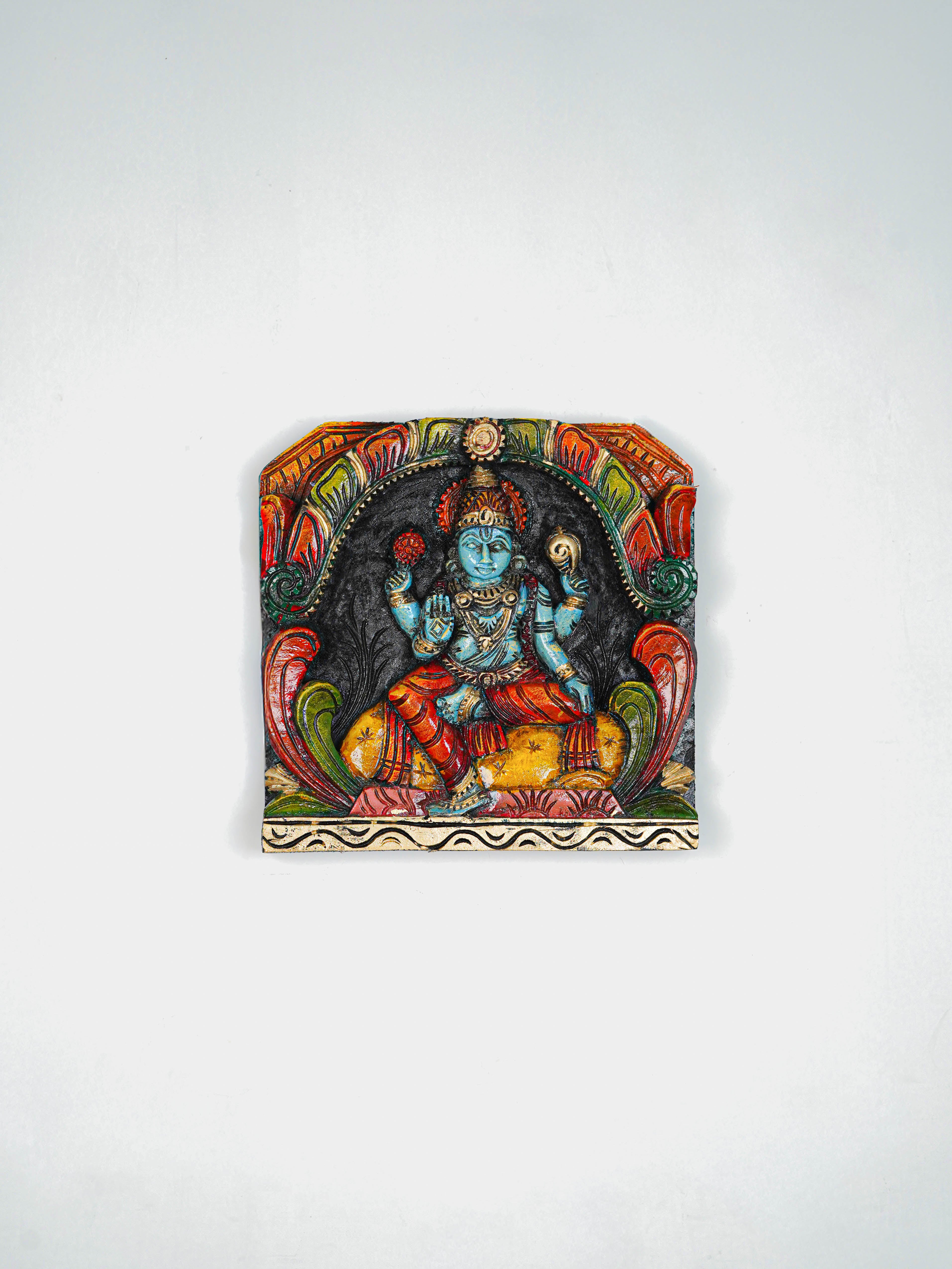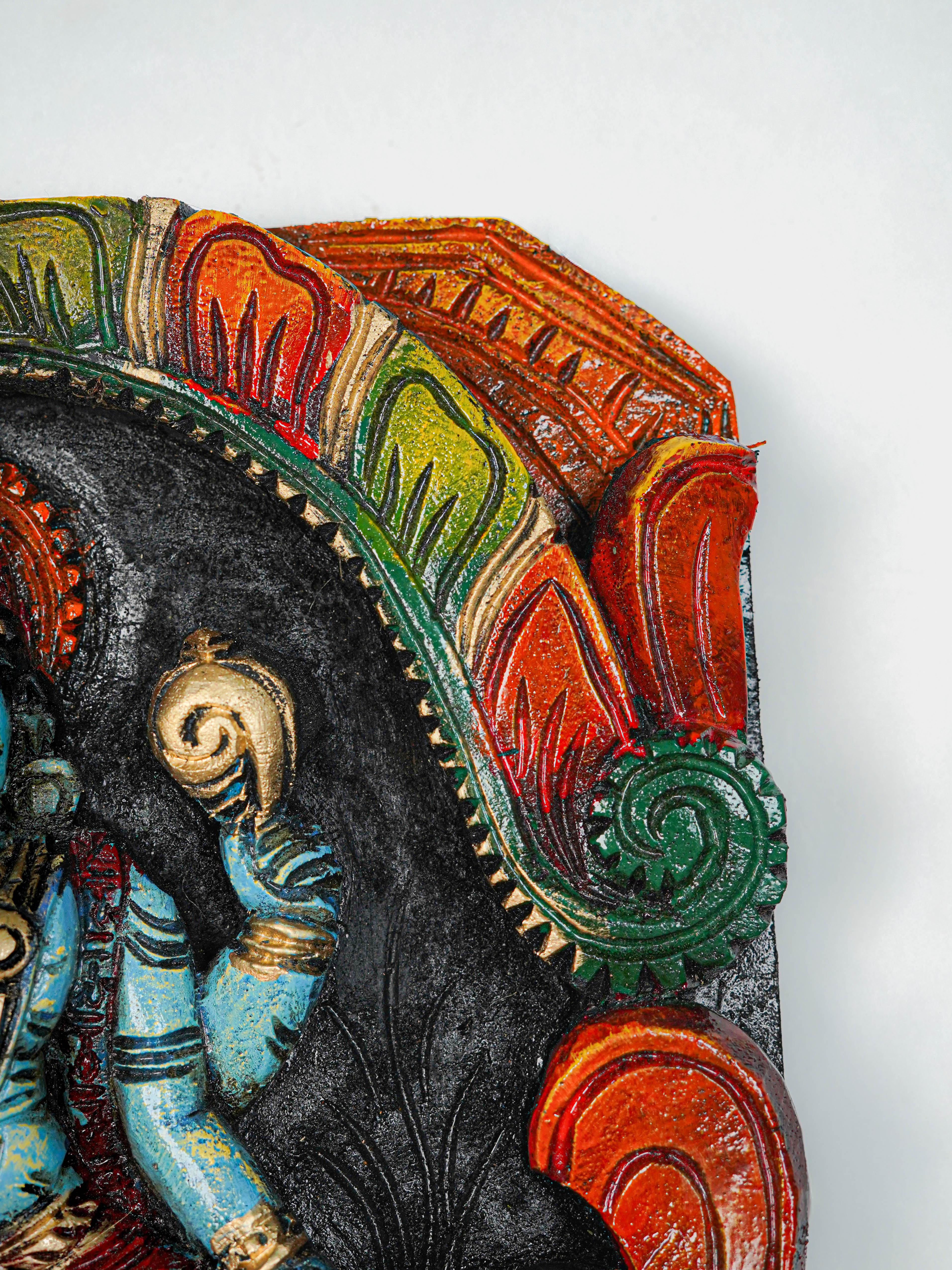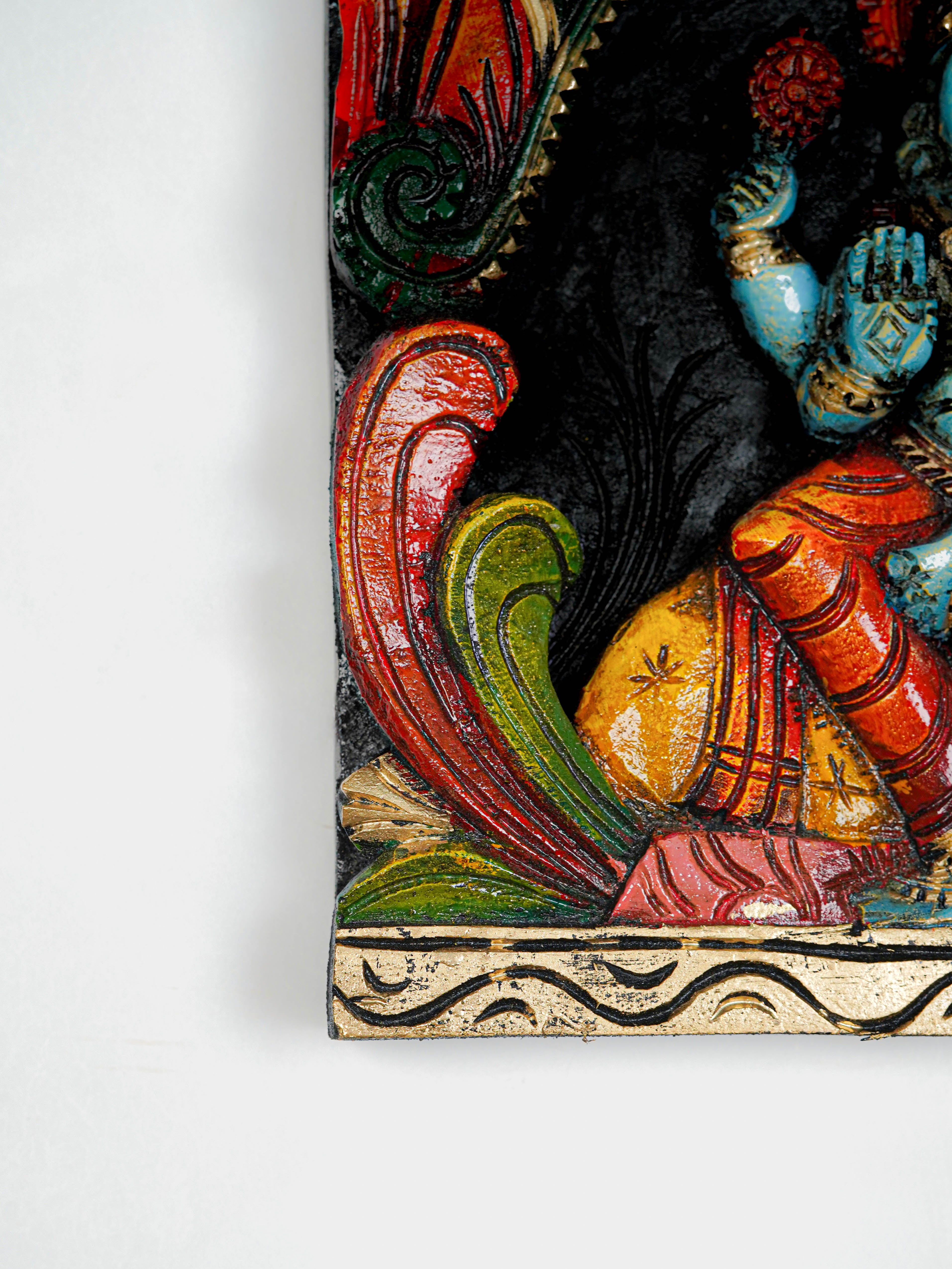 - Beautiful Wall Panel Showcases a Vibrant Depiction of Goddess Ranganathar, Skillfully Carved in Wood and Highlighted with Rich, Traditional Colors.