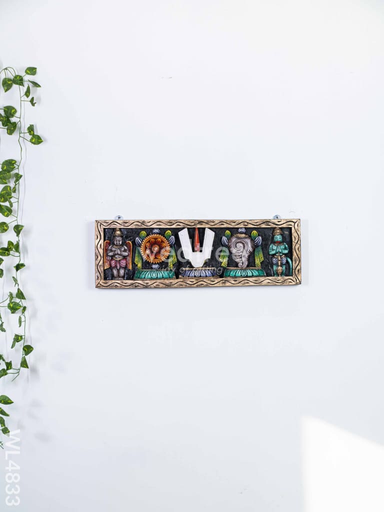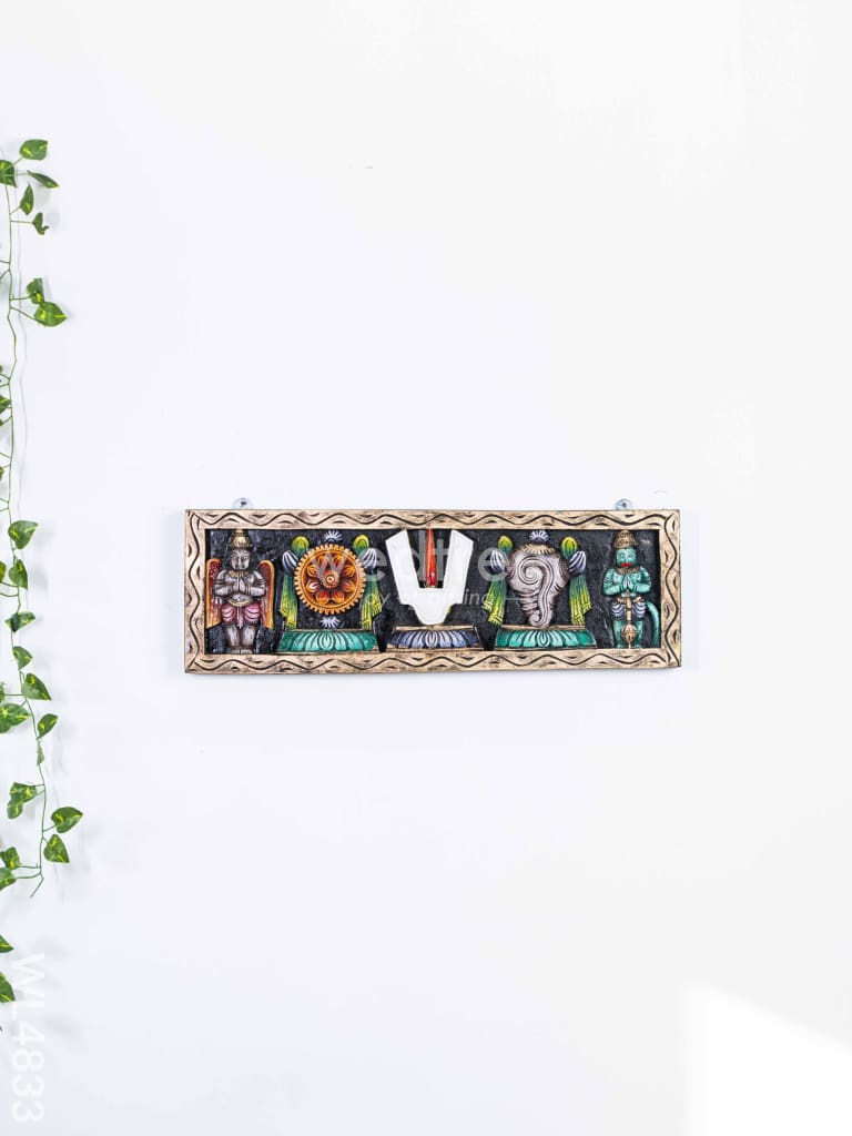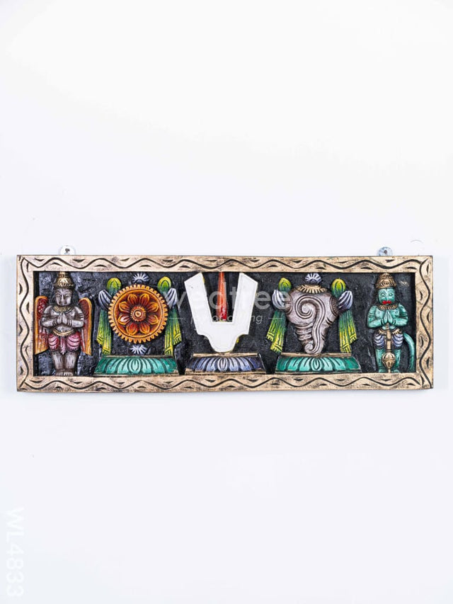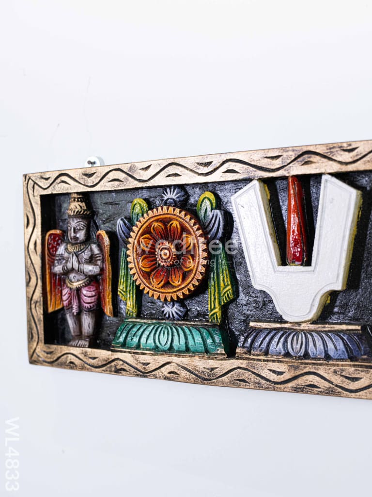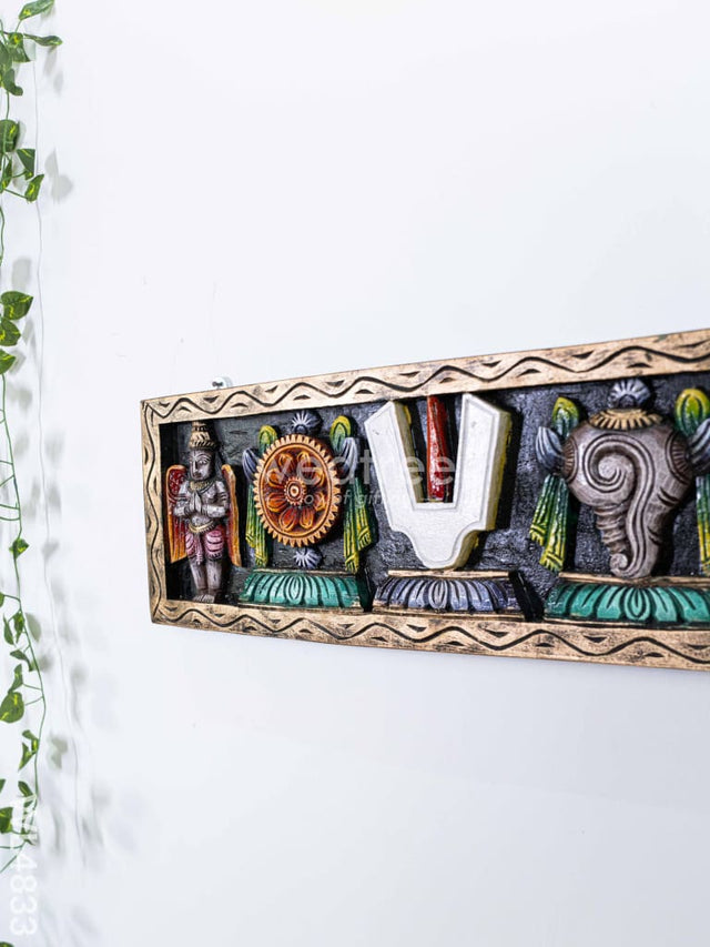 - The Panel Features Intricate Carvings of the Shankh (Conch), Chakra (Disc), and Nama (Sacred Symbol) Representing Lord Vishnu’s Divine Presence in Hindu Tradition.