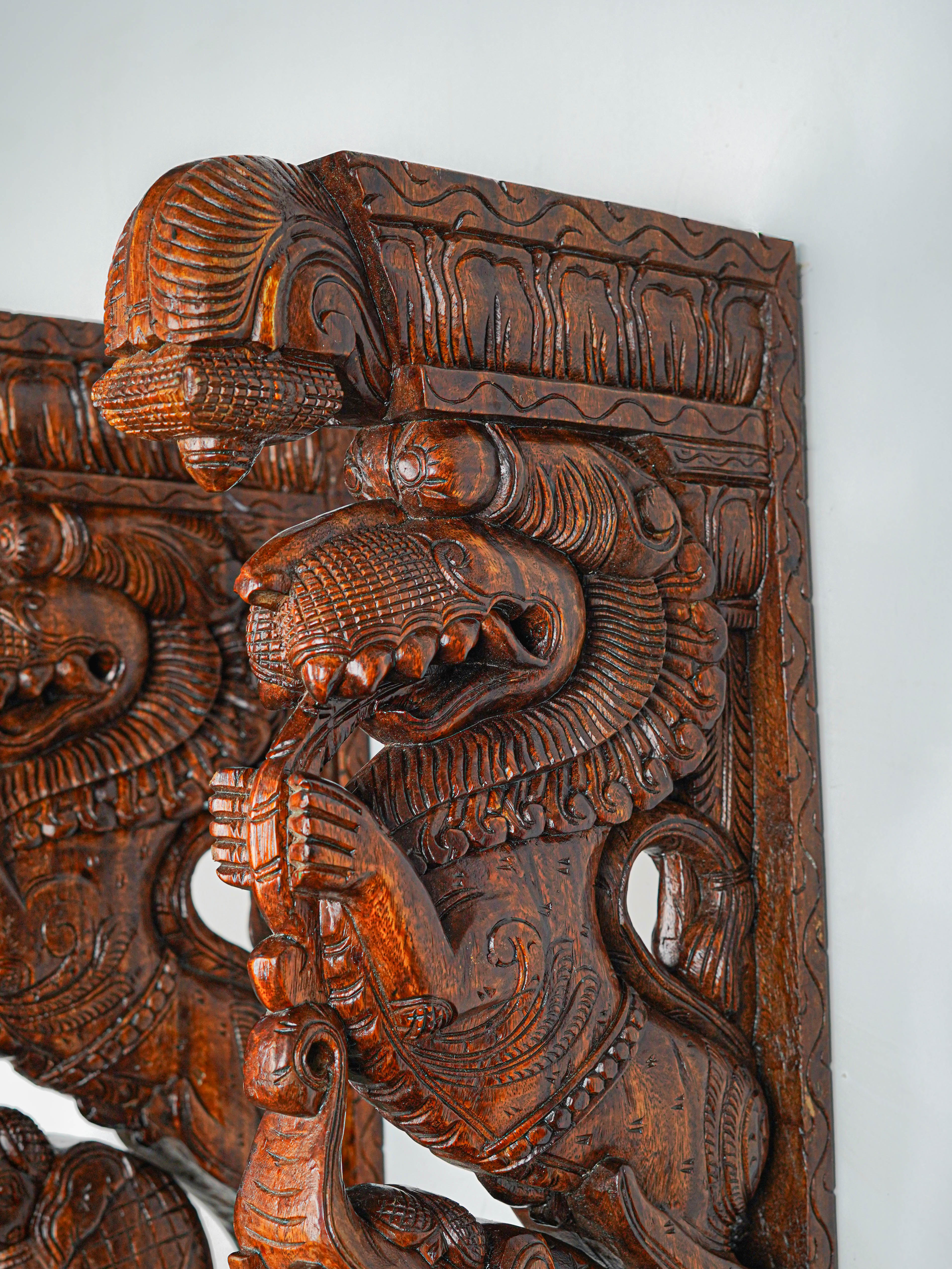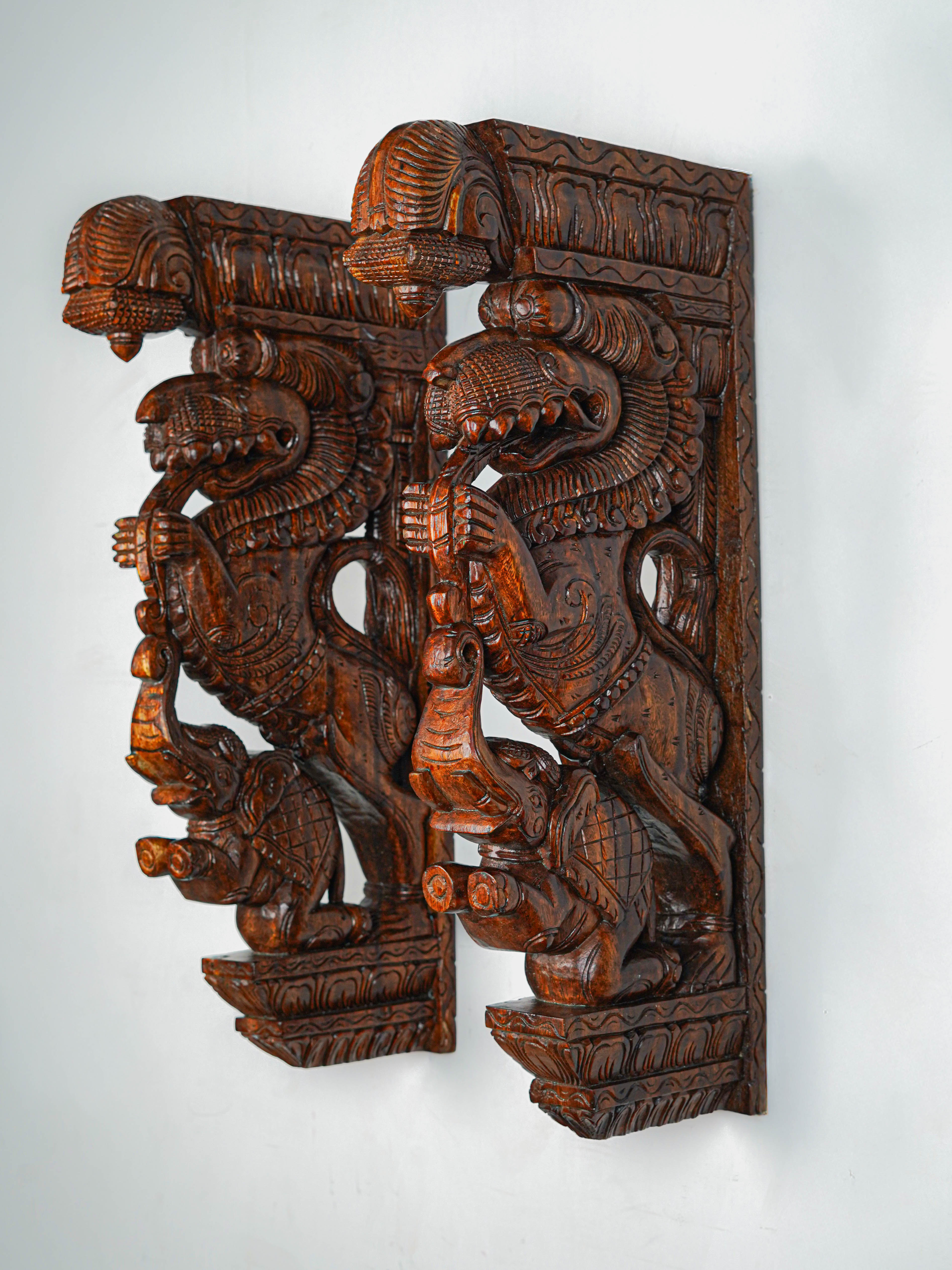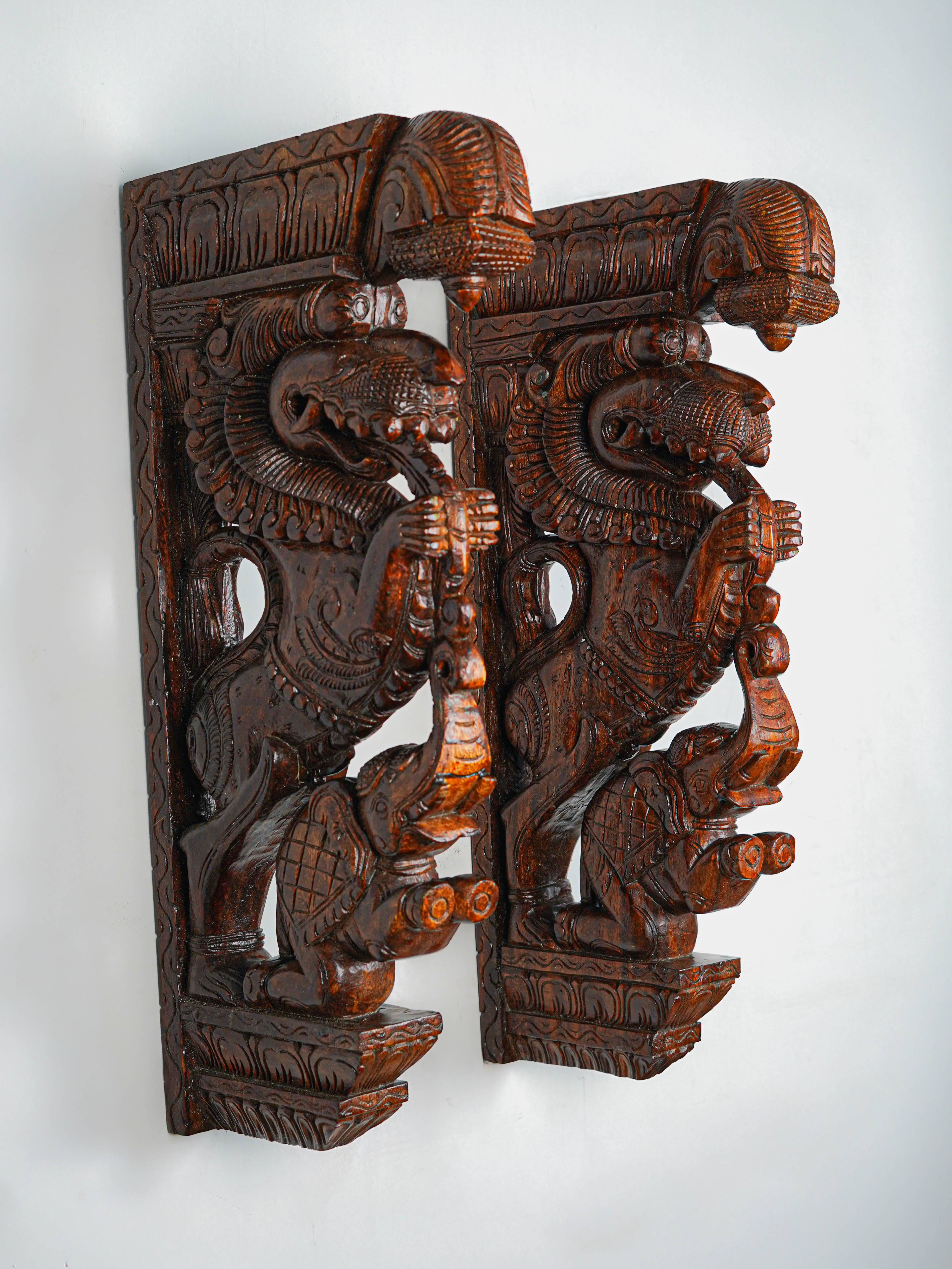 - Stunning Wooden Bracket Features an Intricate Traditional Yali (Mythical Creature) and elephant Design, Showcasing Exceptional Craftsmanship and Rich Cultural Detailing.