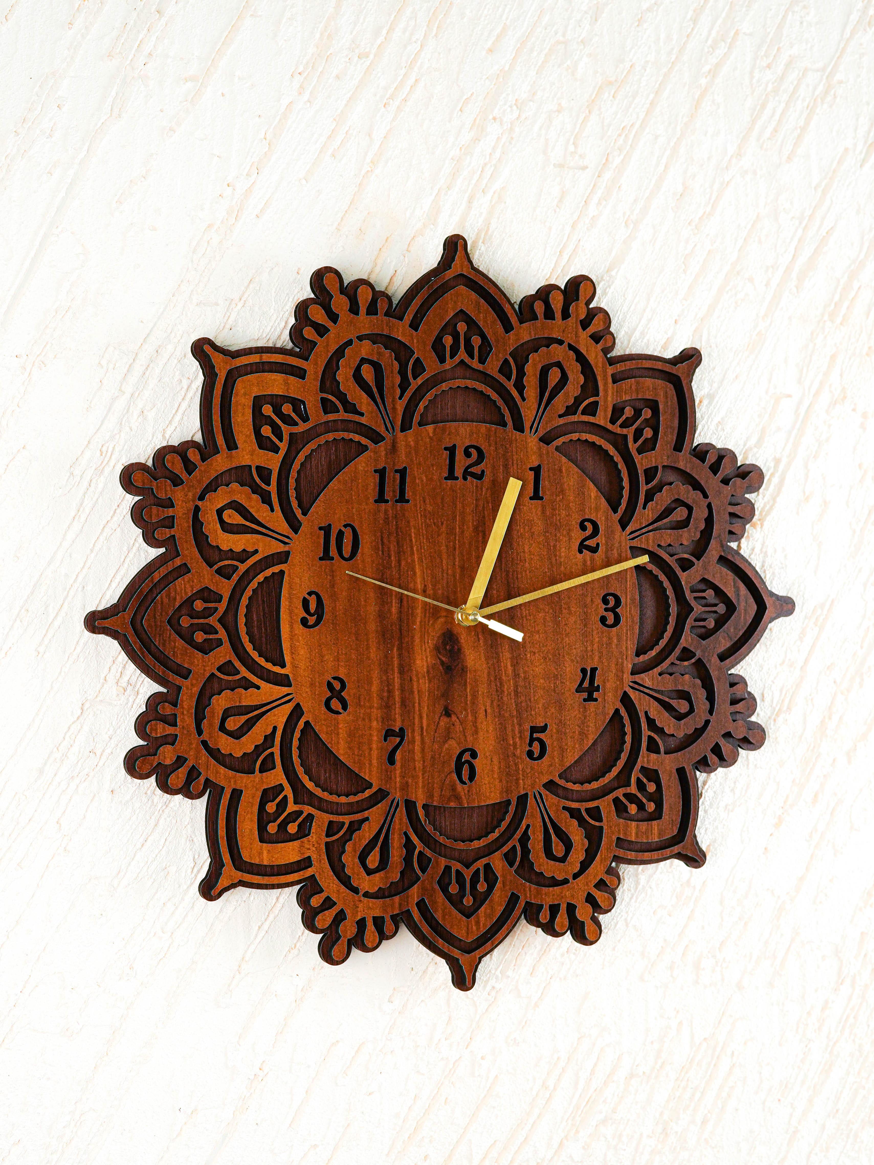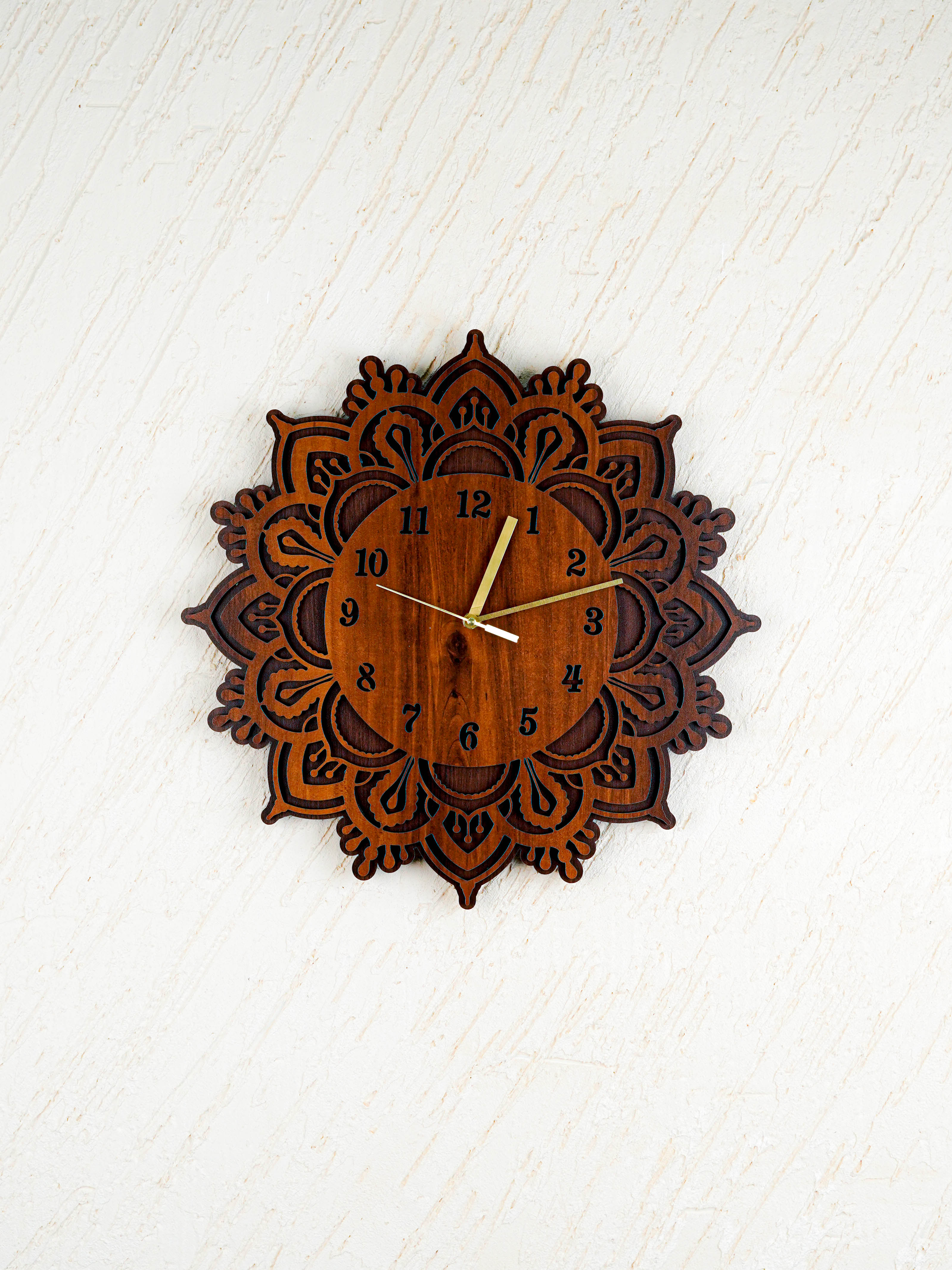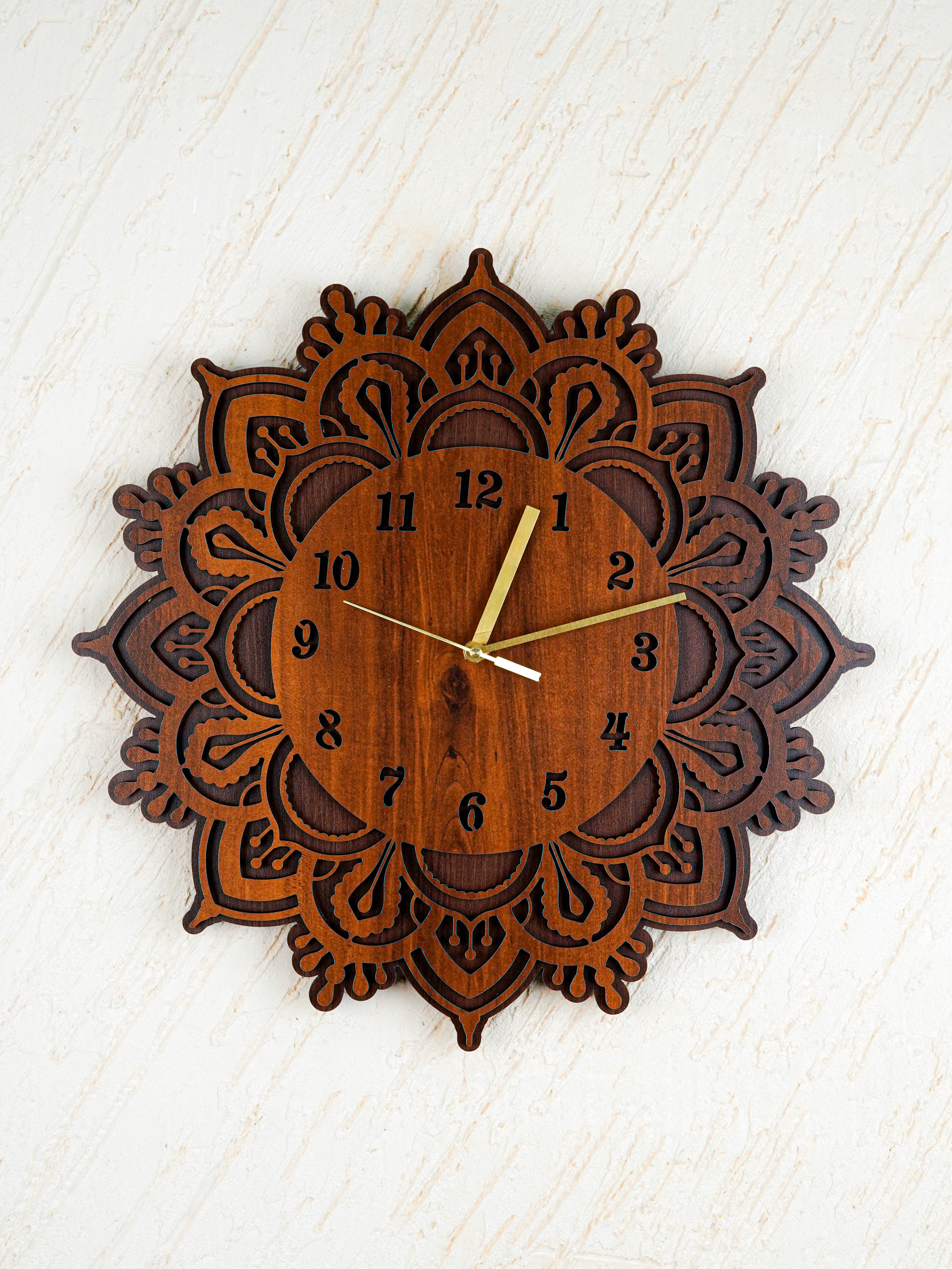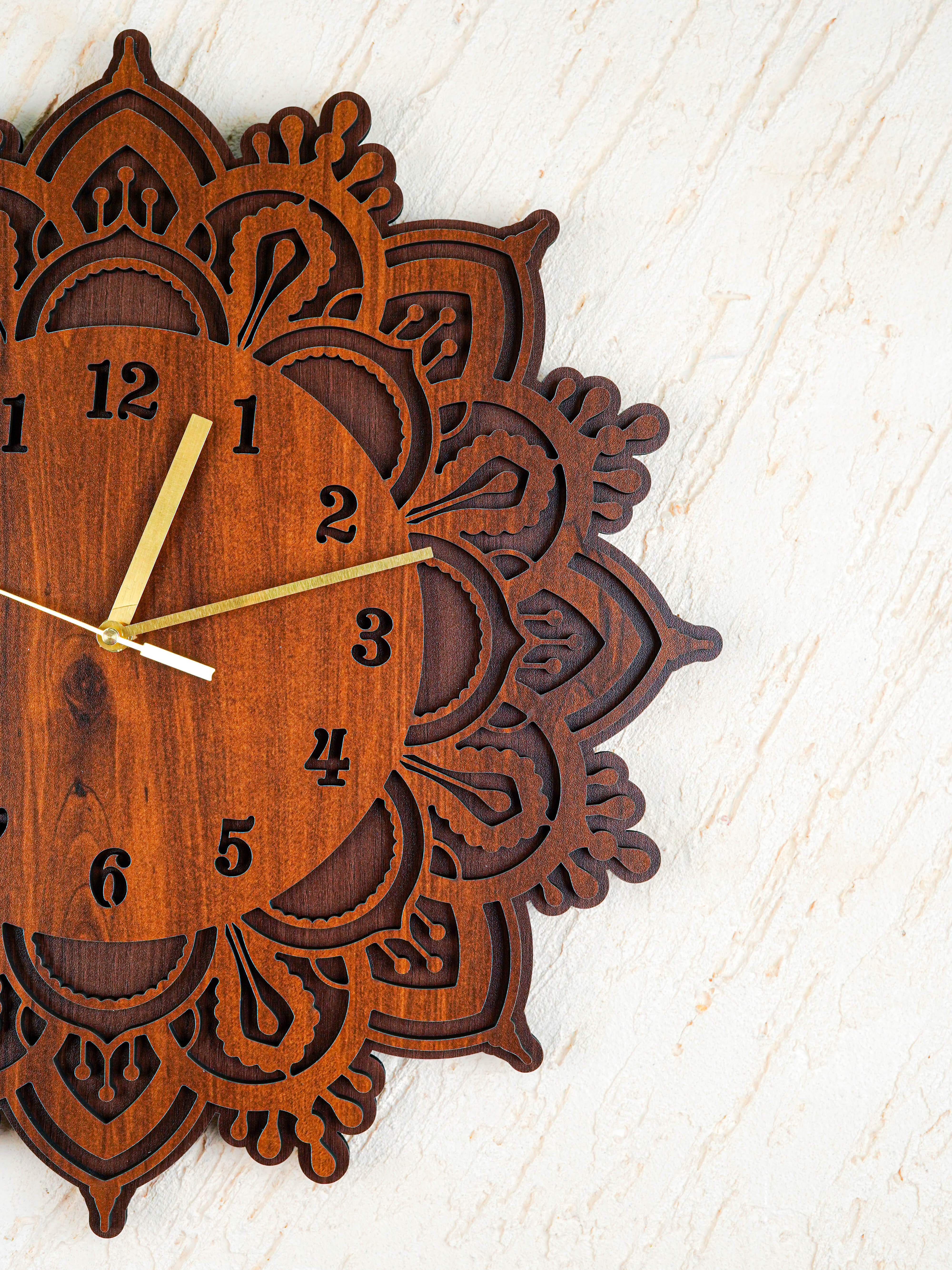 - This Elegant Wall Clock is Crafted from Premium Quality MDF Wood and Features a Beautifully Layered Floral Mandala Pattern Surrounding the Dial.