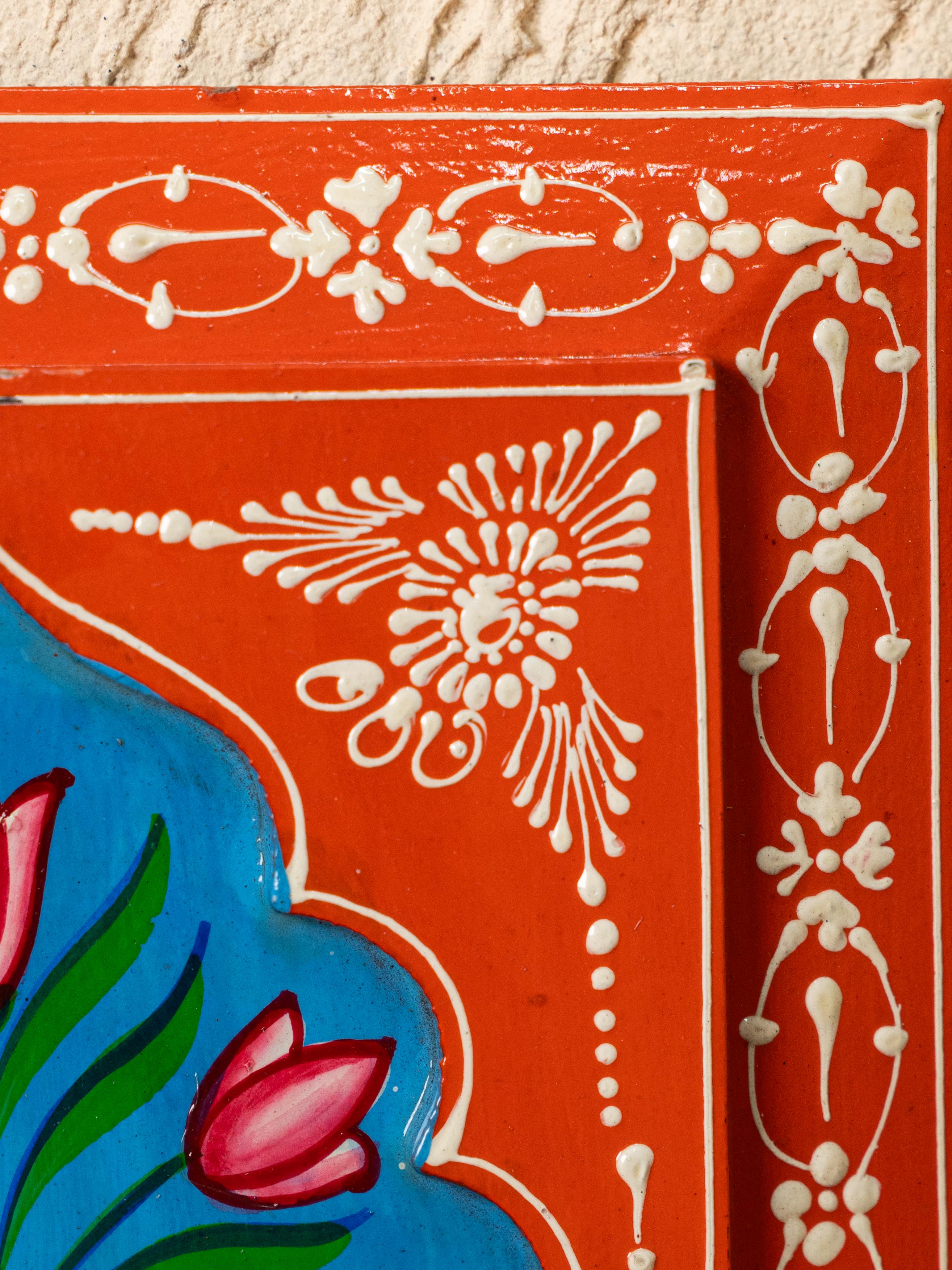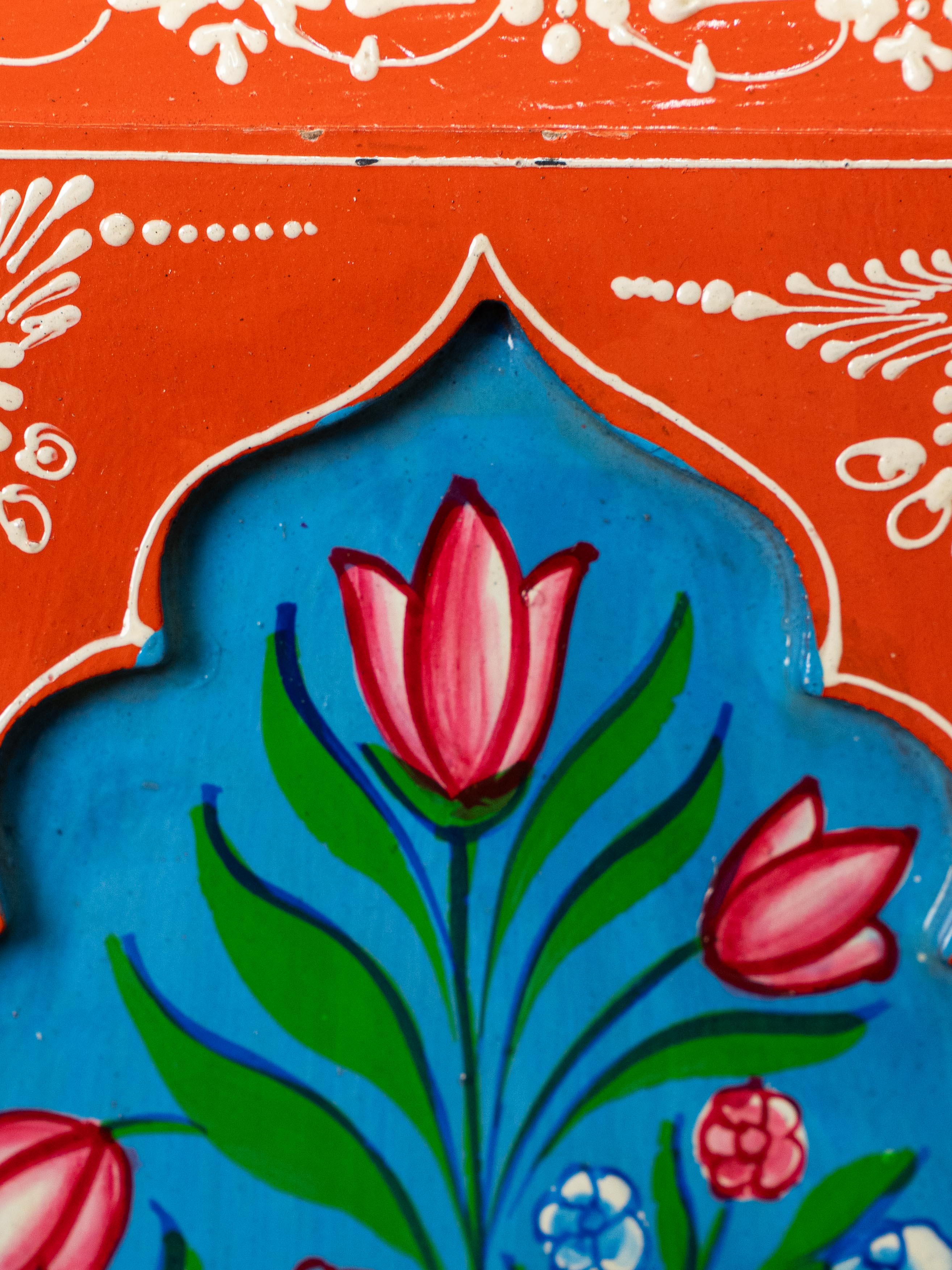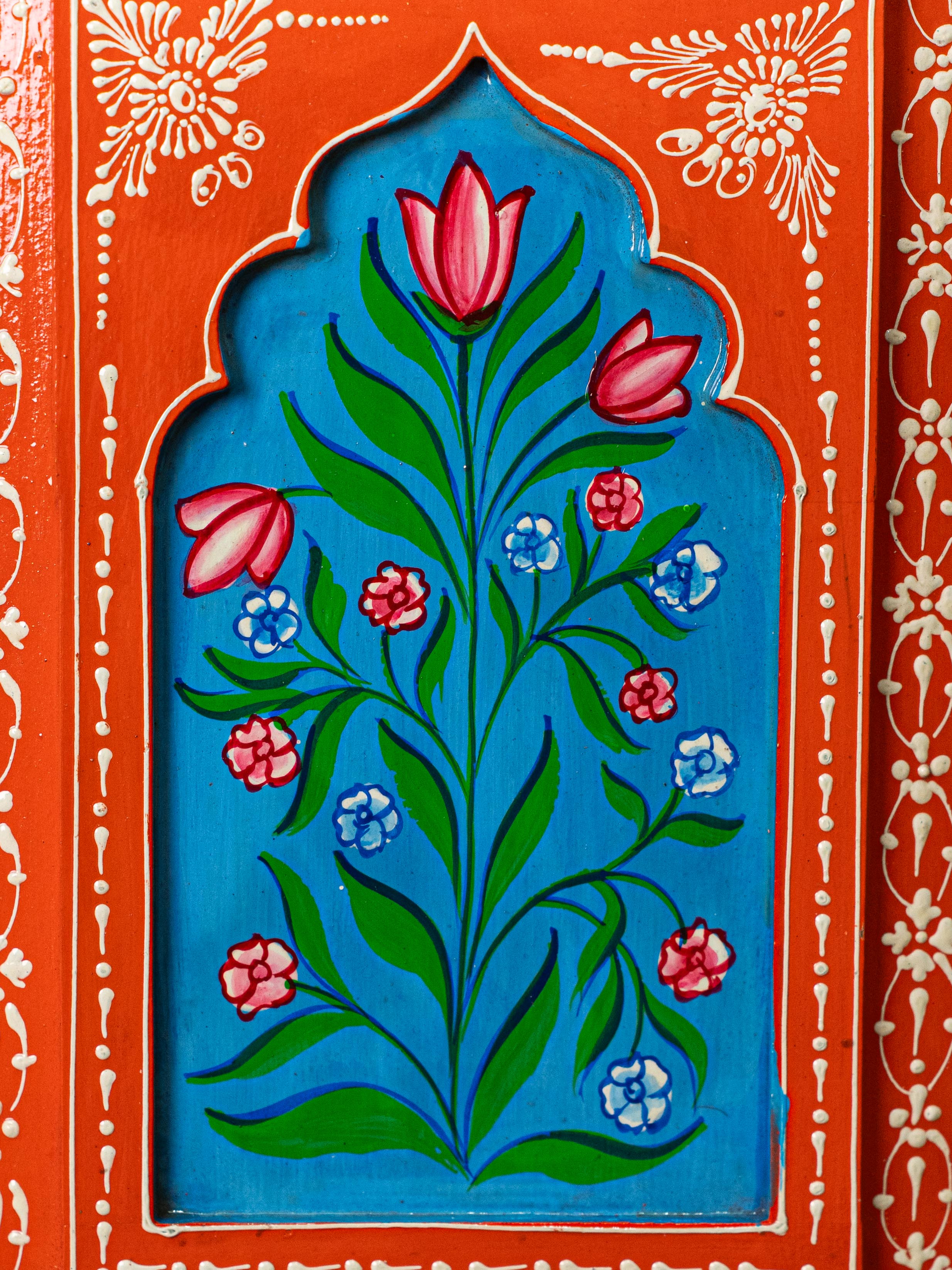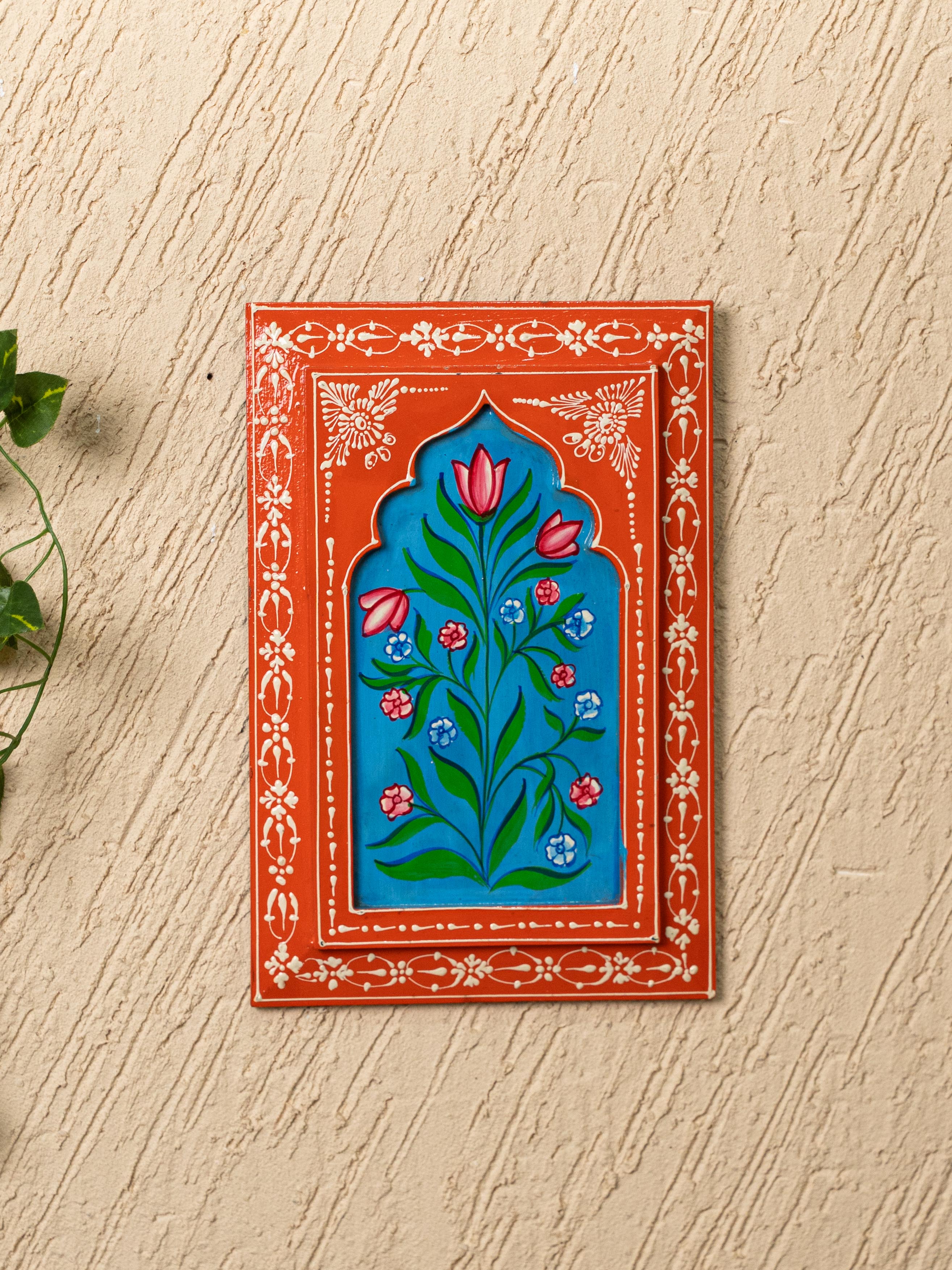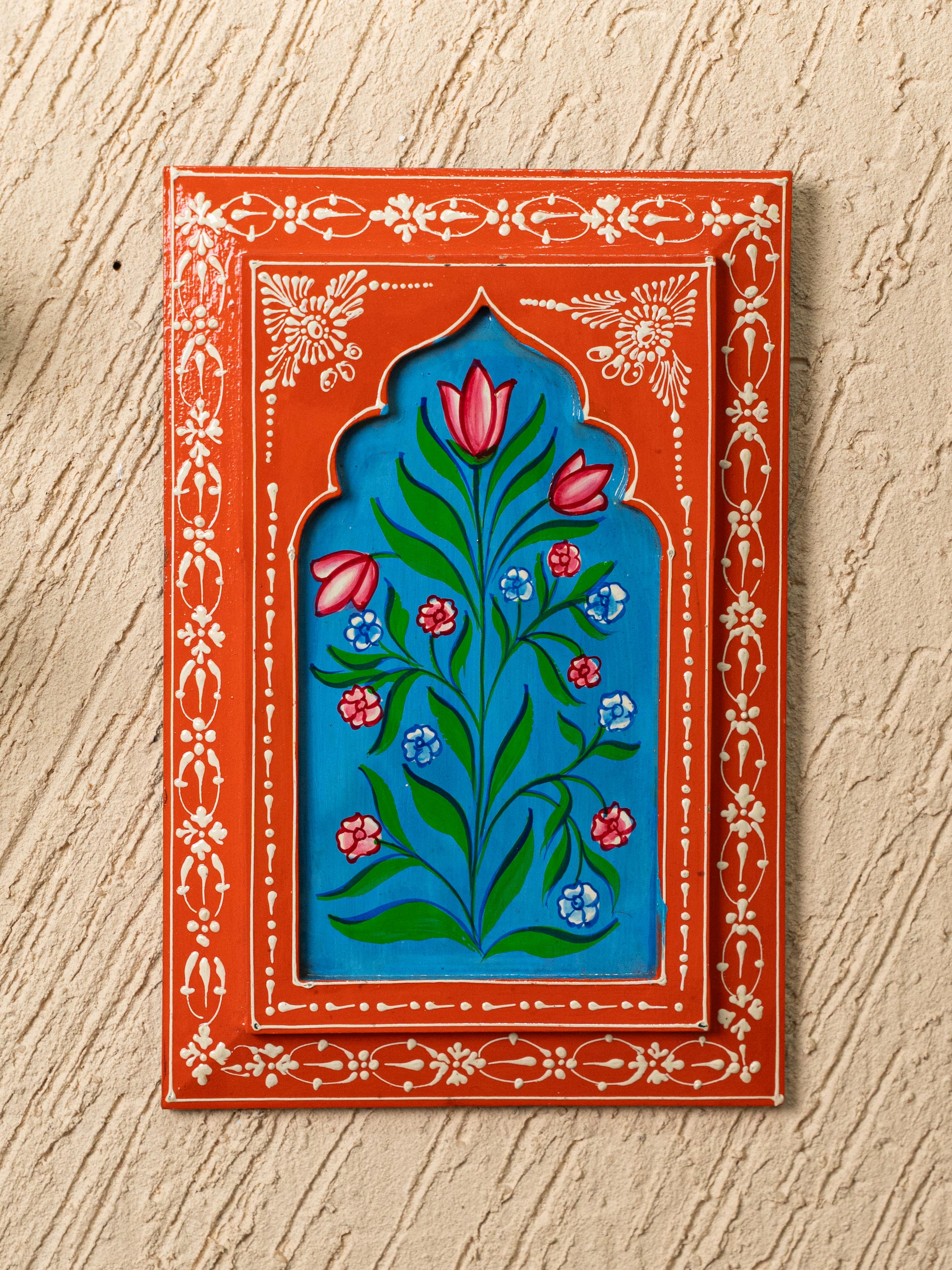 This is a Traditional Hand-Painted Wooden Wall Decor Panel featuring Floral Artwork with a Mughal-Arch Style Frame Design.