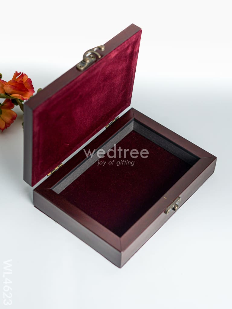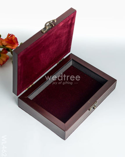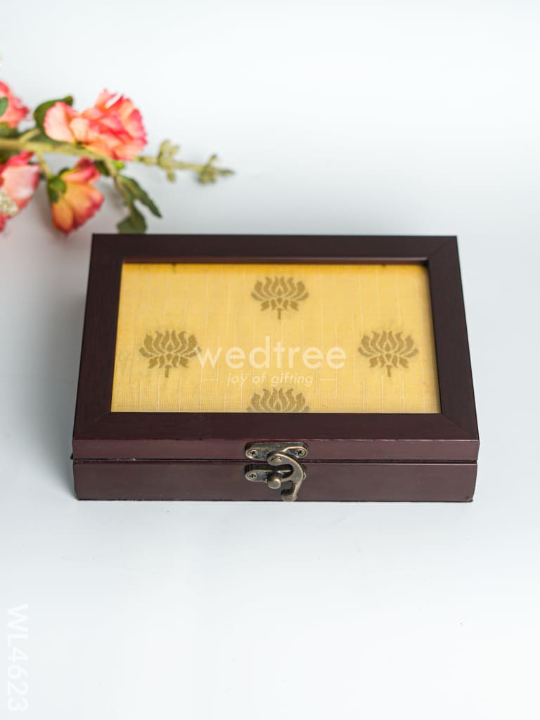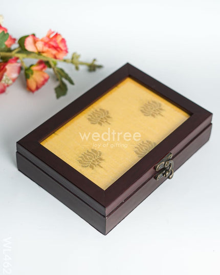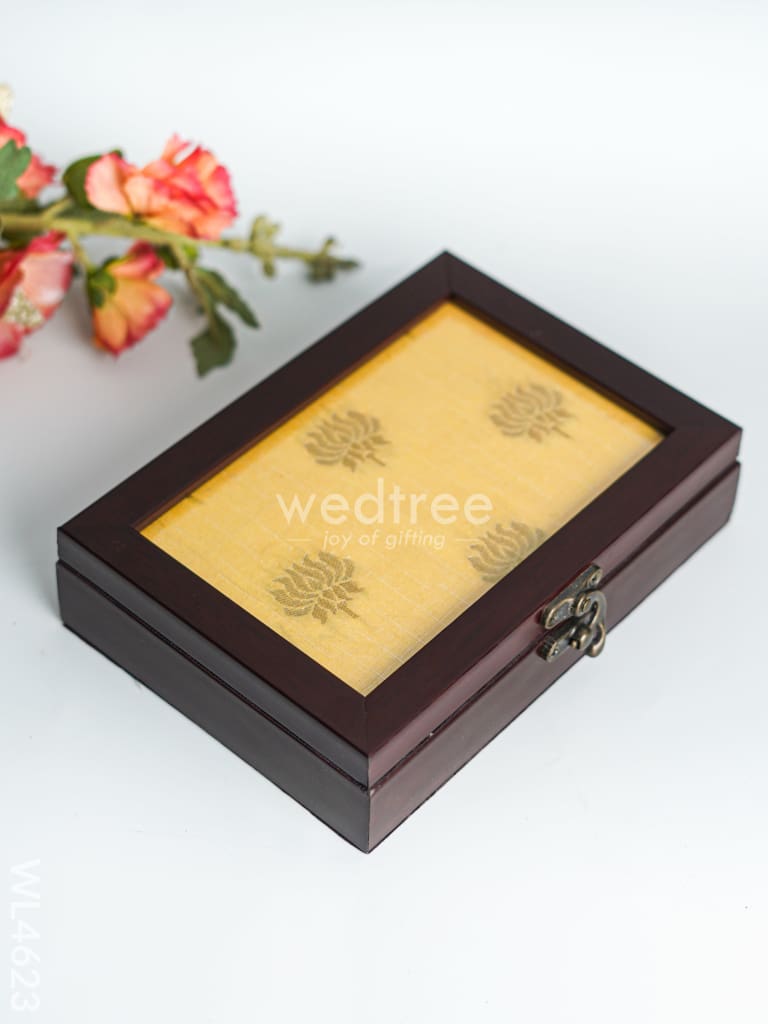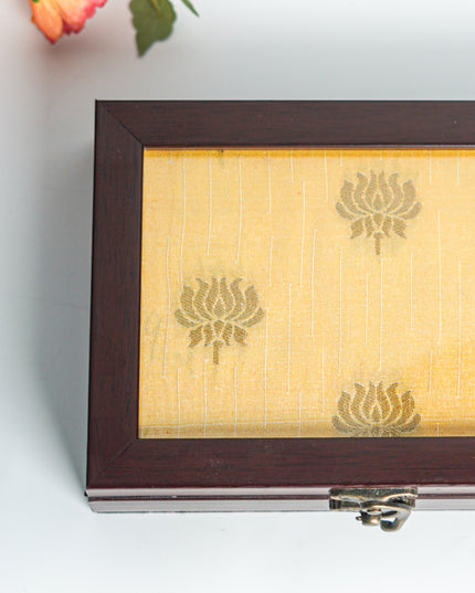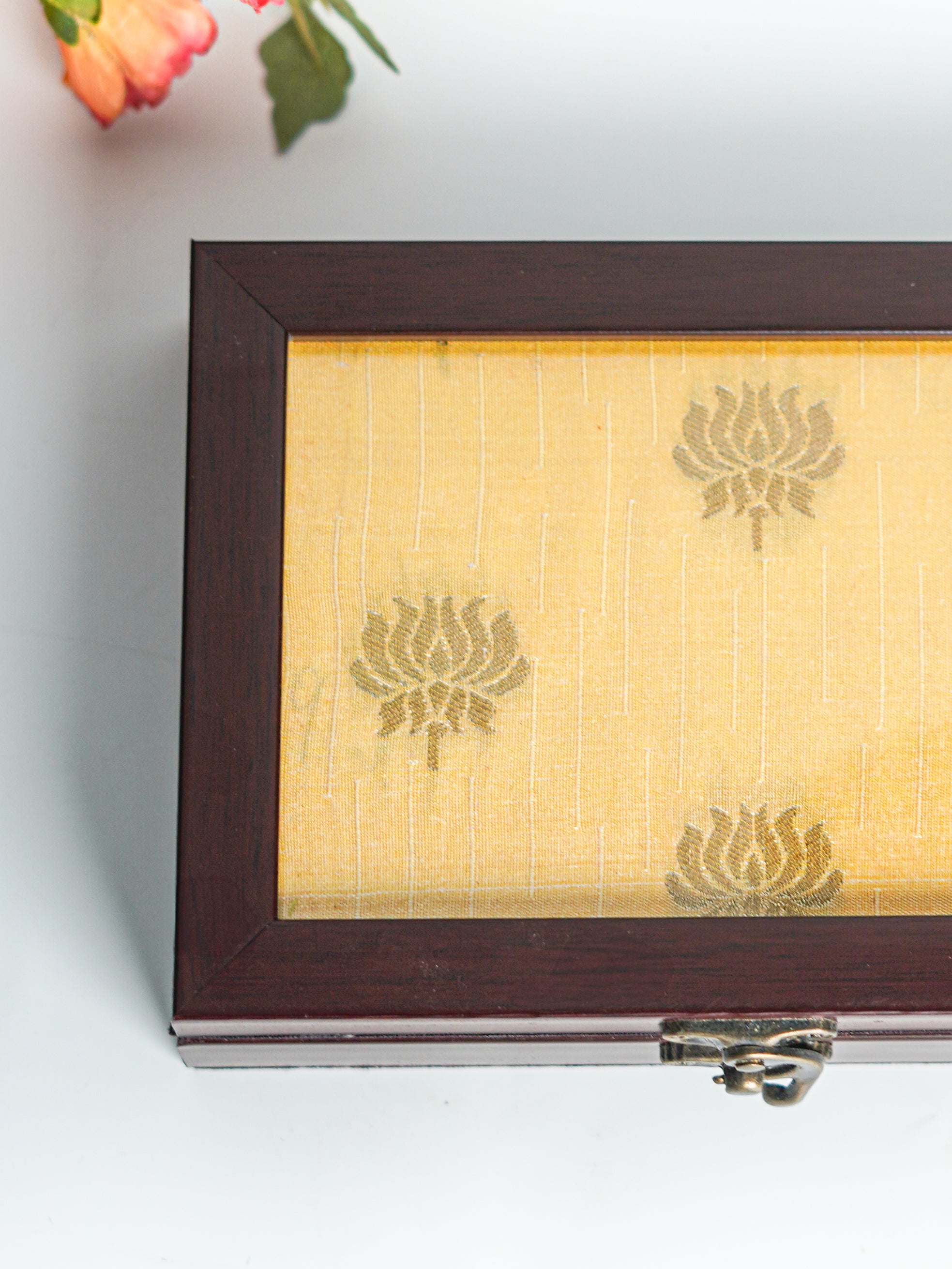 - A beautiful jewel box made out of wood, adorned with a classy raw silk cloth framed in acrylic glass on the top.