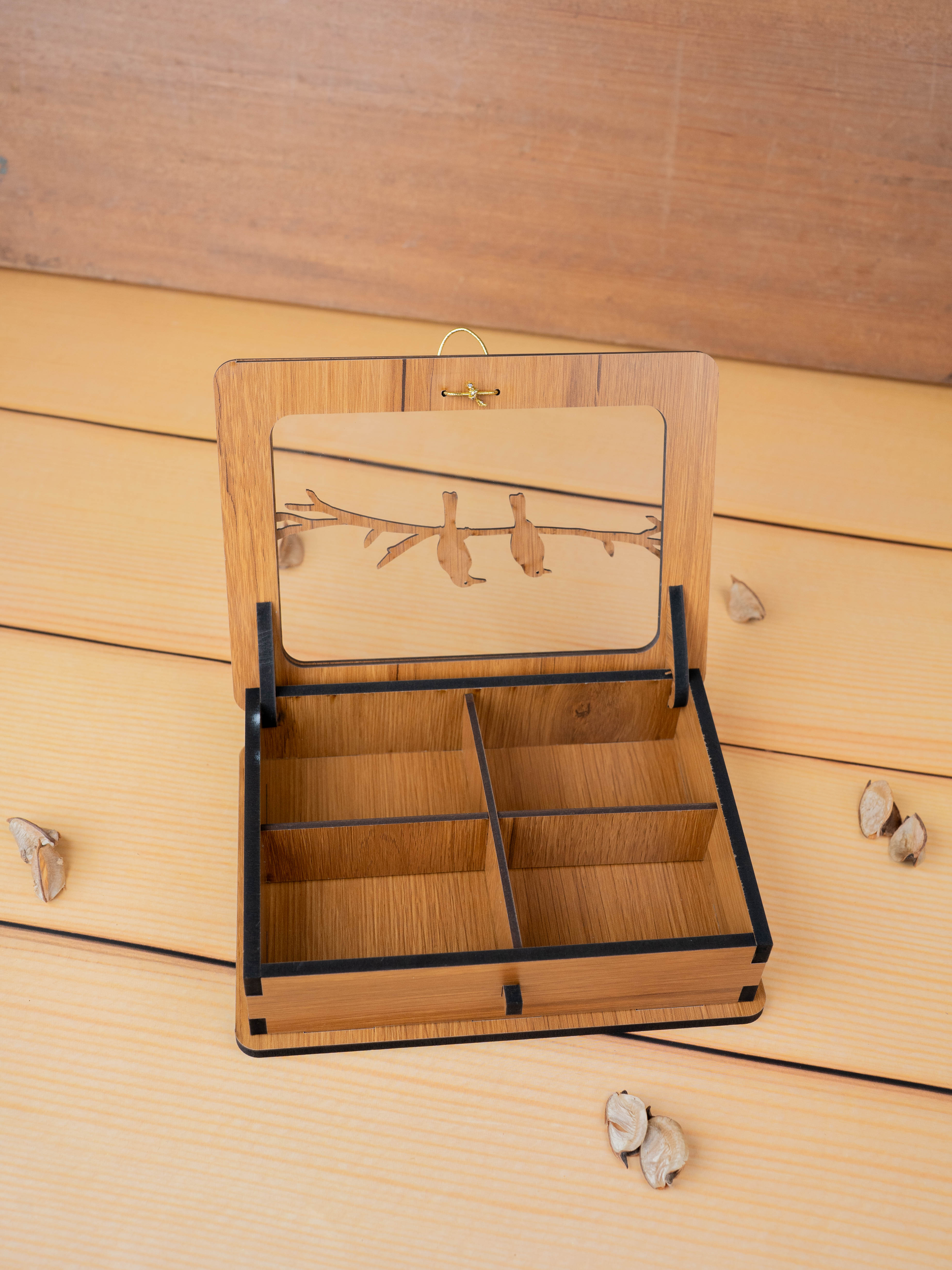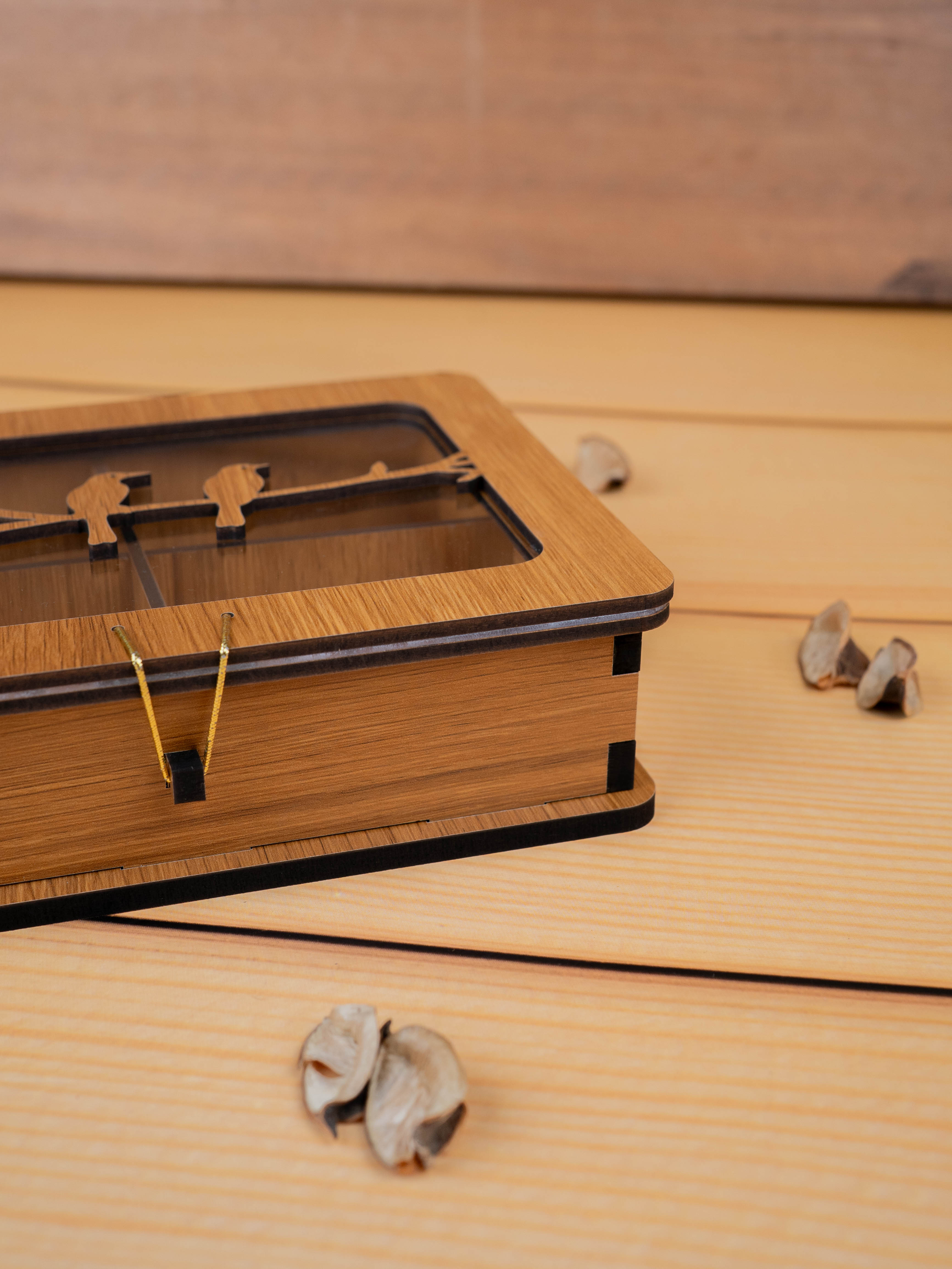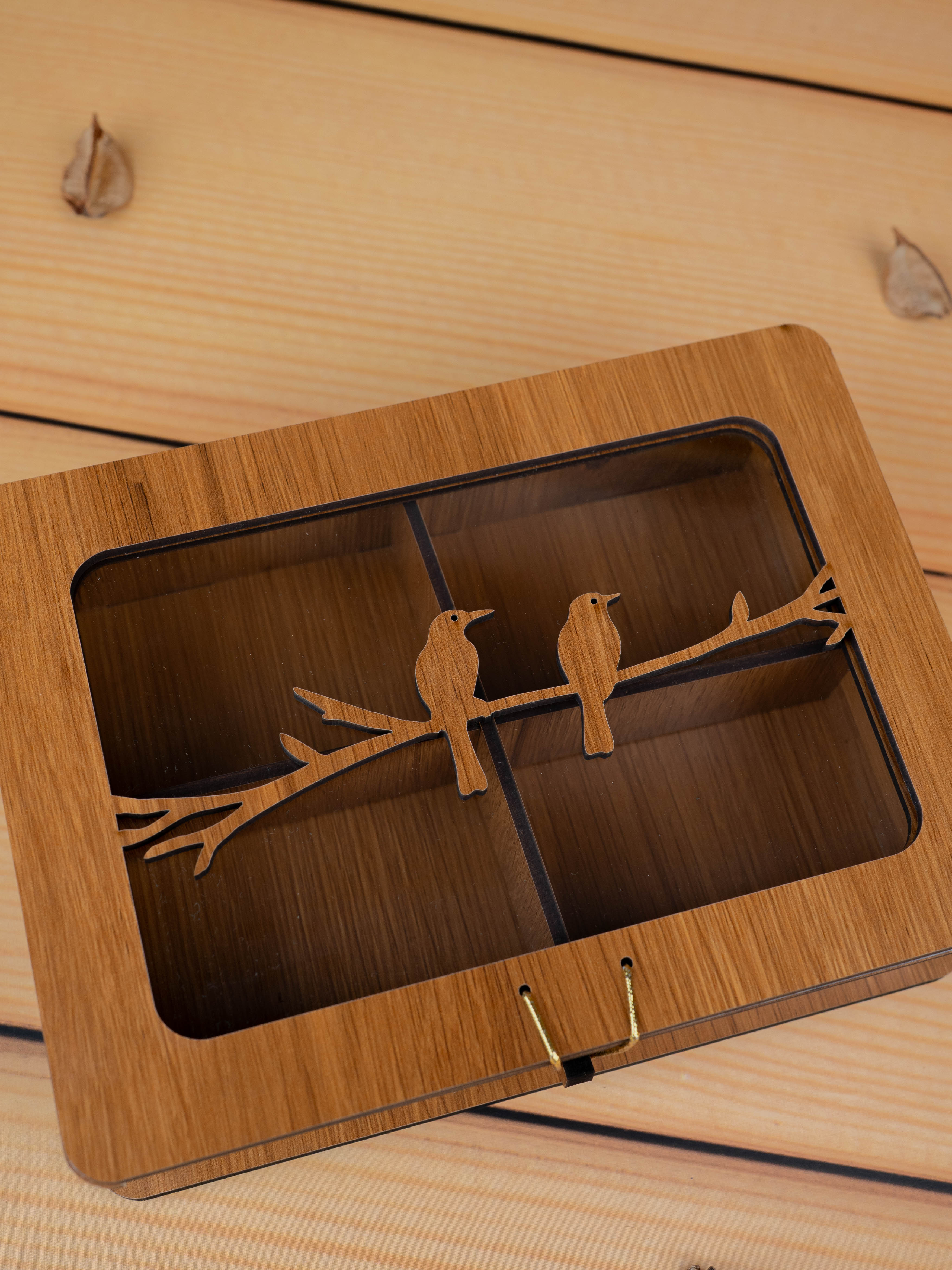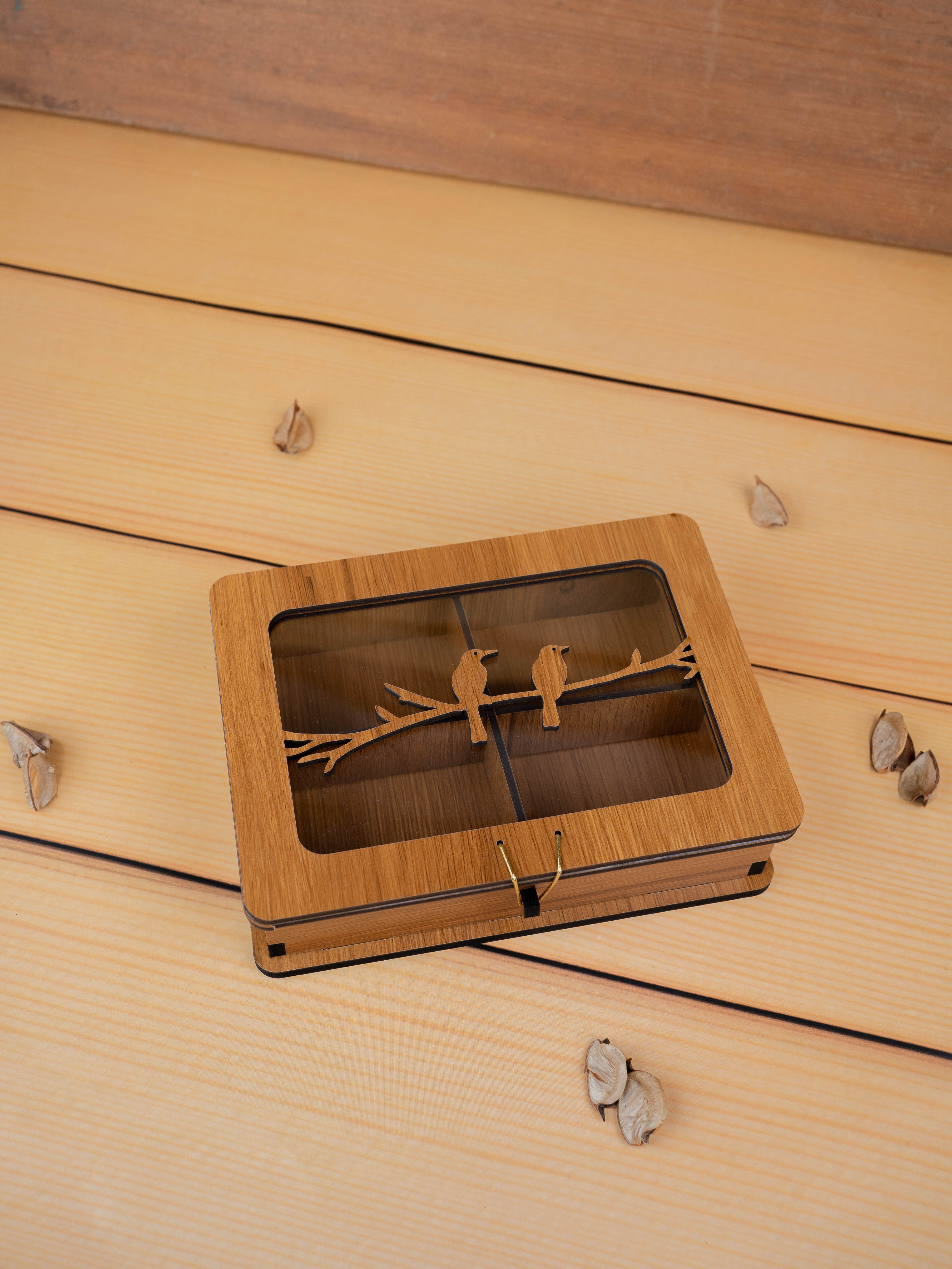 - The Lid features a Charming Laser-Cut Wooden Design of Two Birds Sitting on a Branch, which Adds a Rustic and Artistic Touch.