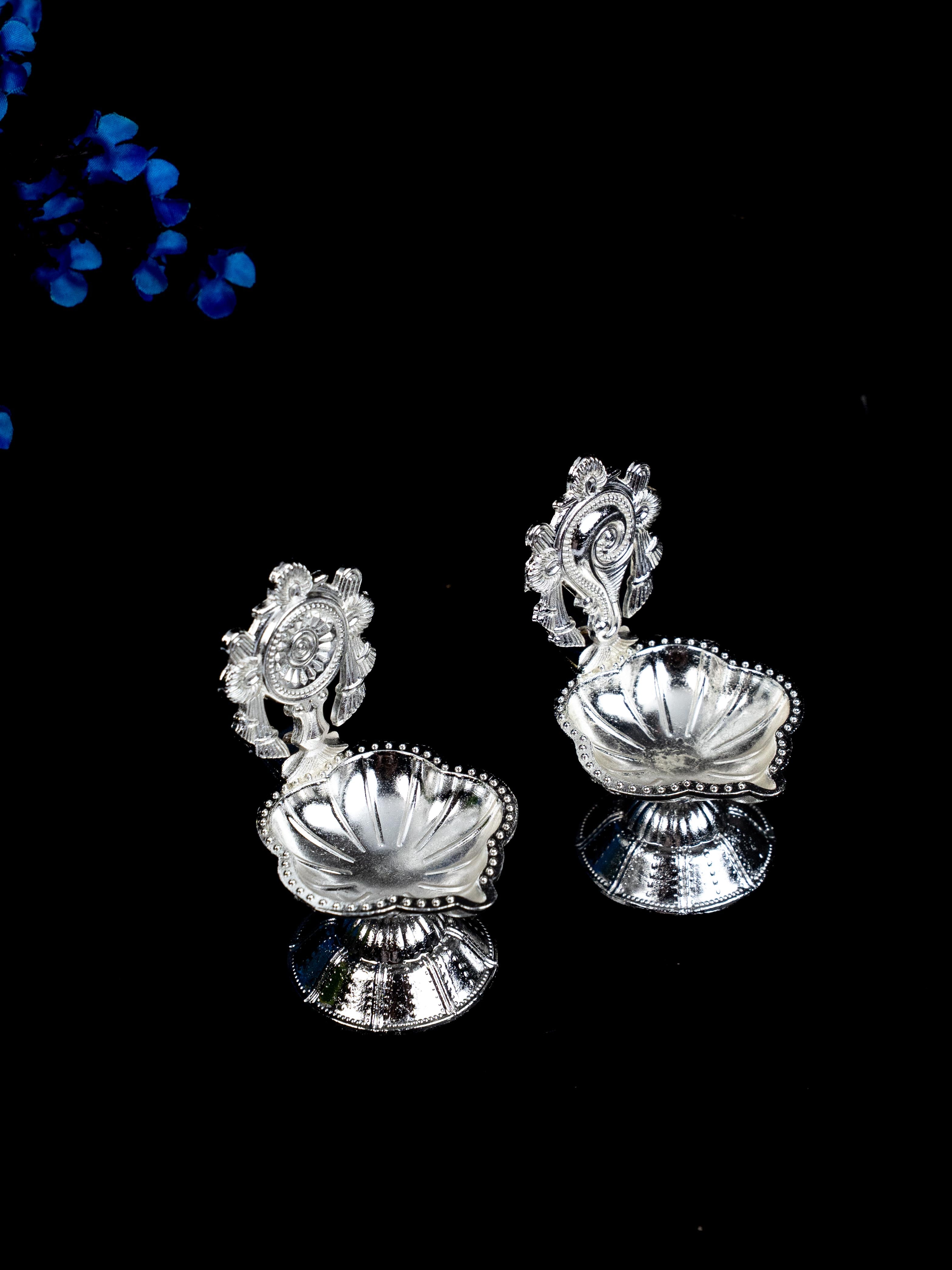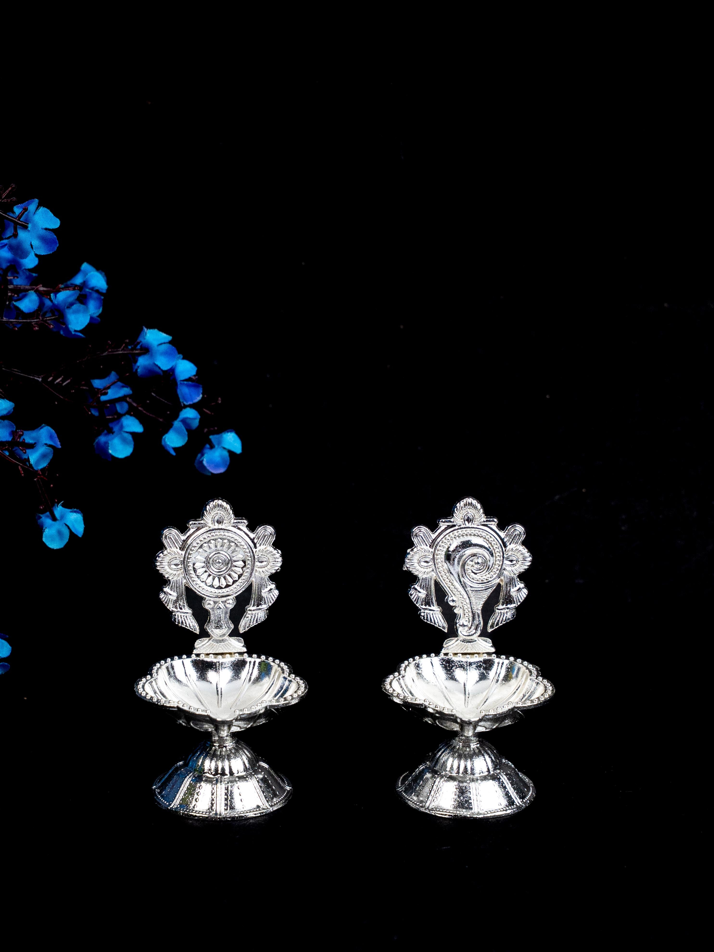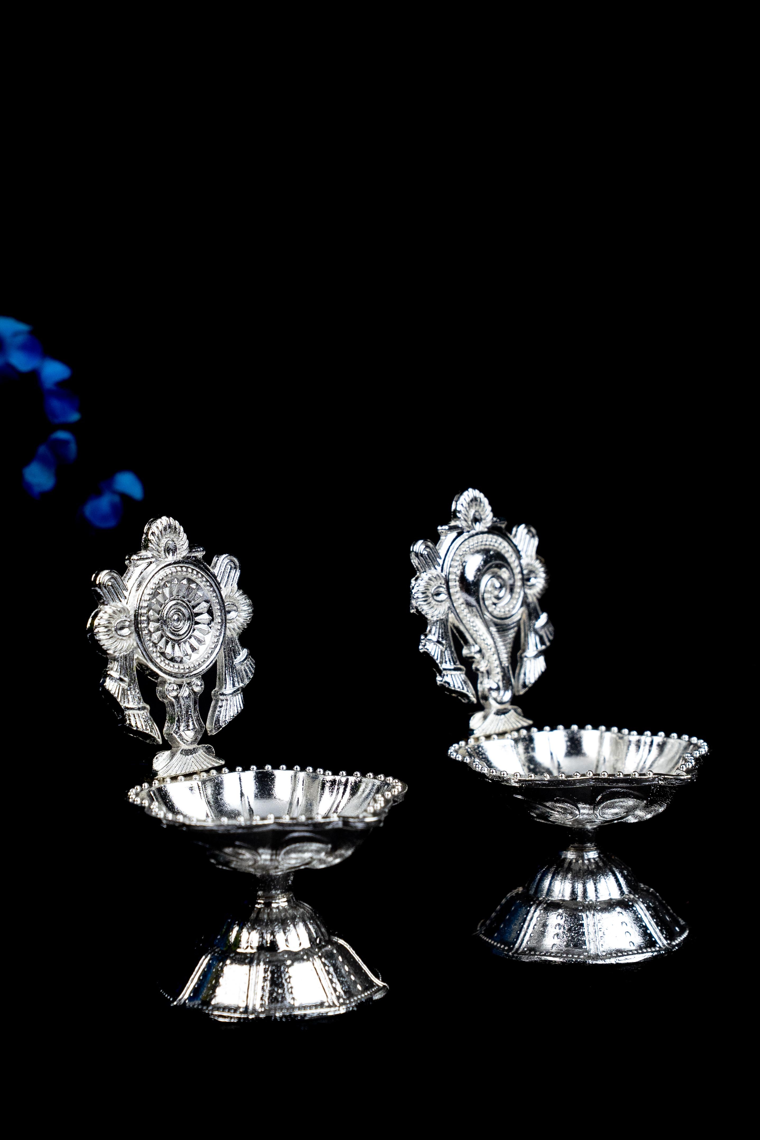 - Left Diya - Prominent Chakra (disc) Design, Representing the Sudarshana Chakra, Right Diya - Conch (shankh) design, Symbolizing Auspicious Beginnings & Purity.